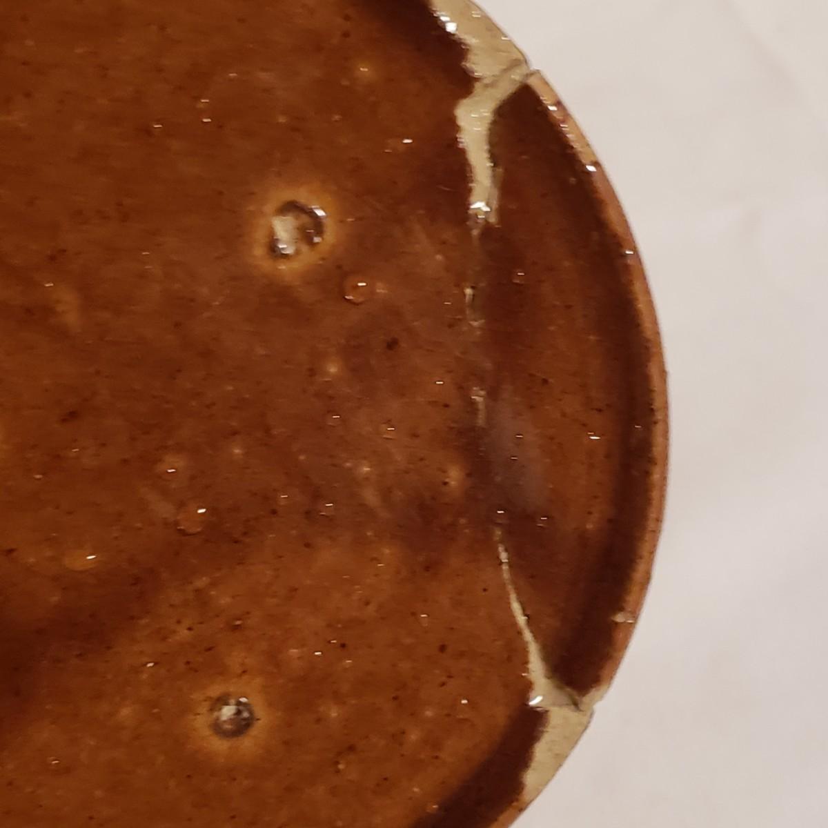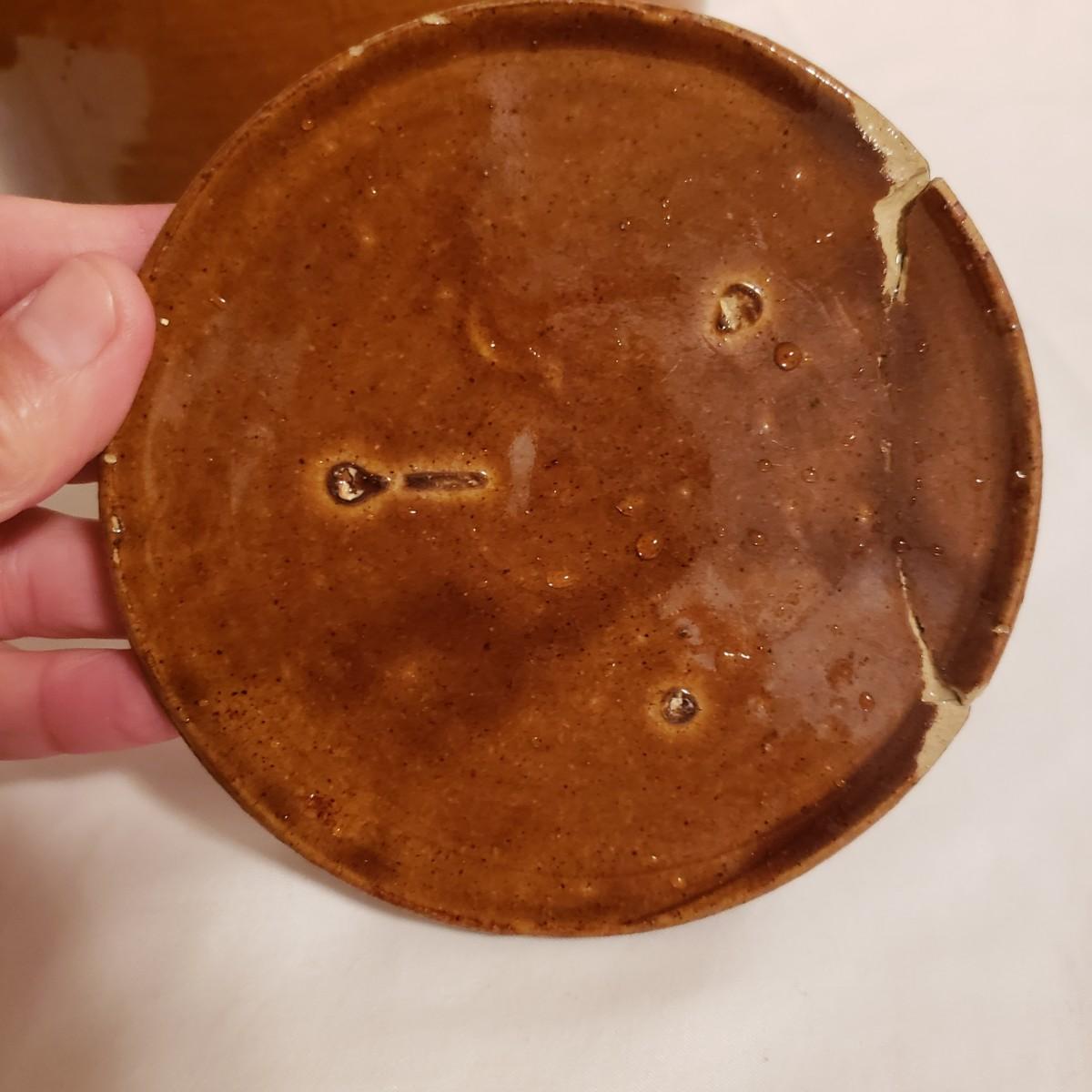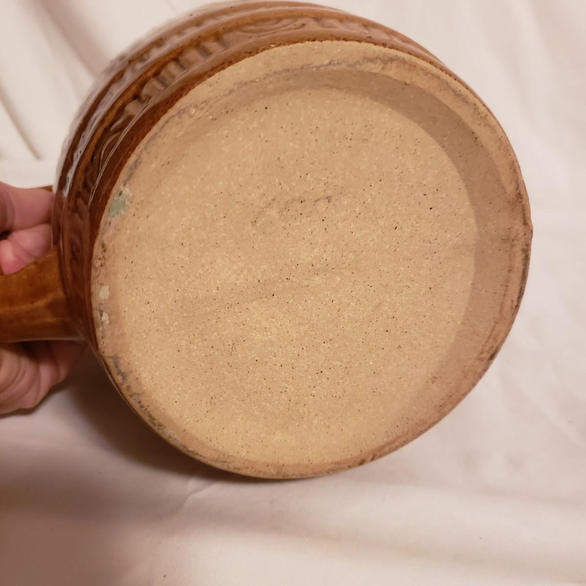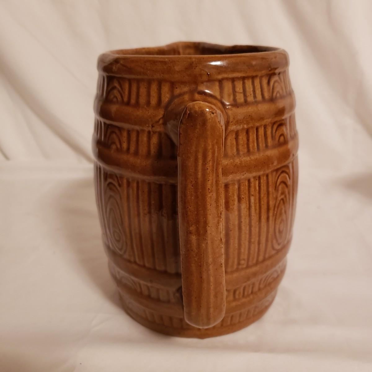 This three piece stoneware lot features a stamped #3 crock with a lid and two pitchers. The bark like barrel pitcher is a possible McCoy based on research. This stout, heavy pitcher measures 8.5" x 5" x 8"H. The smaller pitcher appears to be blemish free and has some markings on the bottom, see picture. The #3 crock is adorable! It is heavy to the touch. The lid unfortunately has a crack, which is slightly camouflaged from the top view, yet visible on the reverse side. Box is a photo prop and not included in the lot.