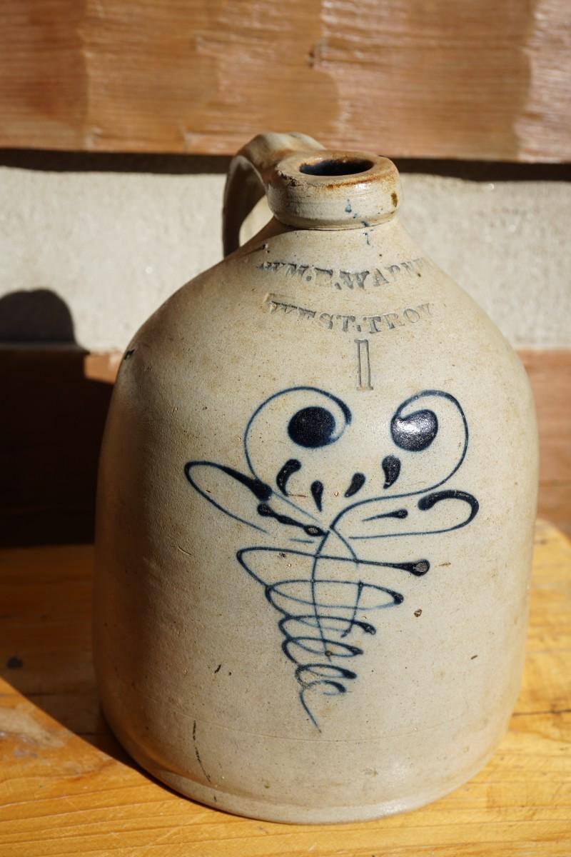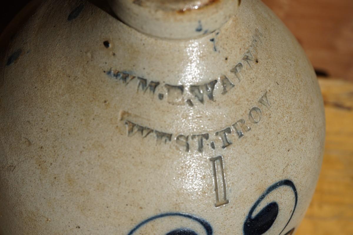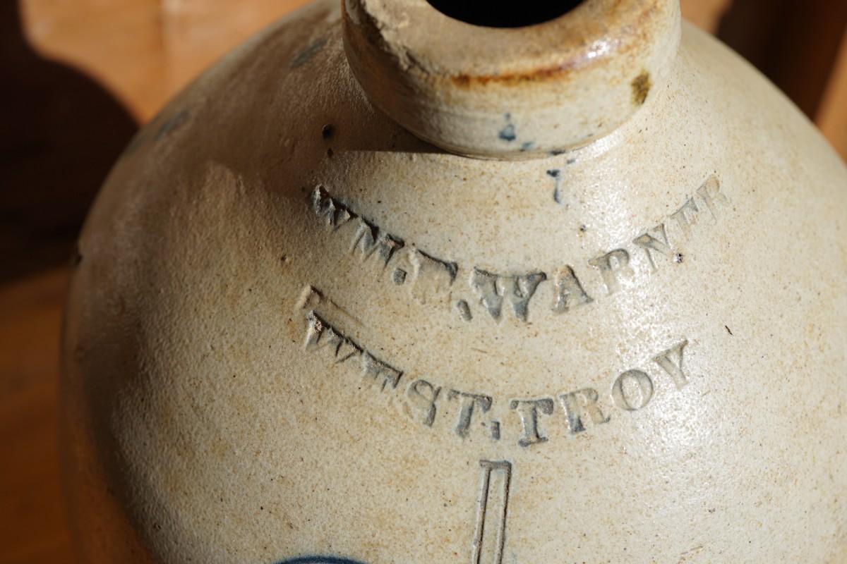 STONEWARE JUG STAMPED W.M.E WARNER WEST TROY