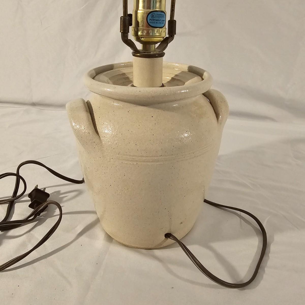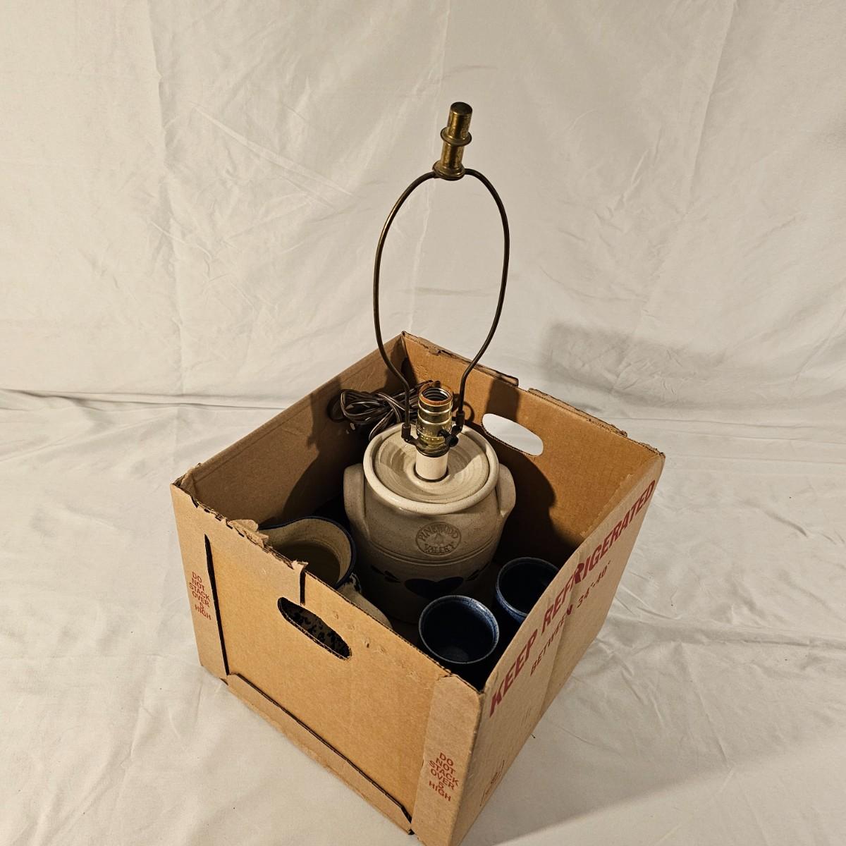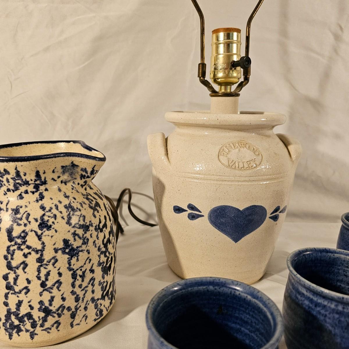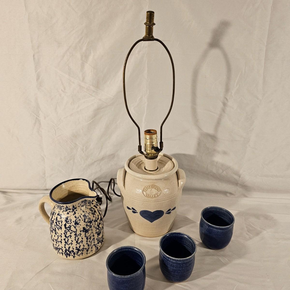 A neutral tone stoneware lamp with Pinewood Valley imprint in front. Lamp measures 7.5"D x 21"H, powered on when plugged in, has 3-way switch. Also small pitcher and three cups. Pitcher is 5" x 7" x 6.5"H. See photos for details. Shipping available.