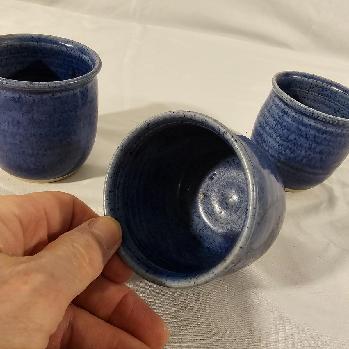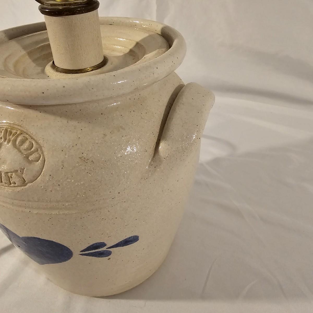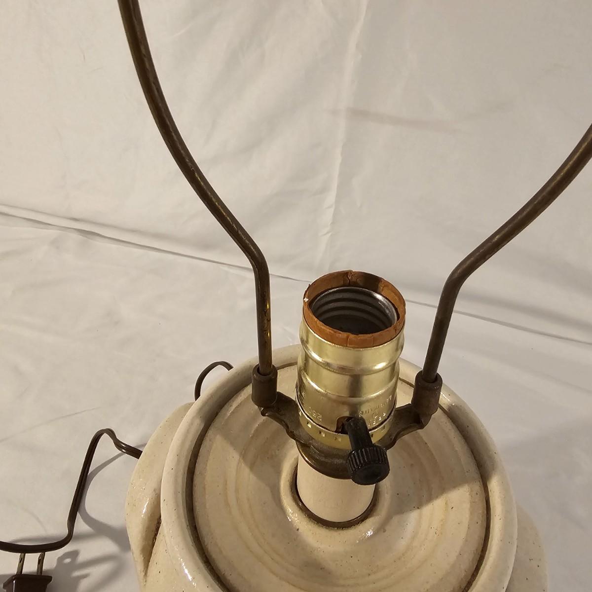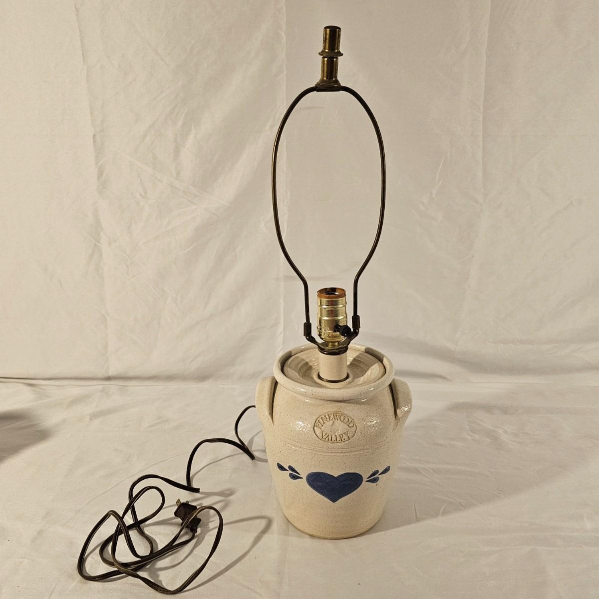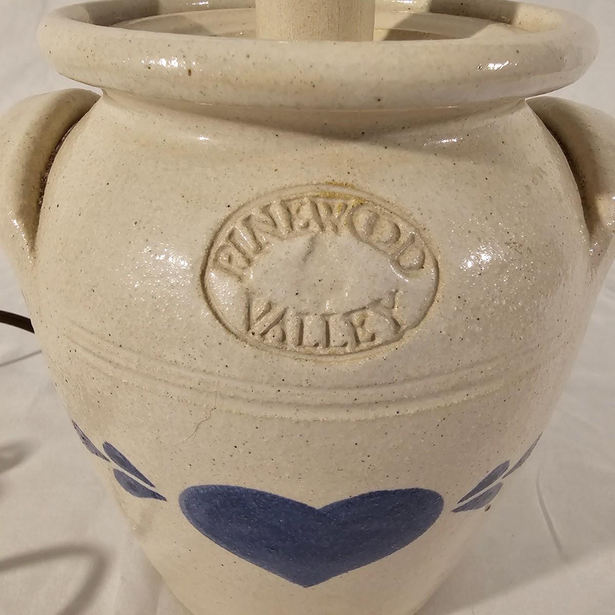 A neutral tone stoneware lamp with Pinewood Valley imprint in front. Lamp measures 7.5"D x 21"H, powered on when plugged in, has 3-way switch. Also small pitcher and three cups. Pitcher is 5" x 7" x 6.5"H. See photos for details. Shipping available.
