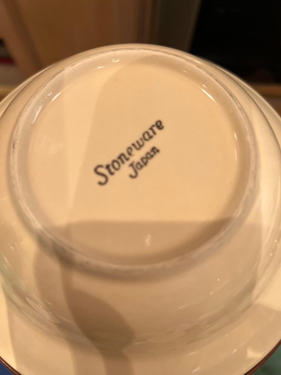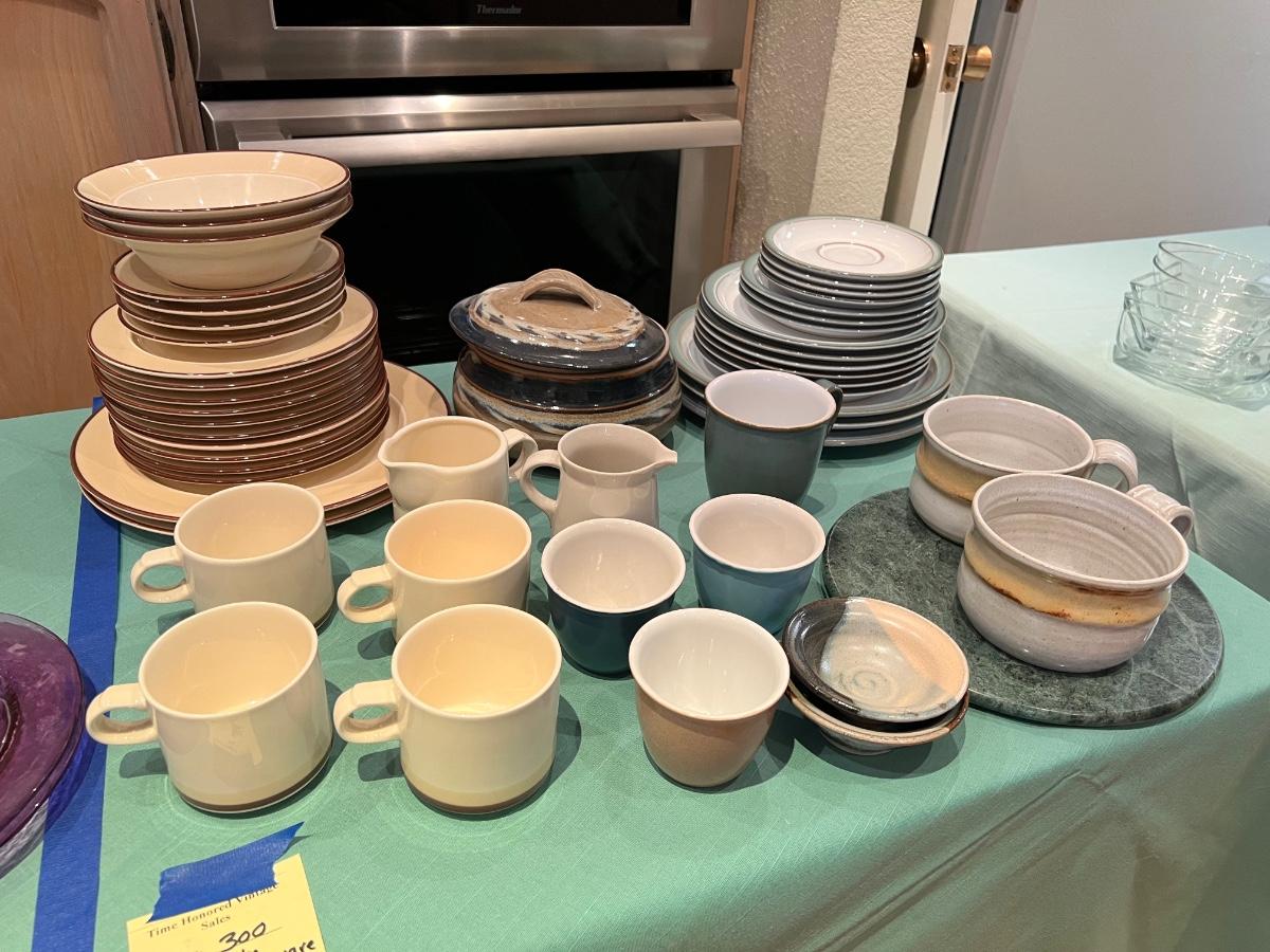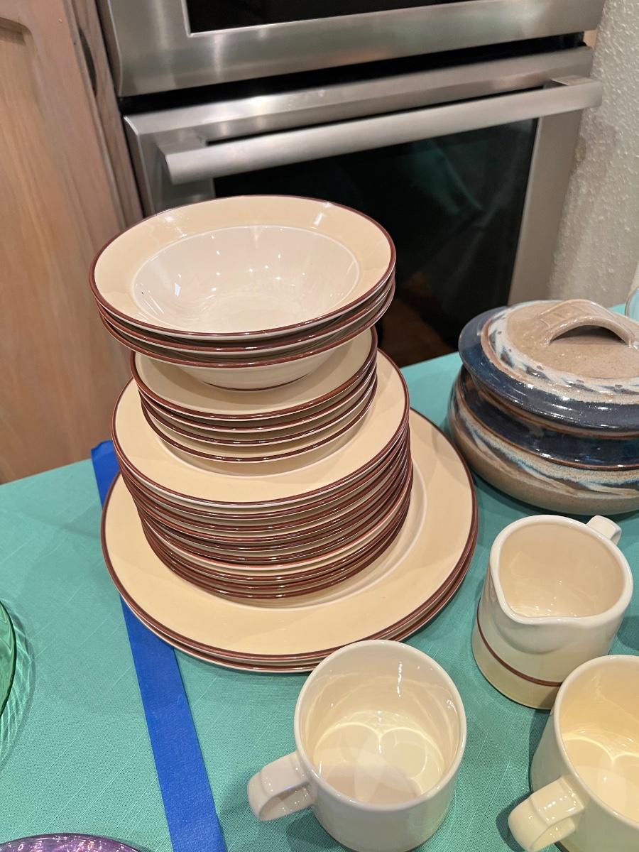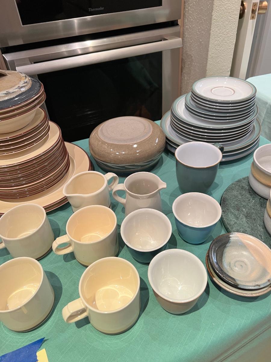 Two sets of Stoneware pottery one set of Denny of United Kingdom and one set brown with a brown rim made in Japan the brown set has one salad plate with a chip on the side. Also a set of cups matching and a beautiful stoneware casserole dish and two small pitchers