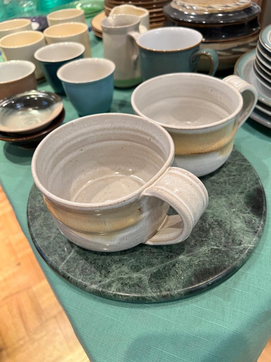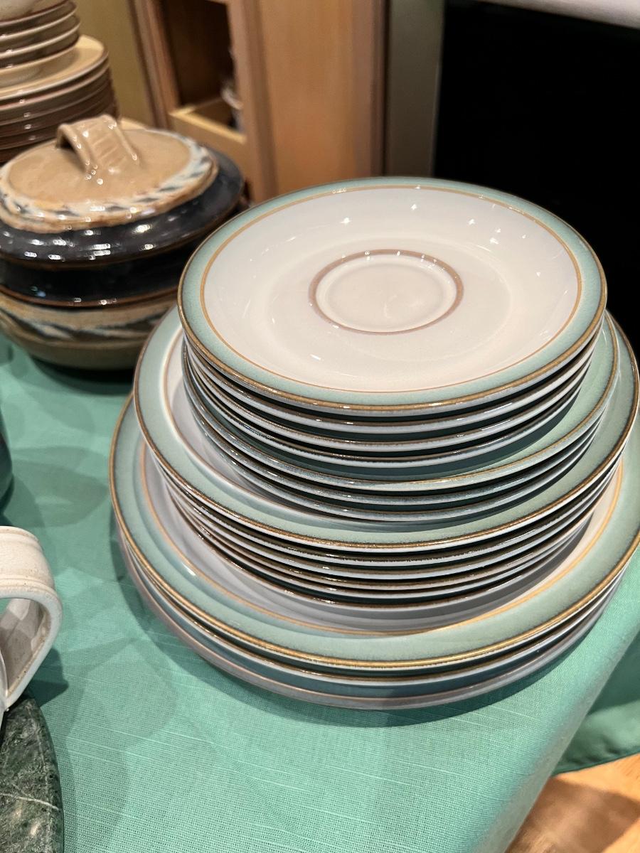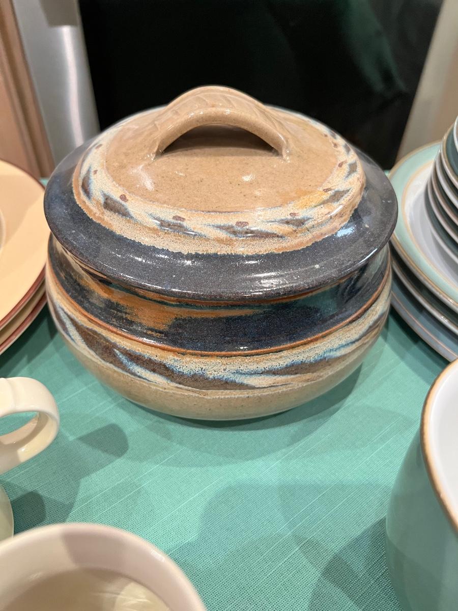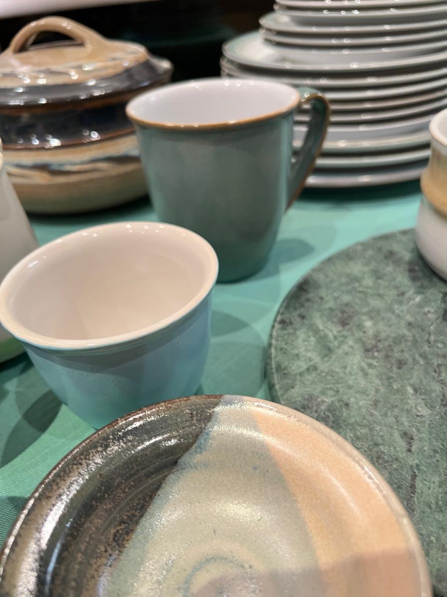 Two sets of Stoneware pottery one set of Denny of United Kingdom and one set brown with a brown rim made in Japan the brown set has one salad plate with a chip on the side. Also a set of cups matching and a beautiful stoneware casserole dish and two small pitchers
