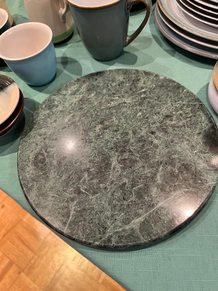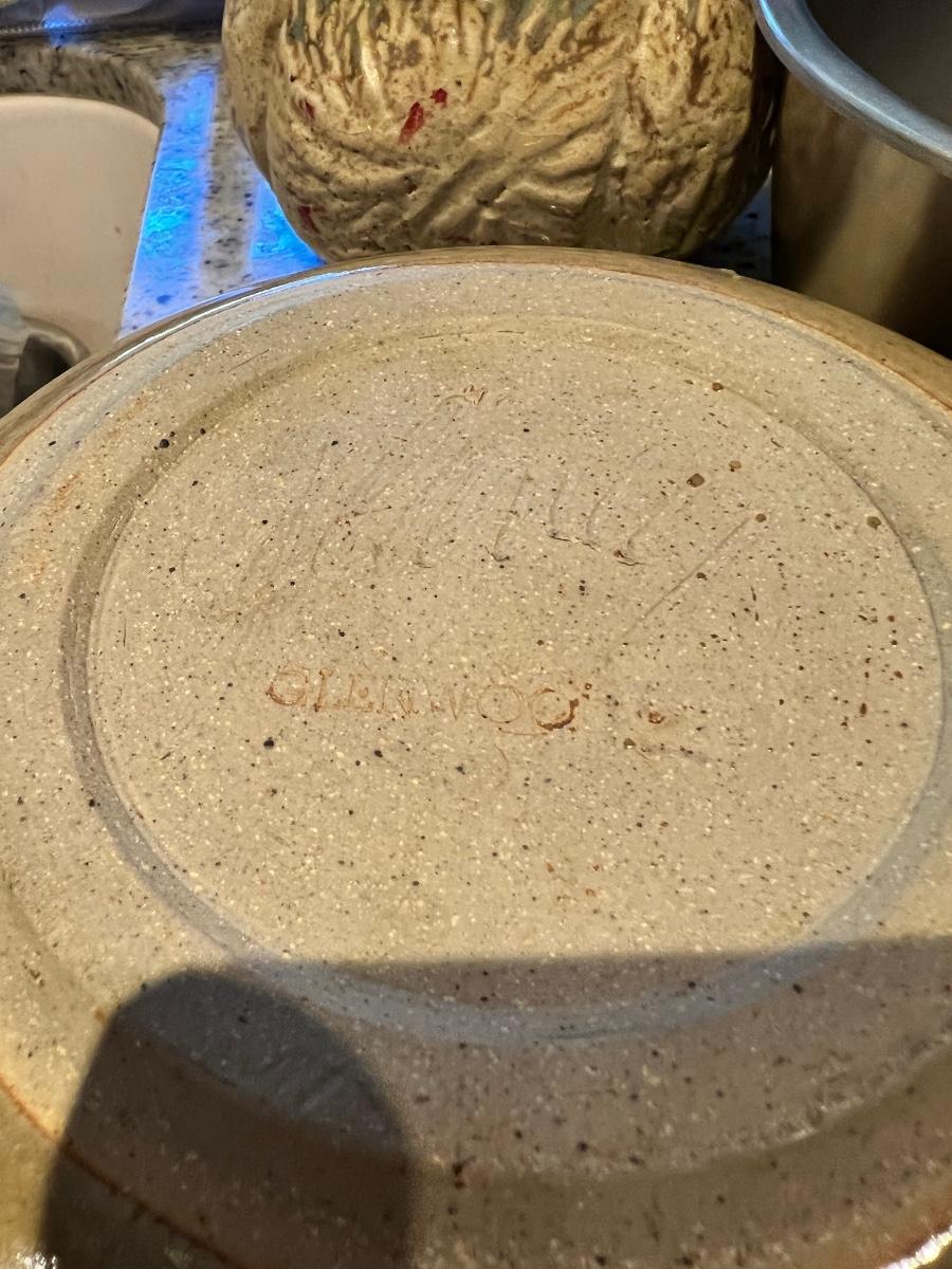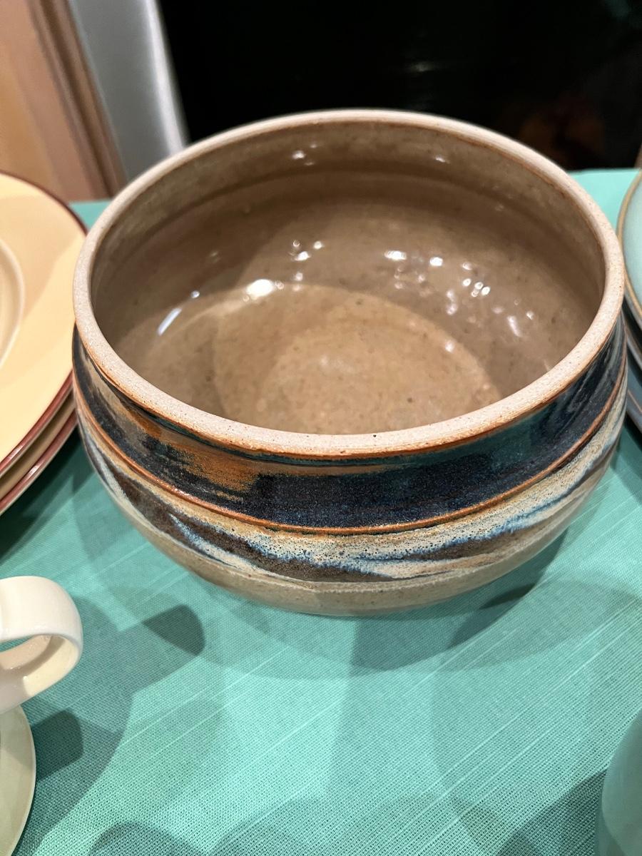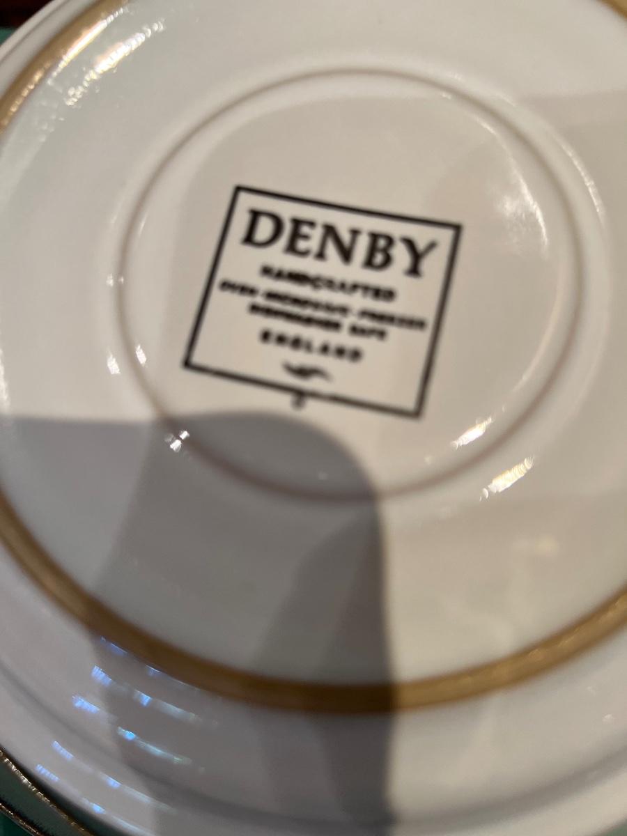 Two sets of Stoneware pottery one set of Denny of United Kingdom and one set brown with a brown rim made in Japan the brown set has one salad plate with a chip on the side. Also a set of cups matching and a beautiful stoneware casserole dish and two small pitchers