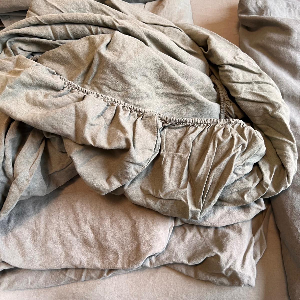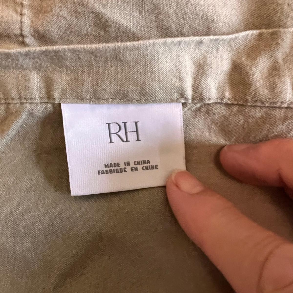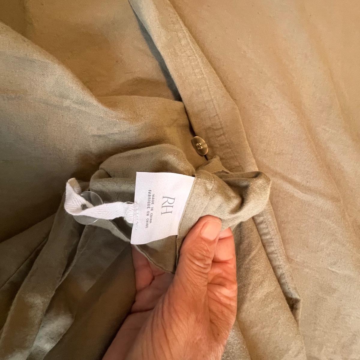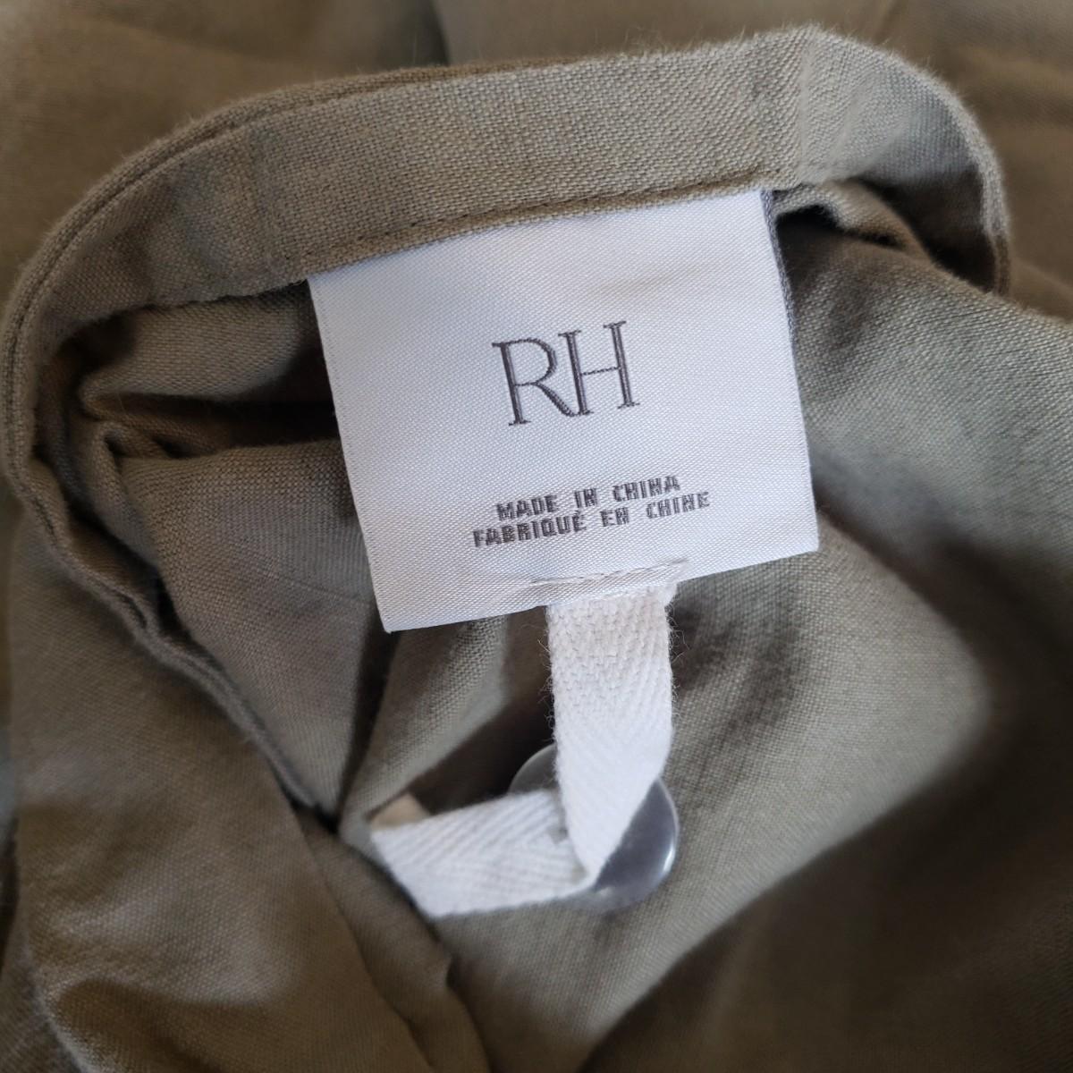 Large lot of queen sized RH bedding includes two duvet covers, six pillowcases, two fitted and three flat sheets. All are a khaki color and cotton and/or a cotton and linen blend. A sumptuous Claritin duvet completes this quality bedding lot. Everything is queen sized and there are some slight variations in color due to washing. Bed not included but is available in another lot in this sale.
