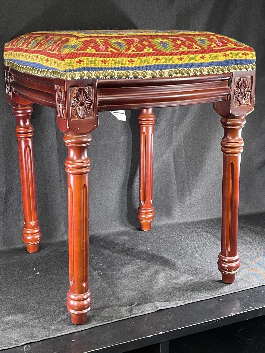 Stool, wood legs, upholstered top with tapestry panel, rivet trim. Measures 20” high x 16” wide x 15” deep. The legs have a couple of very small dings here and there.