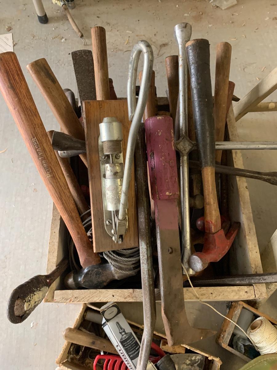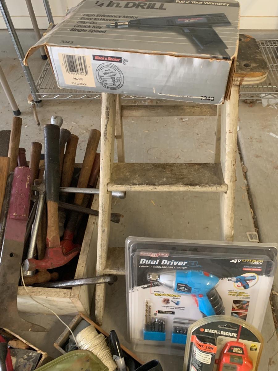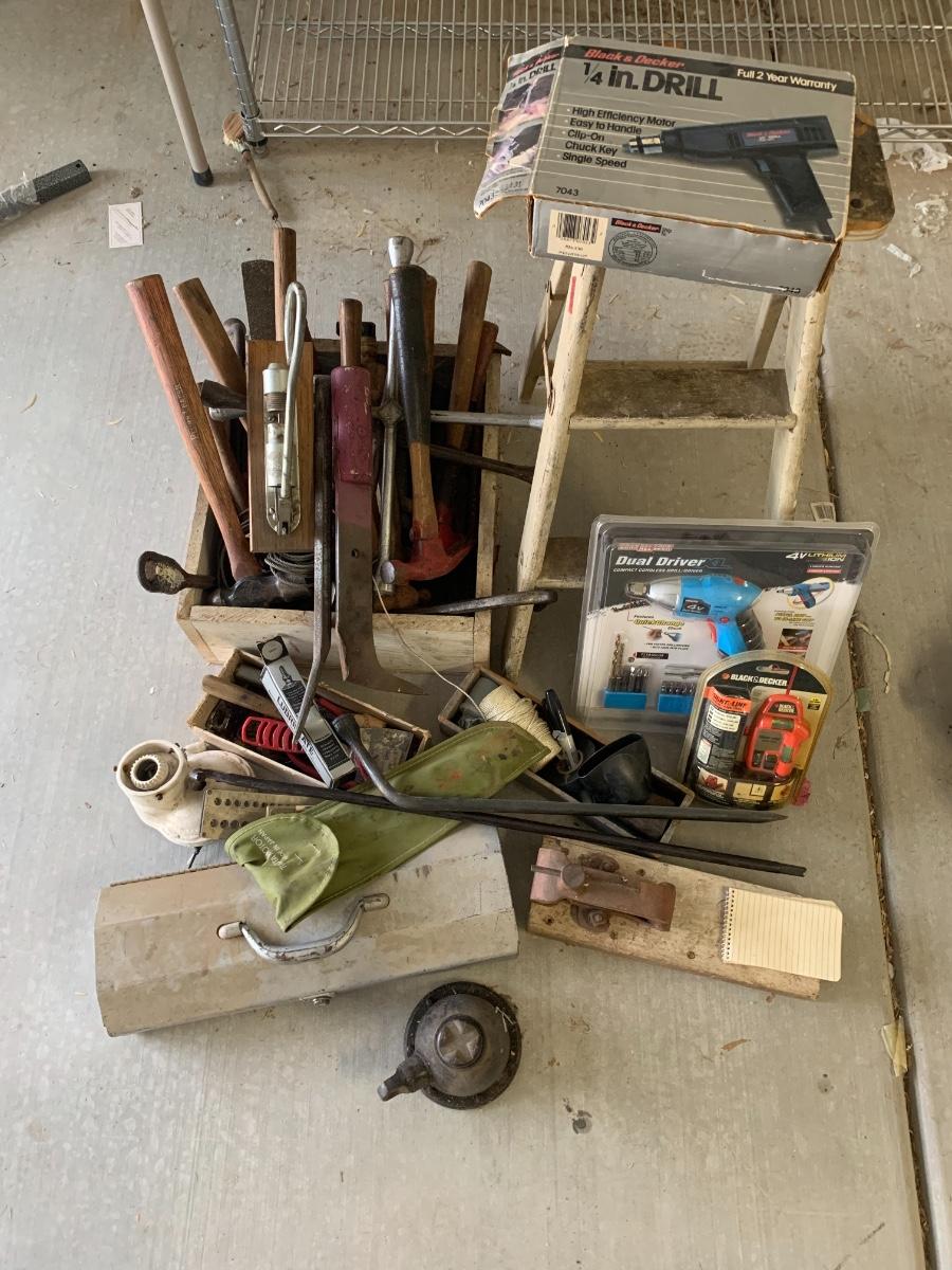 Lot includes a small wood step stool and a pile of tools, some vintage, some more modern.