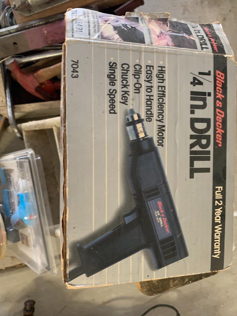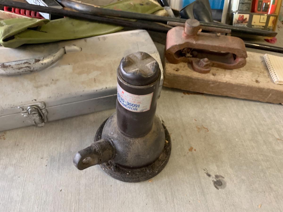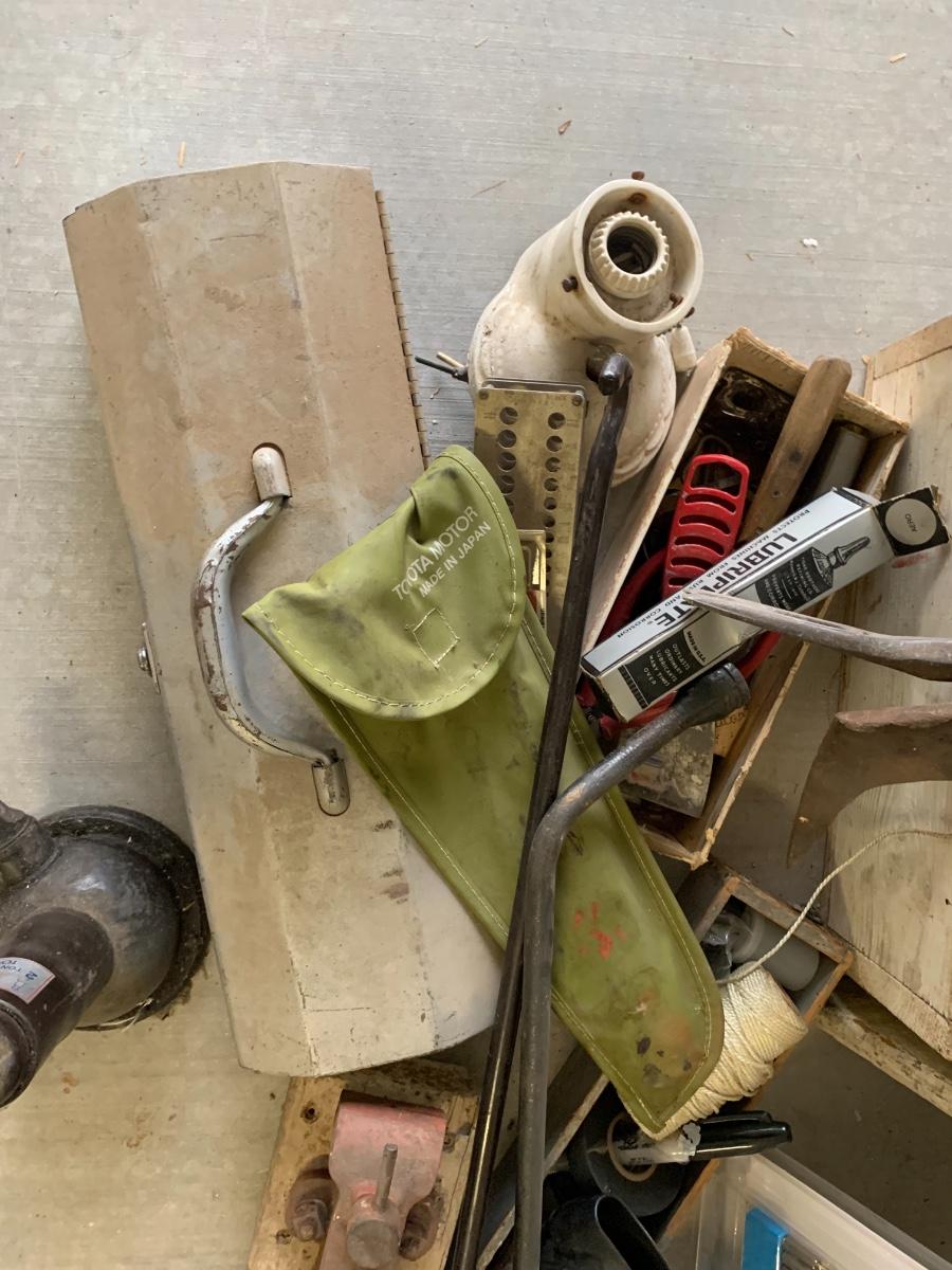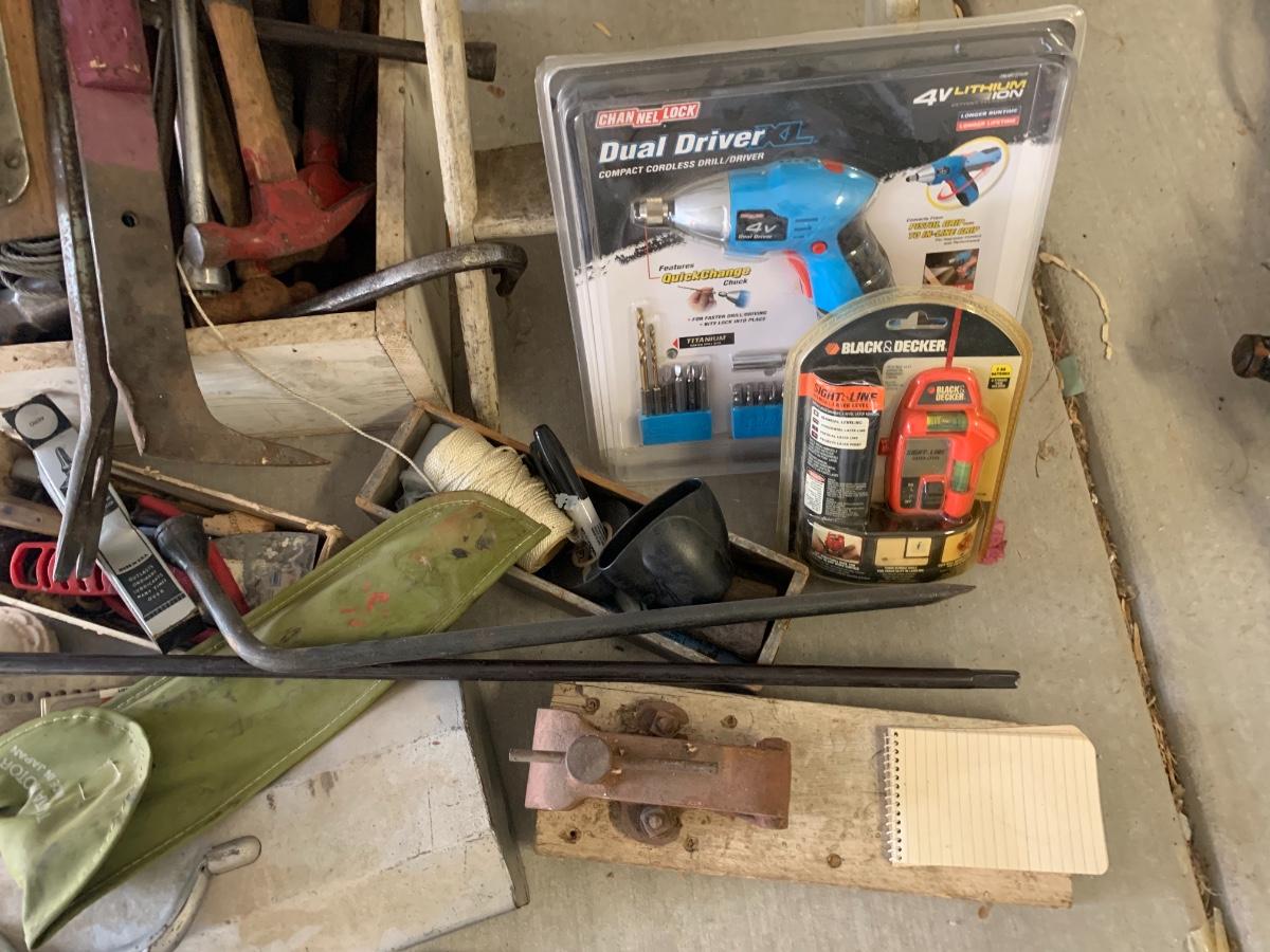 Lot includes a small wood step stool and a pile of tools, some vintage, some more modern.