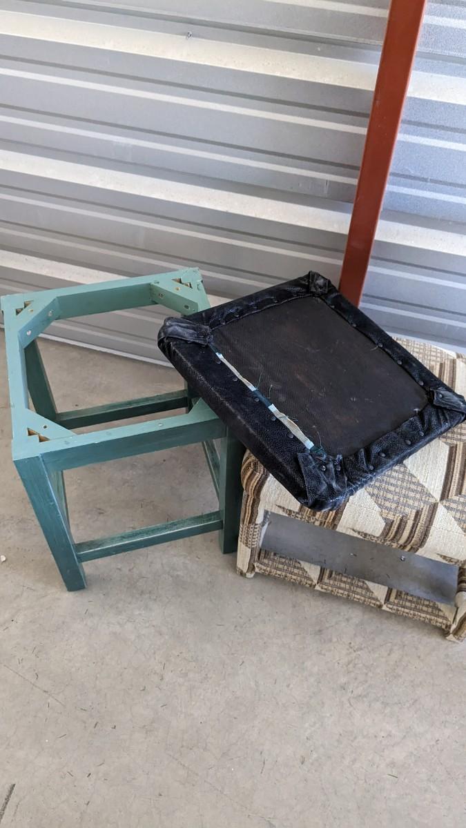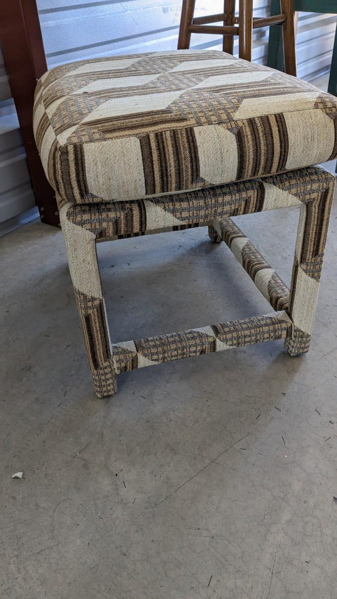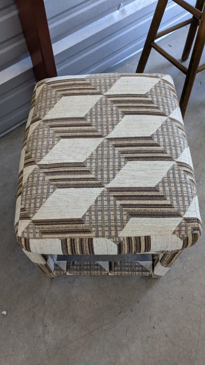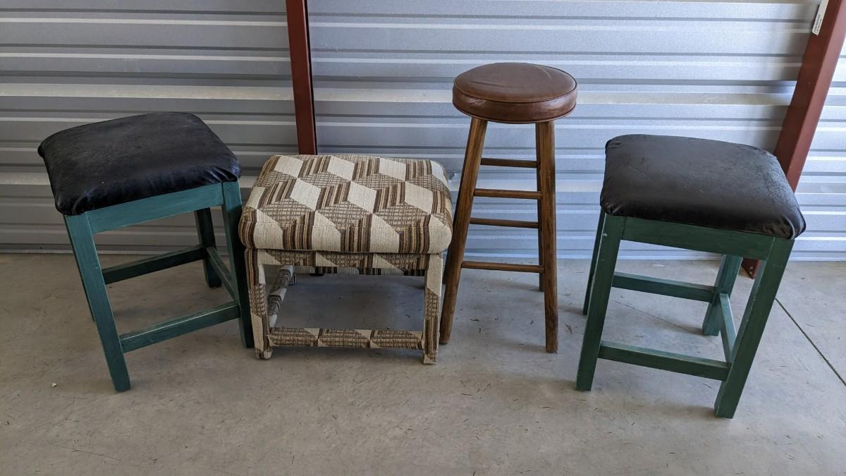 Includes (2) 15.75"x15.75"x 24" mated stools, one of the tops needs to be reattached. 18"x21"x19" upholstered ottoman/stool with great geometric fabric, some pilling noted, and a vintage 30" bar stool. Note: all pieces show wear but are in good useable condition with great upcycle potential. No shipping. 2616