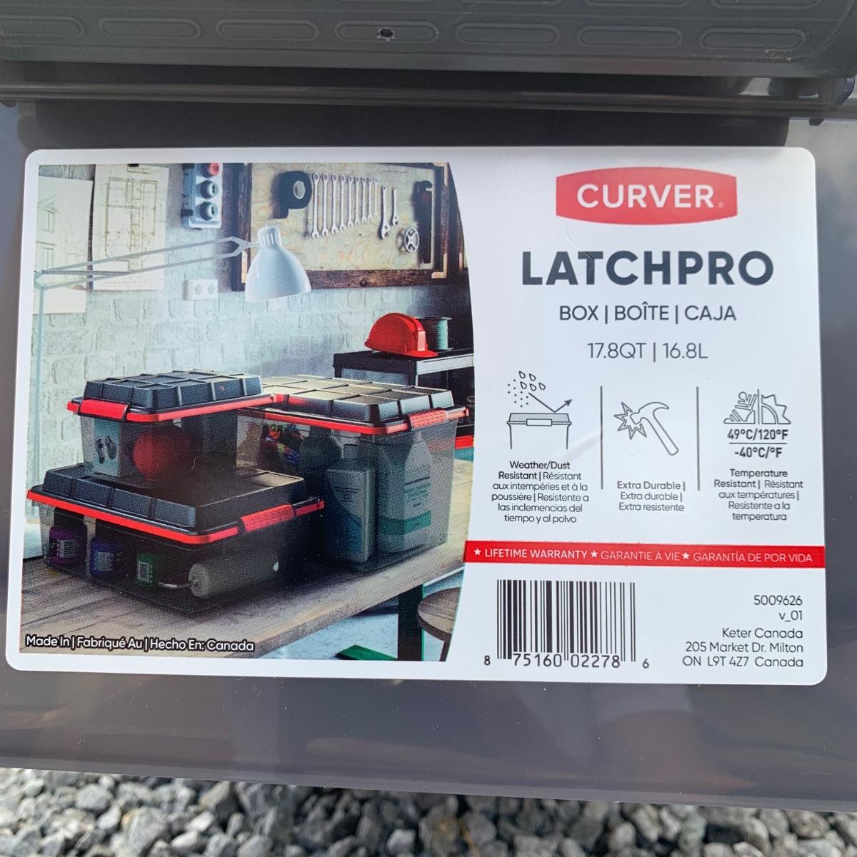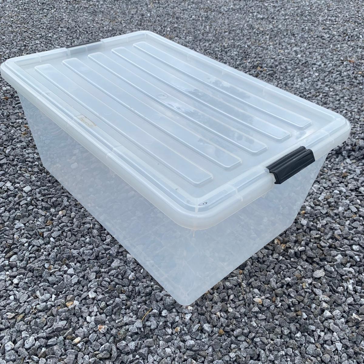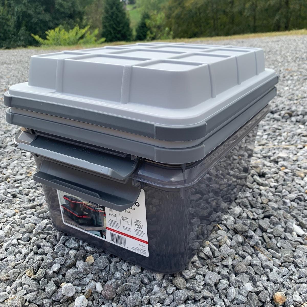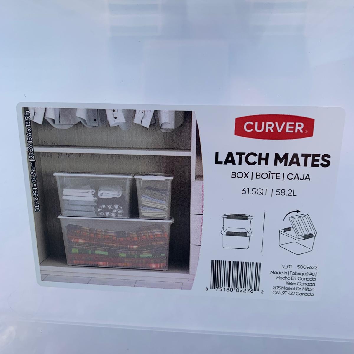 17 storage bins and a Contico storage drawer unit on casters. Each bin has a lid. Some lids latch, some pop on. Please see photos for inventory. The smallest bins are the Curver Latch Pros which are 17.8 qt. The long clear bin with the blue latches is 39” x 20” x 5.5”H.