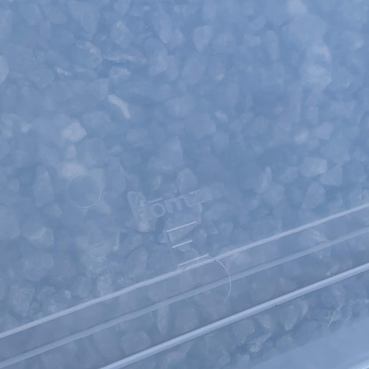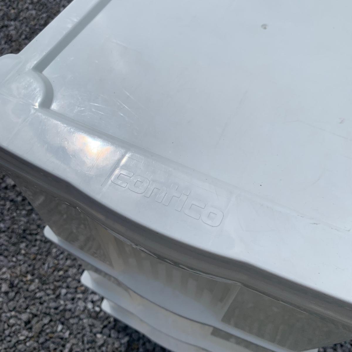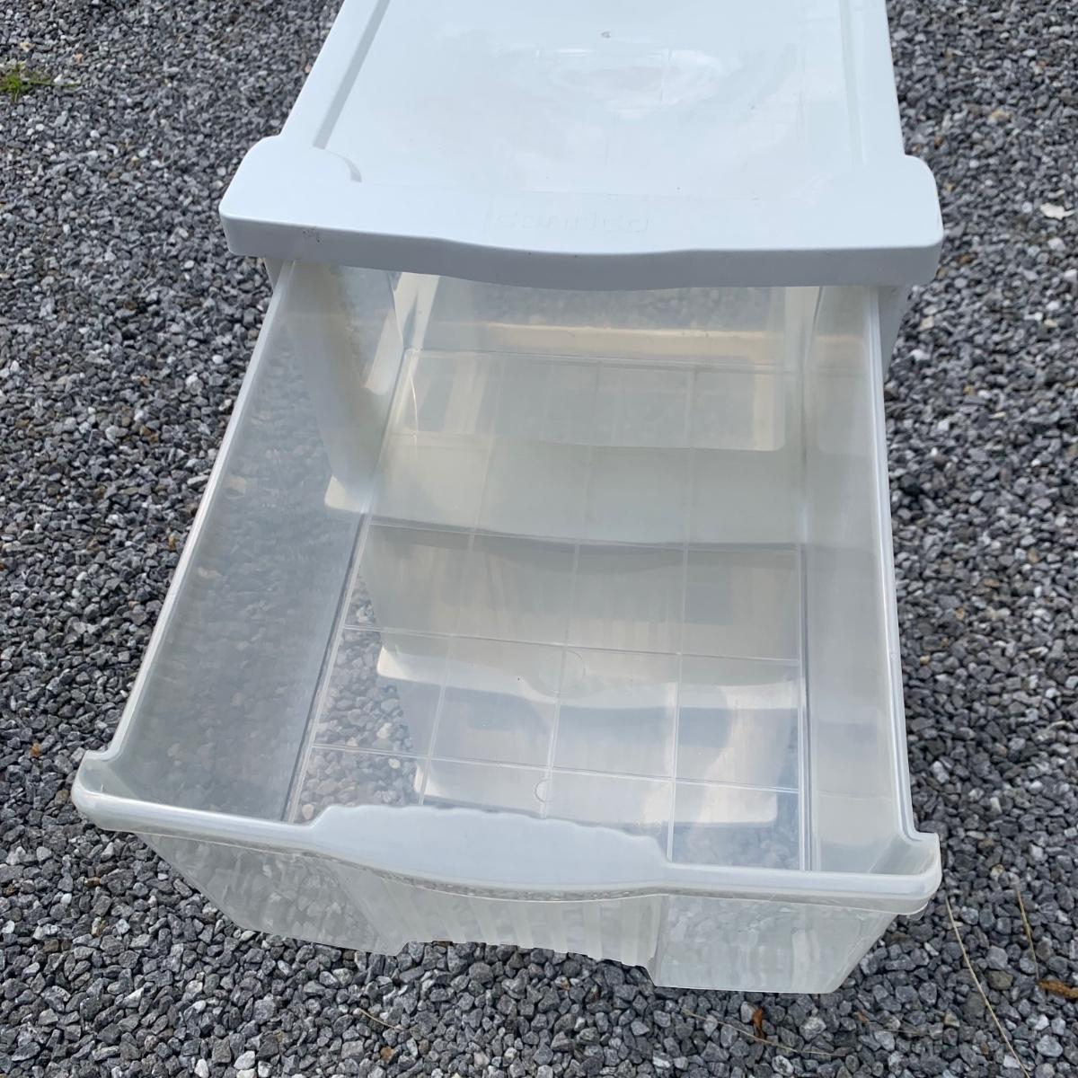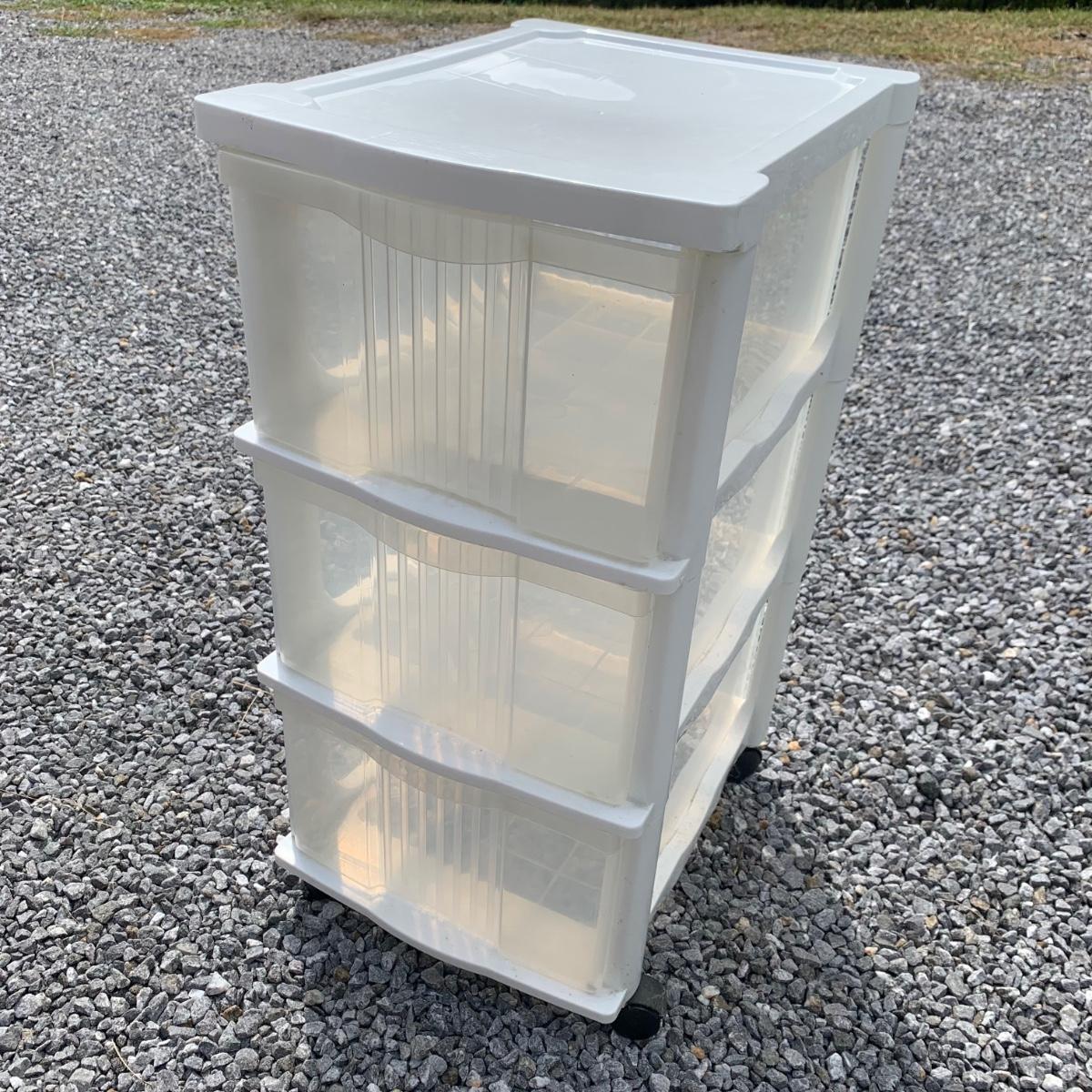 17 storage bins and a Contico storage drawer unit on casters. Each bin has a lid. Some lids latch, some pop on. Please see photos for inventory. The smallest bins are the Curver Latch Pros which are 17.8 qt. The long clear bin with the blue latches is 39” x 20” x 5.5”H.