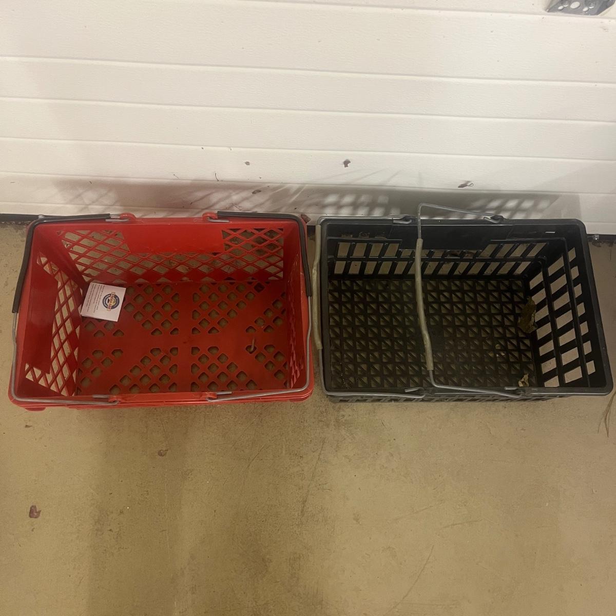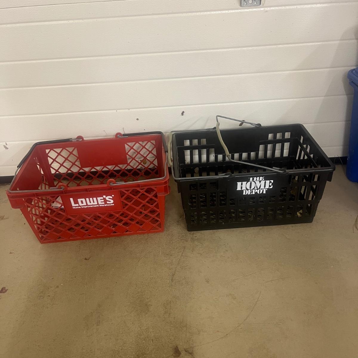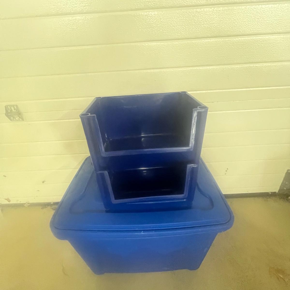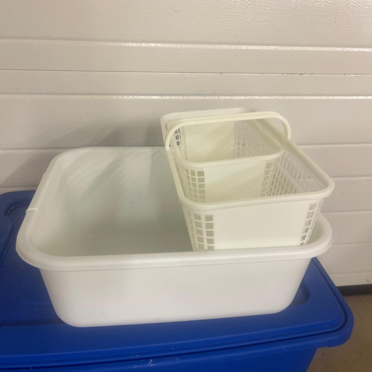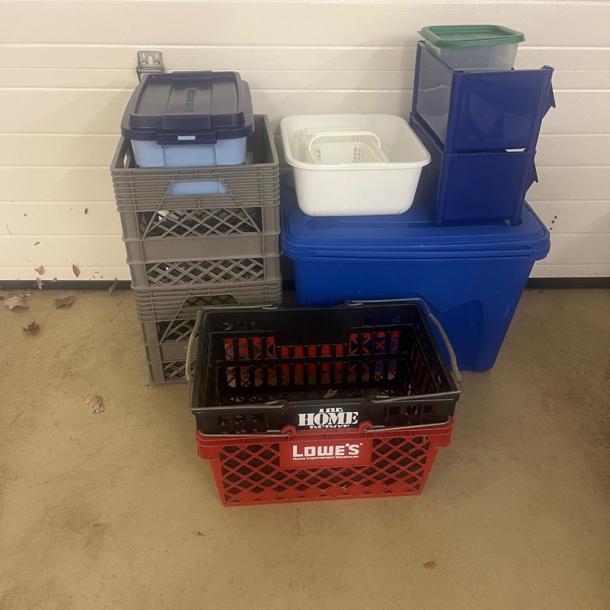 Lot Includes two baskets with handles, two crates, two storage bins with lids, two small storage bins and more. Largest bin measures 17” x 23” x 16”H.