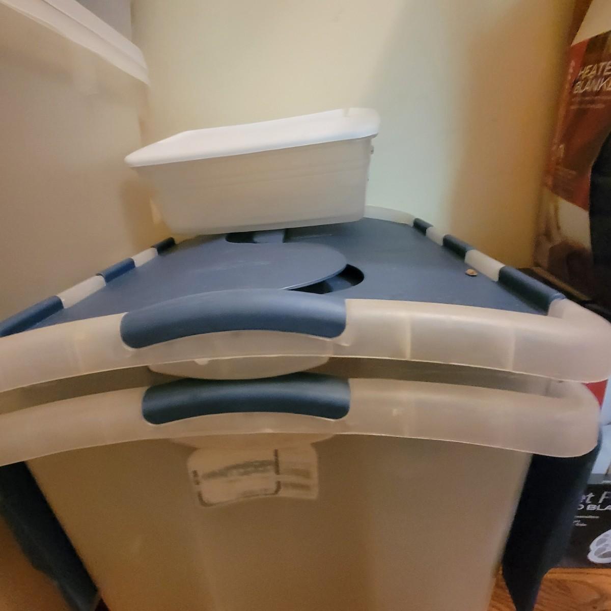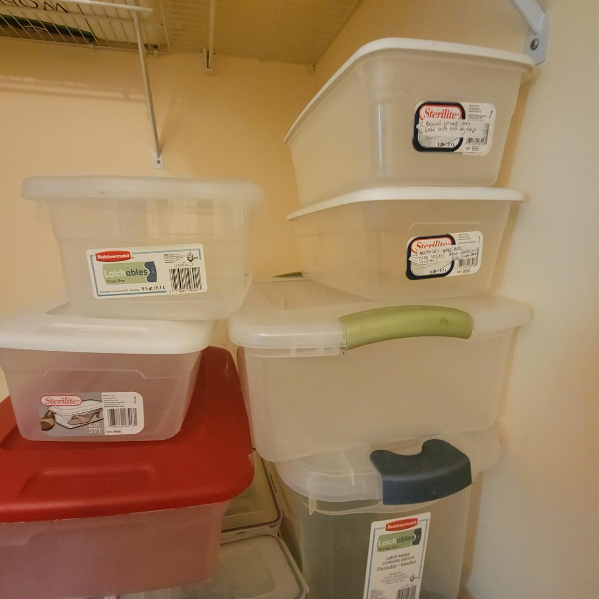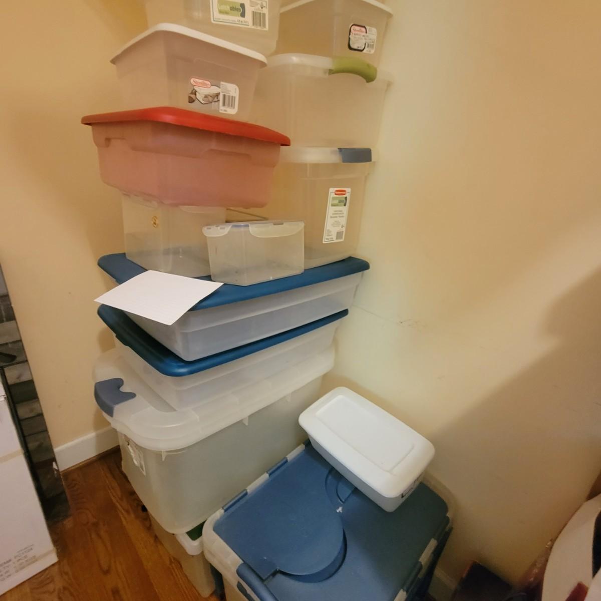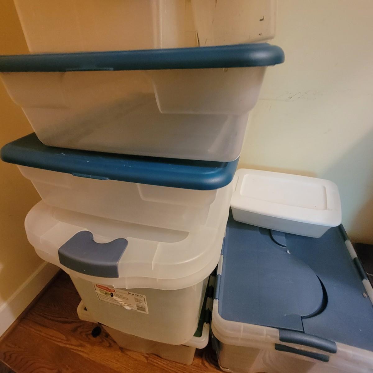 An assortment of 17 lidded storage bins. The largest is a 66qt and measures approximately 14" x 26" x 36". Local pickup only