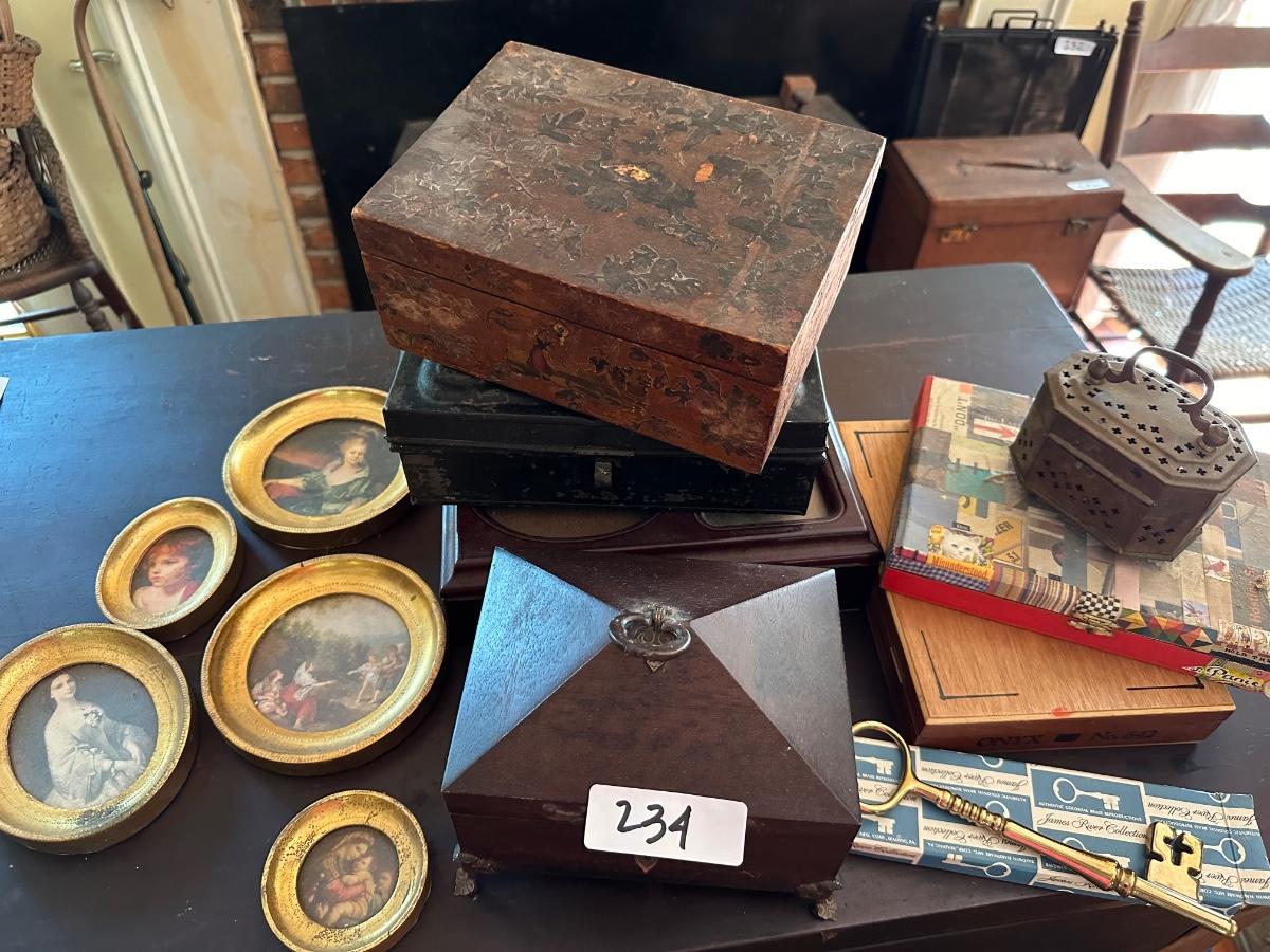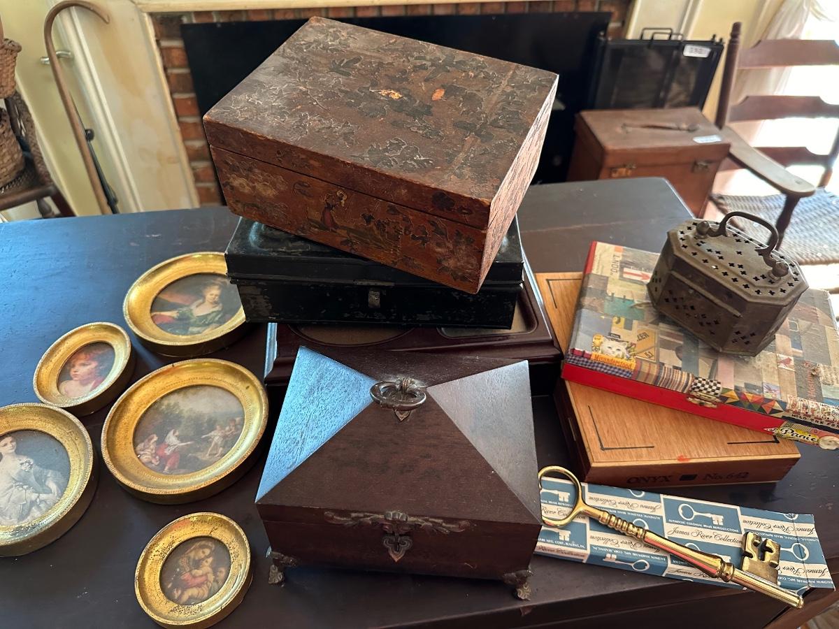 FRAMED MINI PICS, STORAGE BOXES, BRASS KEY