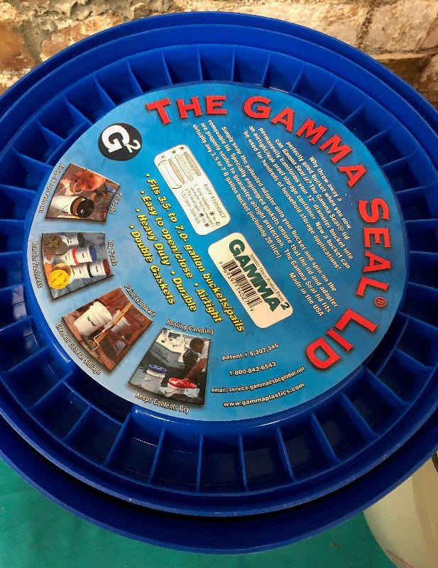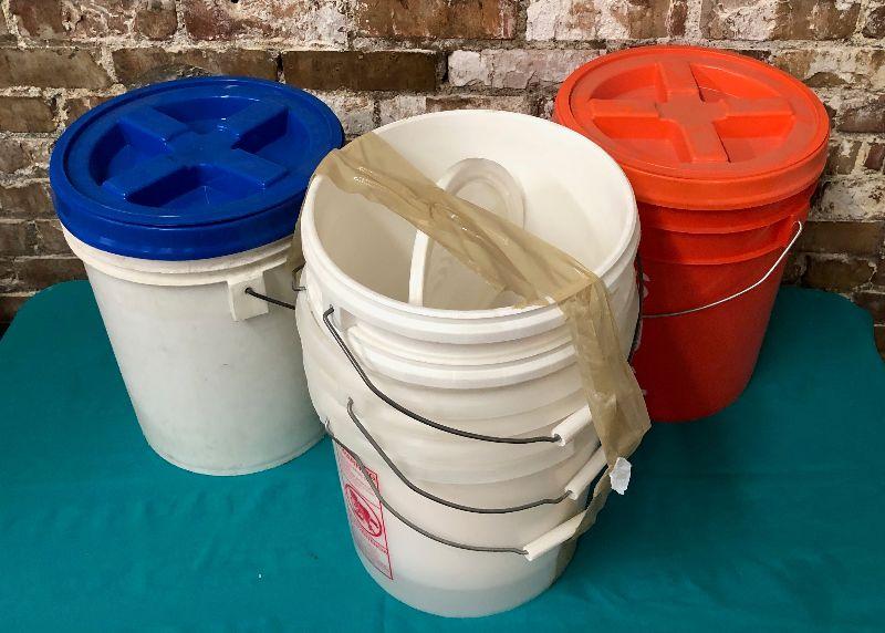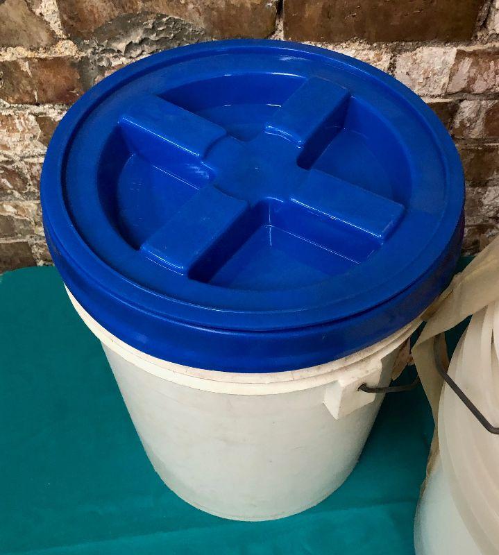 Here are five(5) heavy duty plastic storage buckets..2 with screw-on lids...