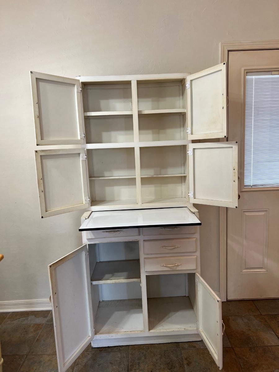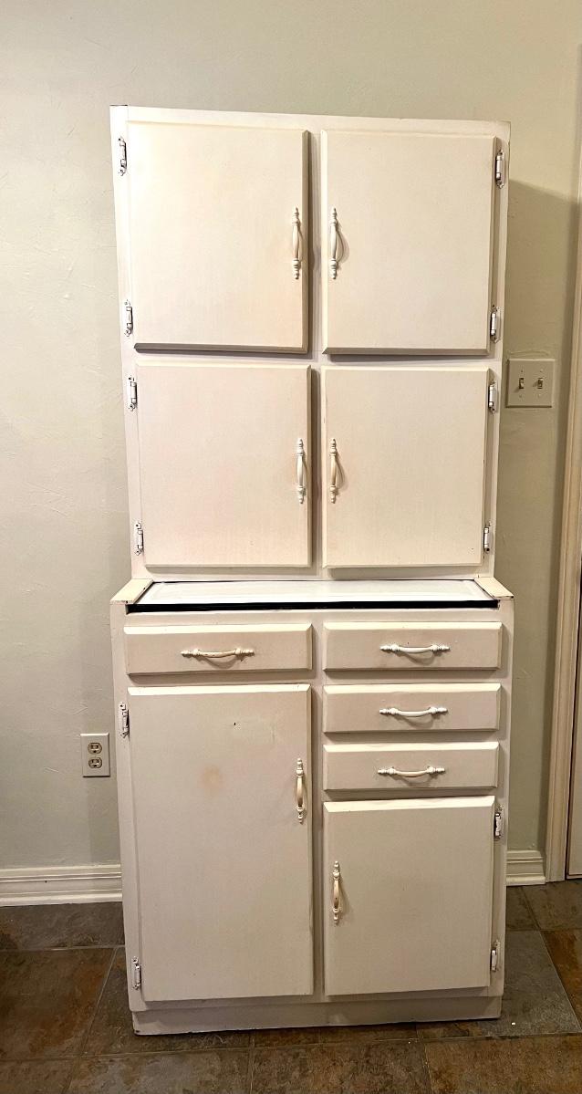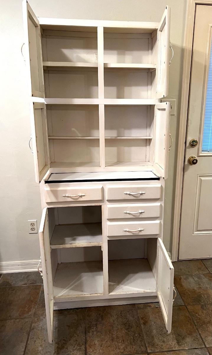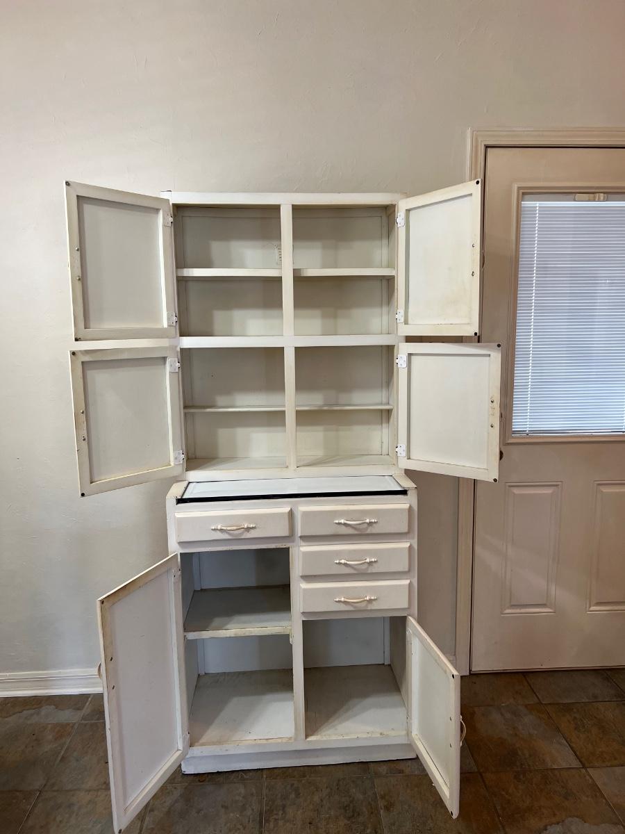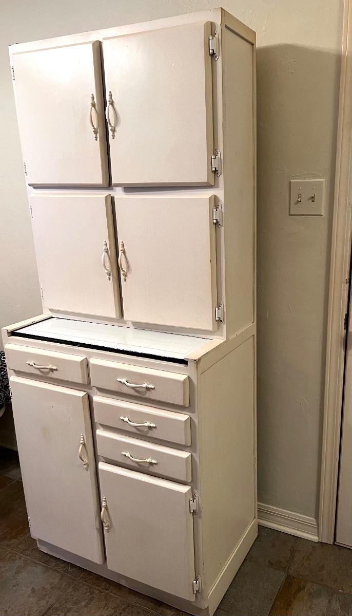 Vintage Retro Larder Cupboard with extendable tray. Measures 71 1/2 inches tall, 30 inches wide and 19 inches deep.