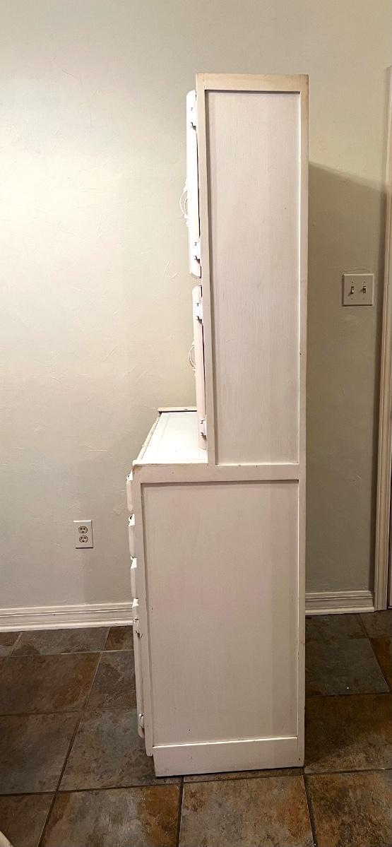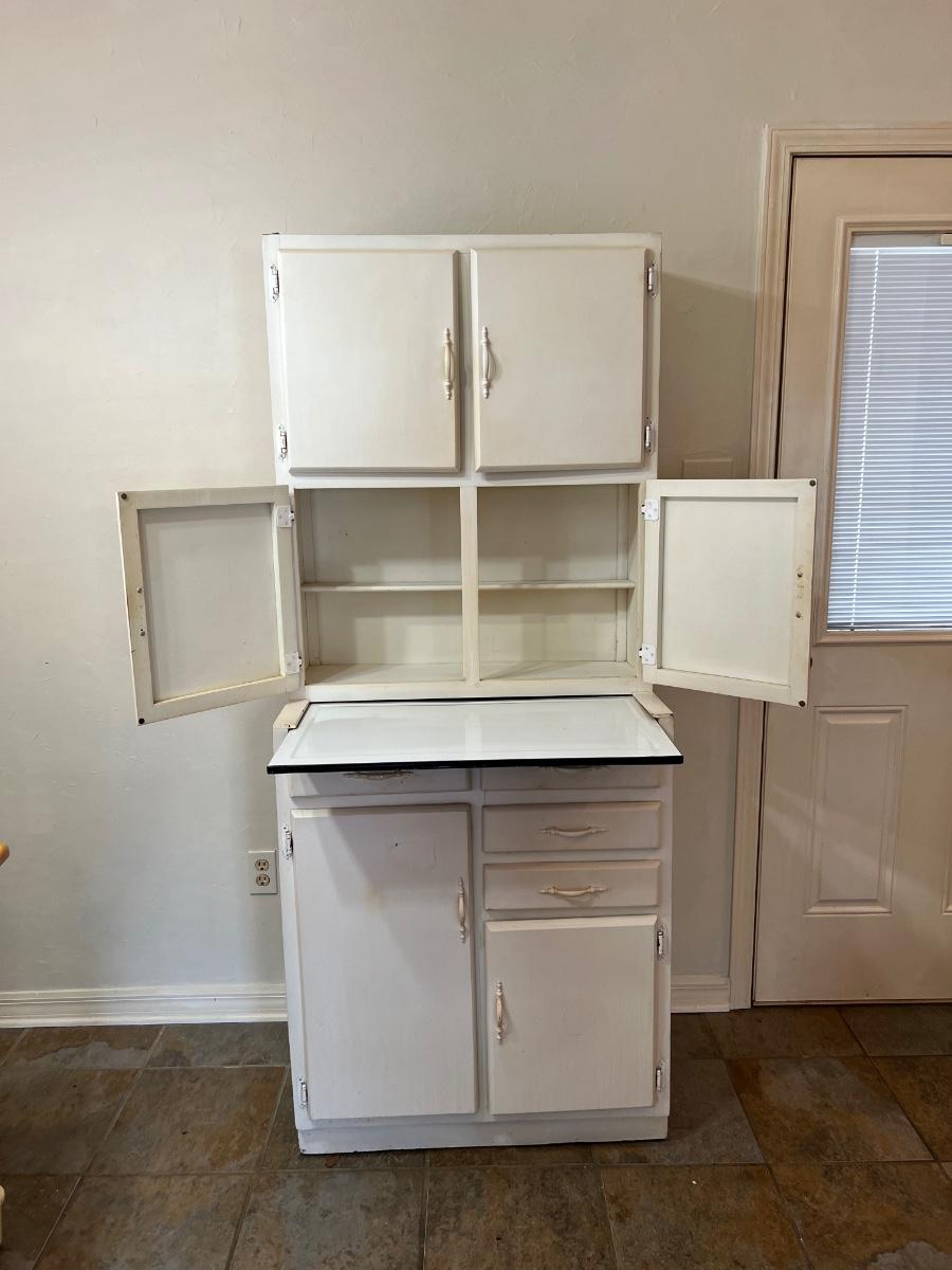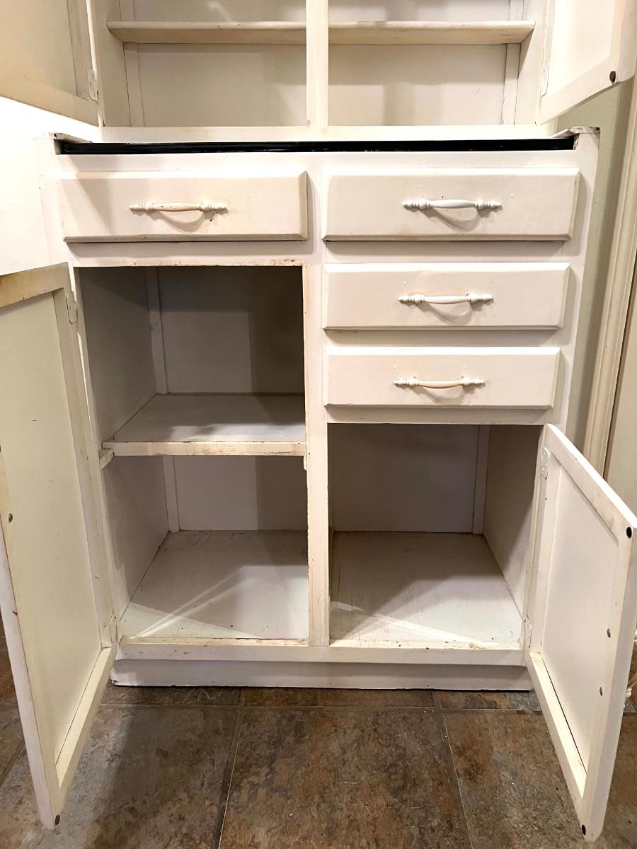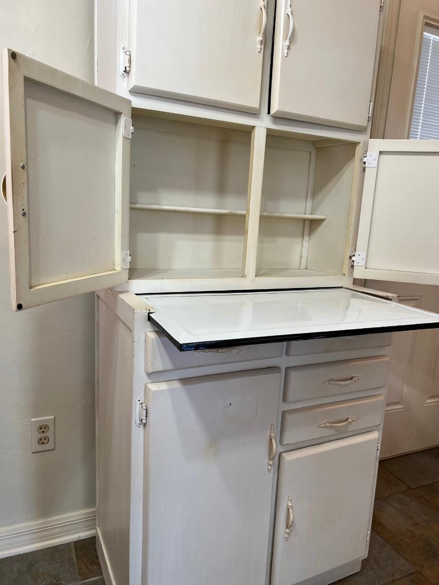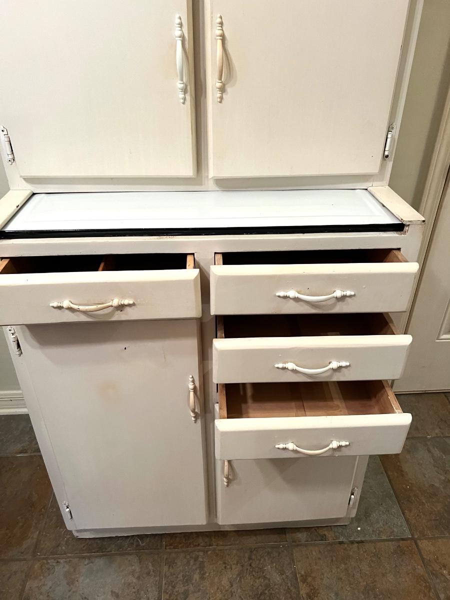 Vintage Retro Larder Cupboard with extendable tray. Measures 71 1/2 inches tall, 30 inches wide and 19 inches deep.