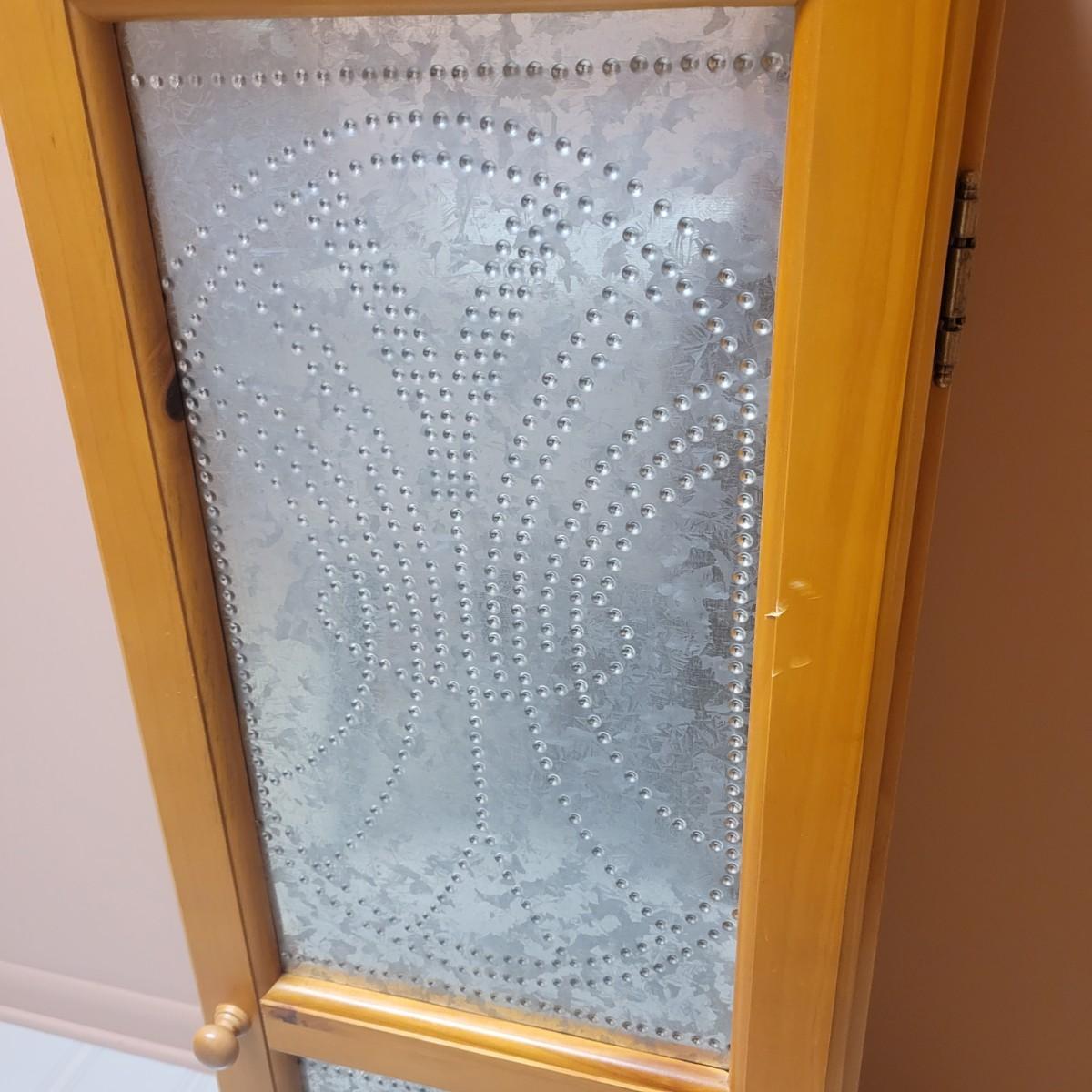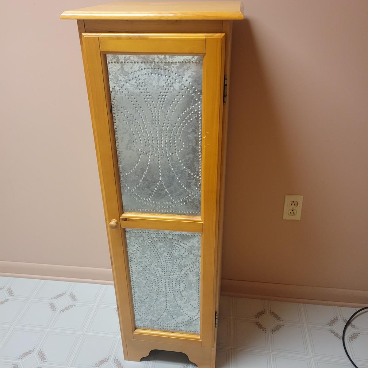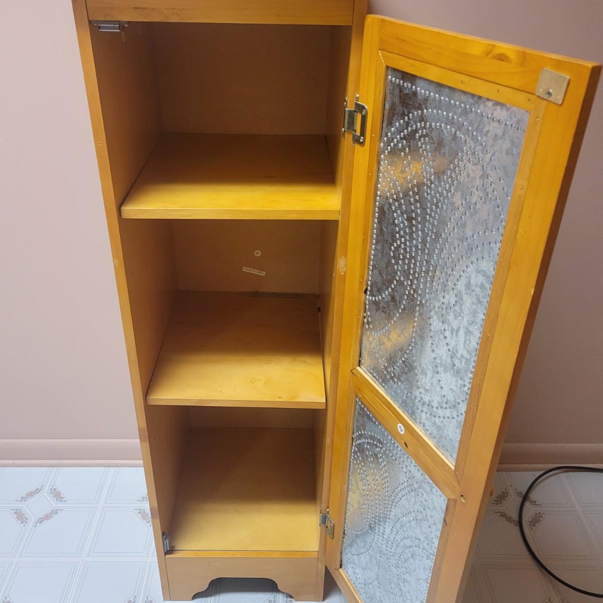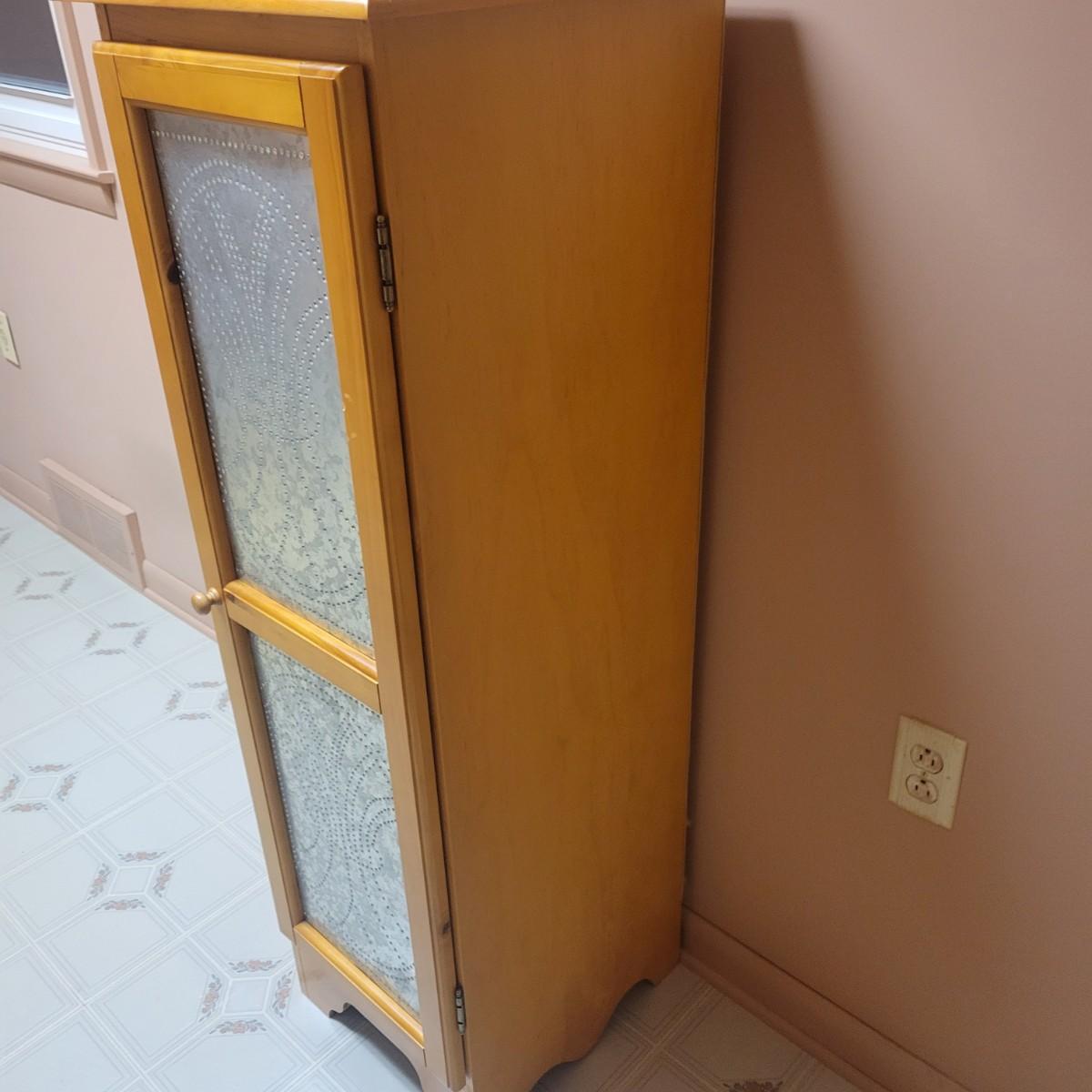 A storage cabinet in good condition with some minor blemishes. Cabinet features a decorative stamped tin front and two adjustable shelves. Cabinet measures approximately 16" x 16" x 48" Local pickup only