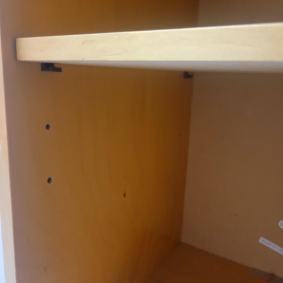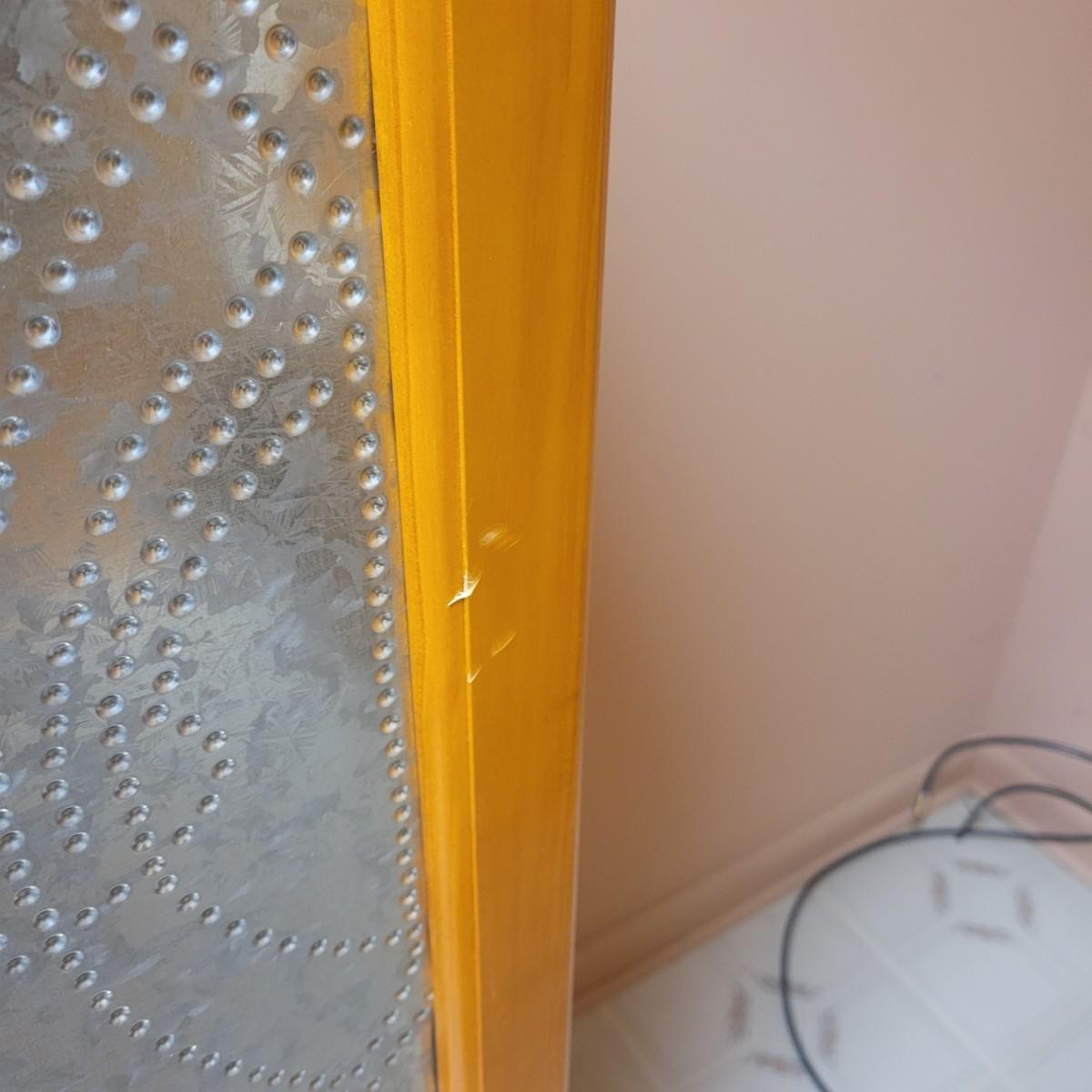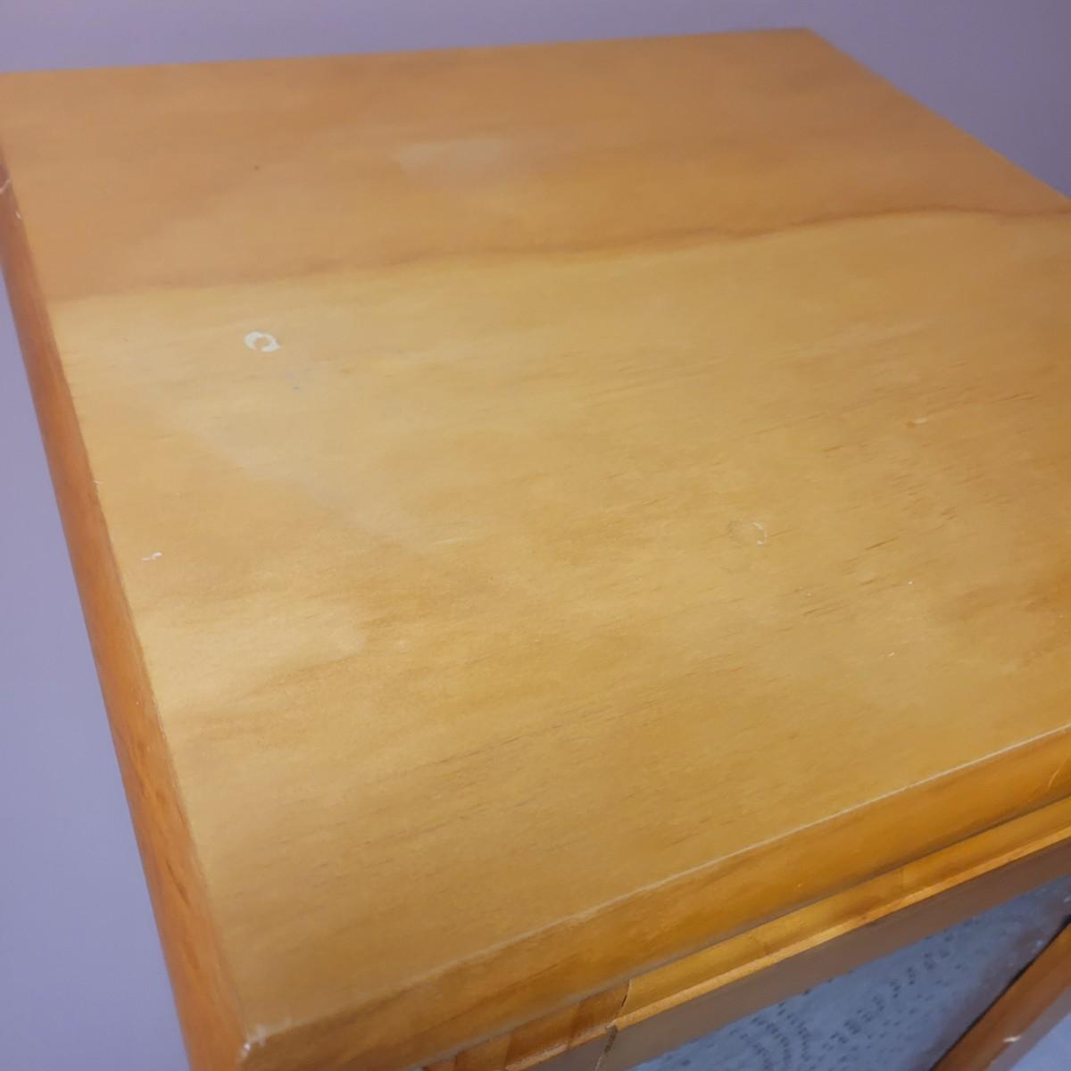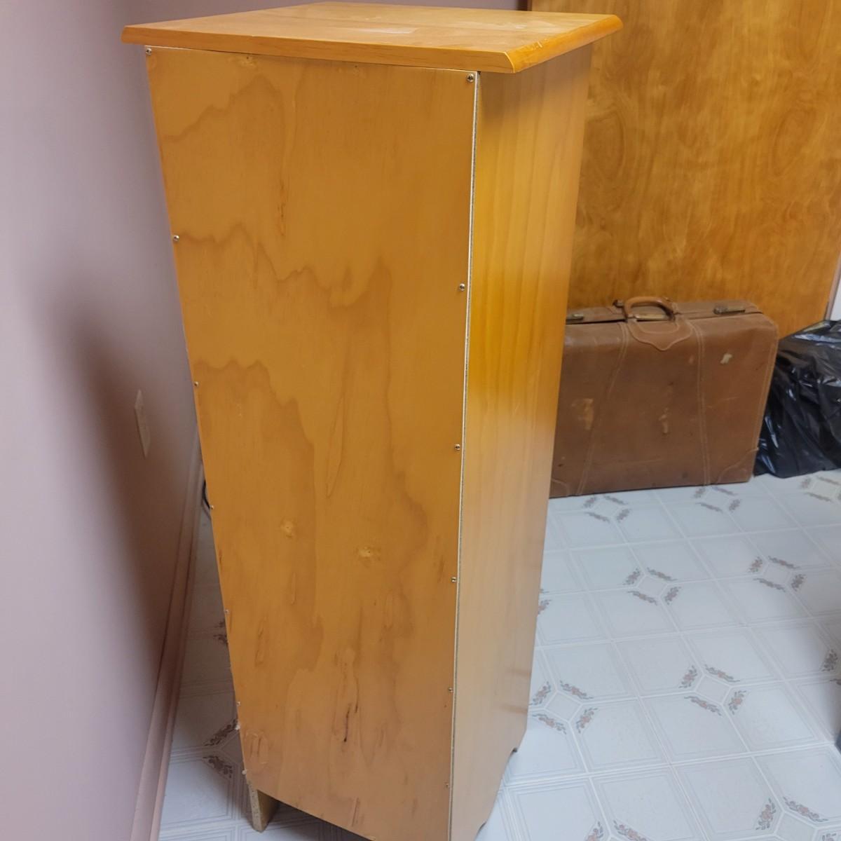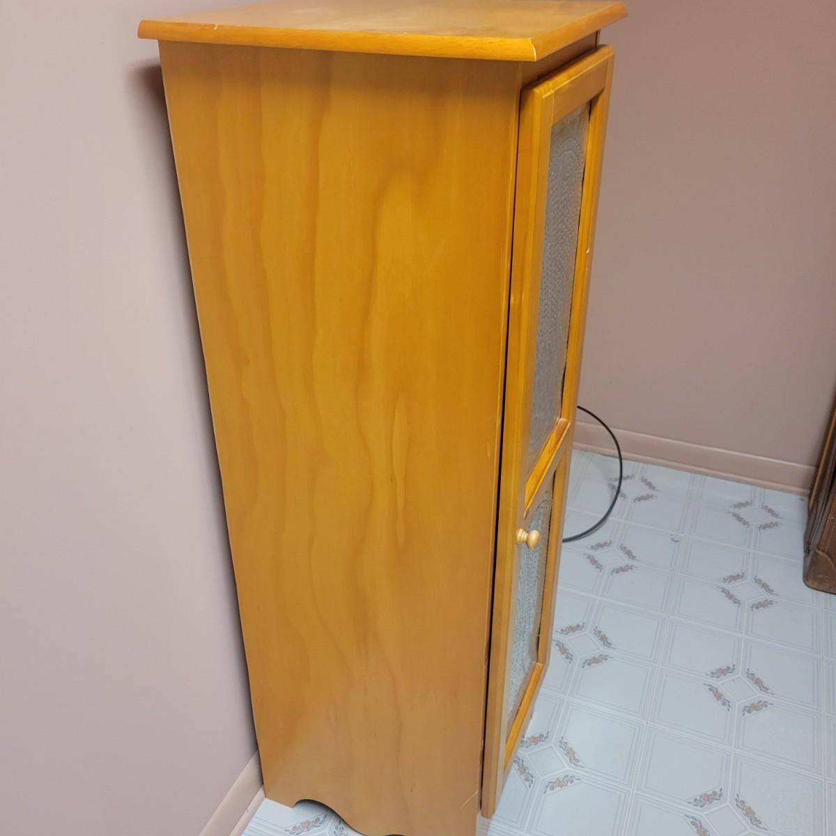 A storage cabinet in good condition with some minor blemishes. Cabinet features a decorative stamped tin front and two adjustable shelves. Cabinet measures approximately 16" x 16" x 48" Local pickup only