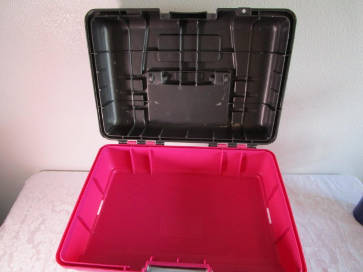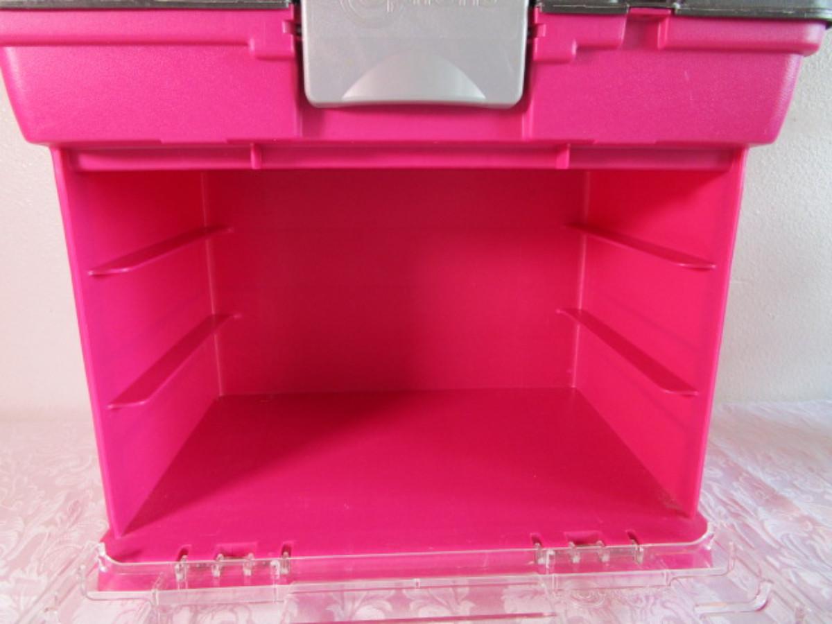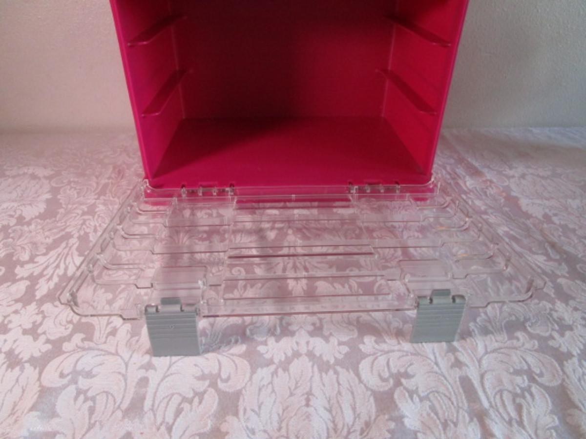 See pictures, no trays, top storage area is 15-1/2" x 10-1/2" x 4-7/8 tall" capacity, inside bottom is 8-3/4" tall x 14-1/2" x 9"