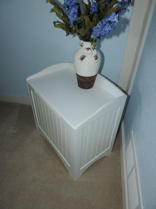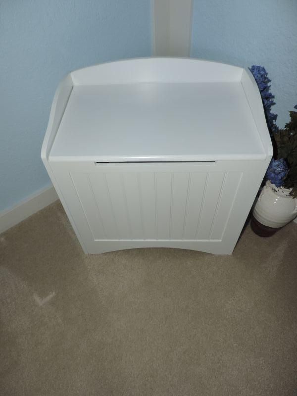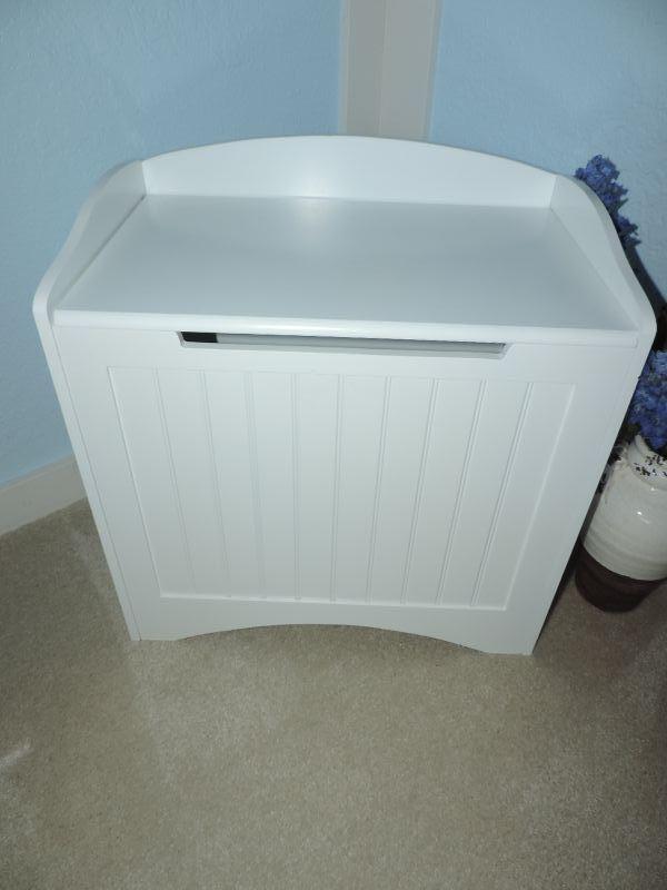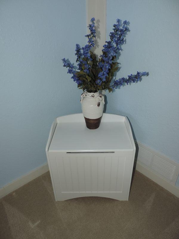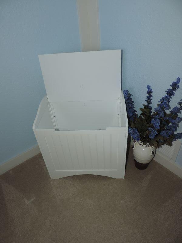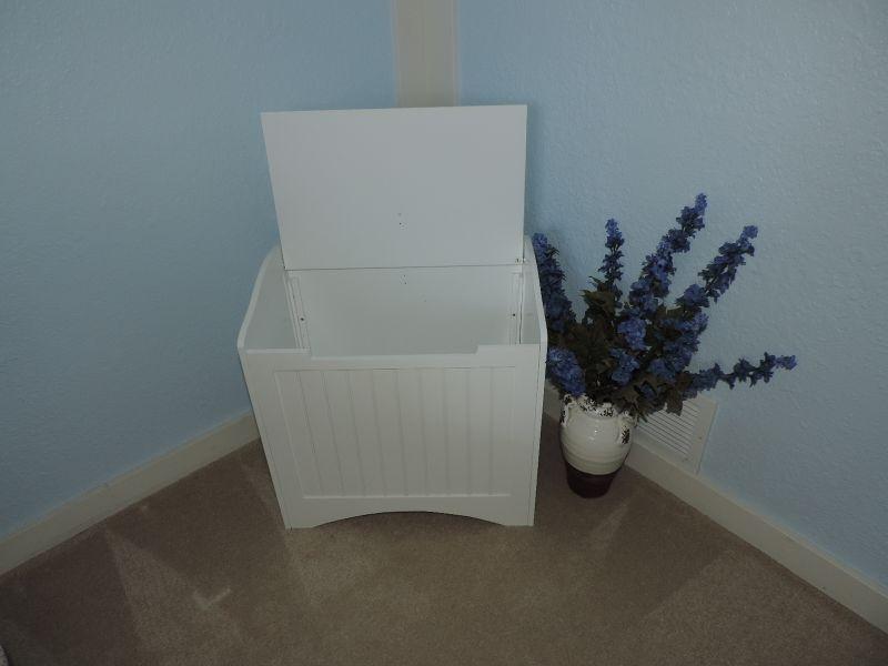 WHITE IKEA STORAGE BENCH MEASURES 20X46X20 USE FOR DIRTY LAUNDRY OR ANY EXTRA STORAGE NEEDED AND CERAMIC VASE WITH FAUX GREENERY