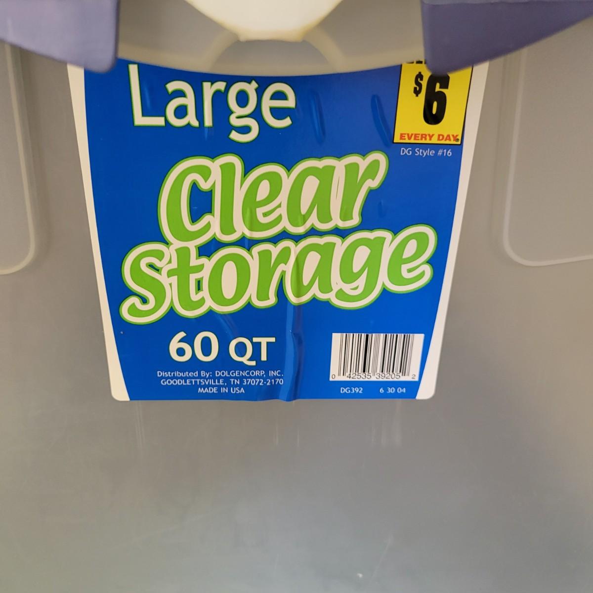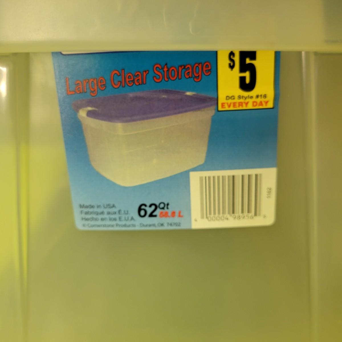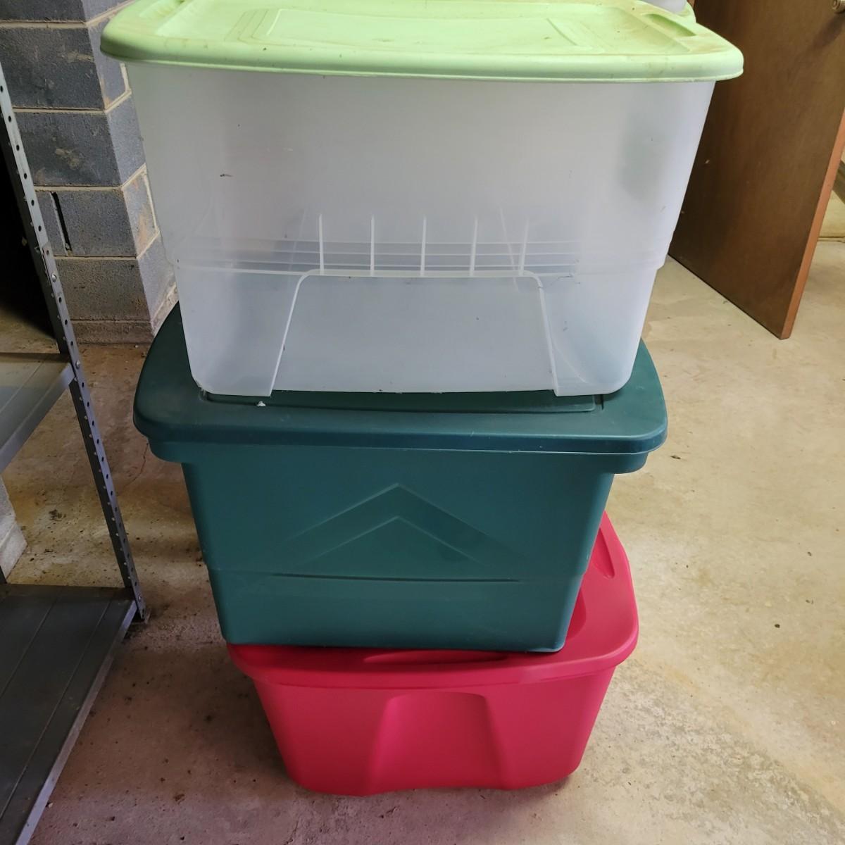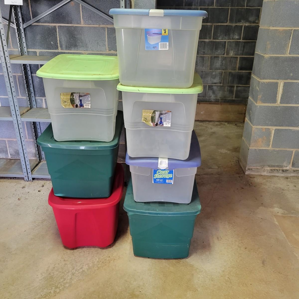 An assortment of seven storage containers with lids. The largest red bin measures approximately 21" x 14" x 15"H. Local pickup only