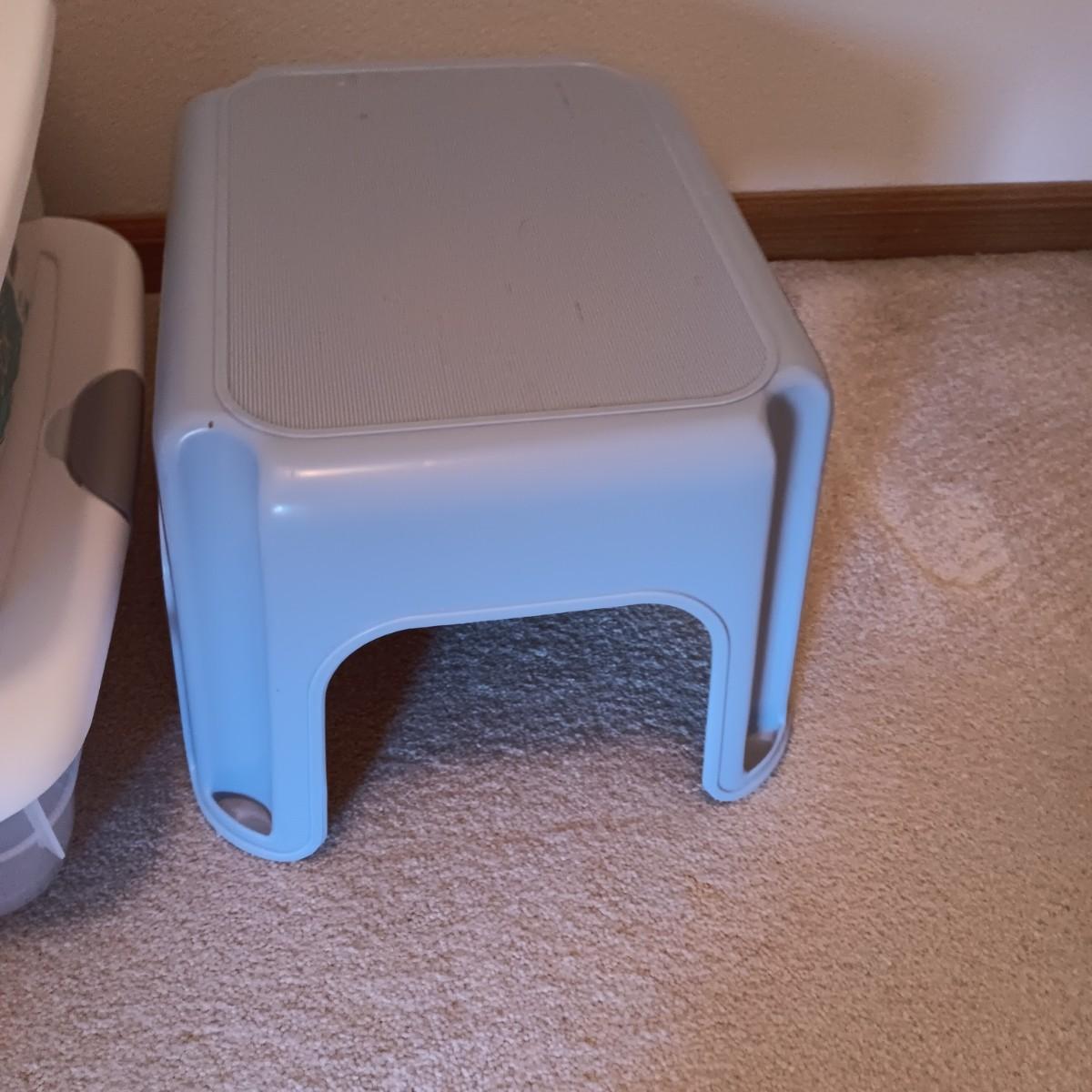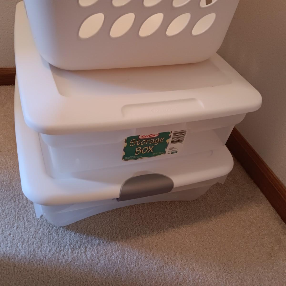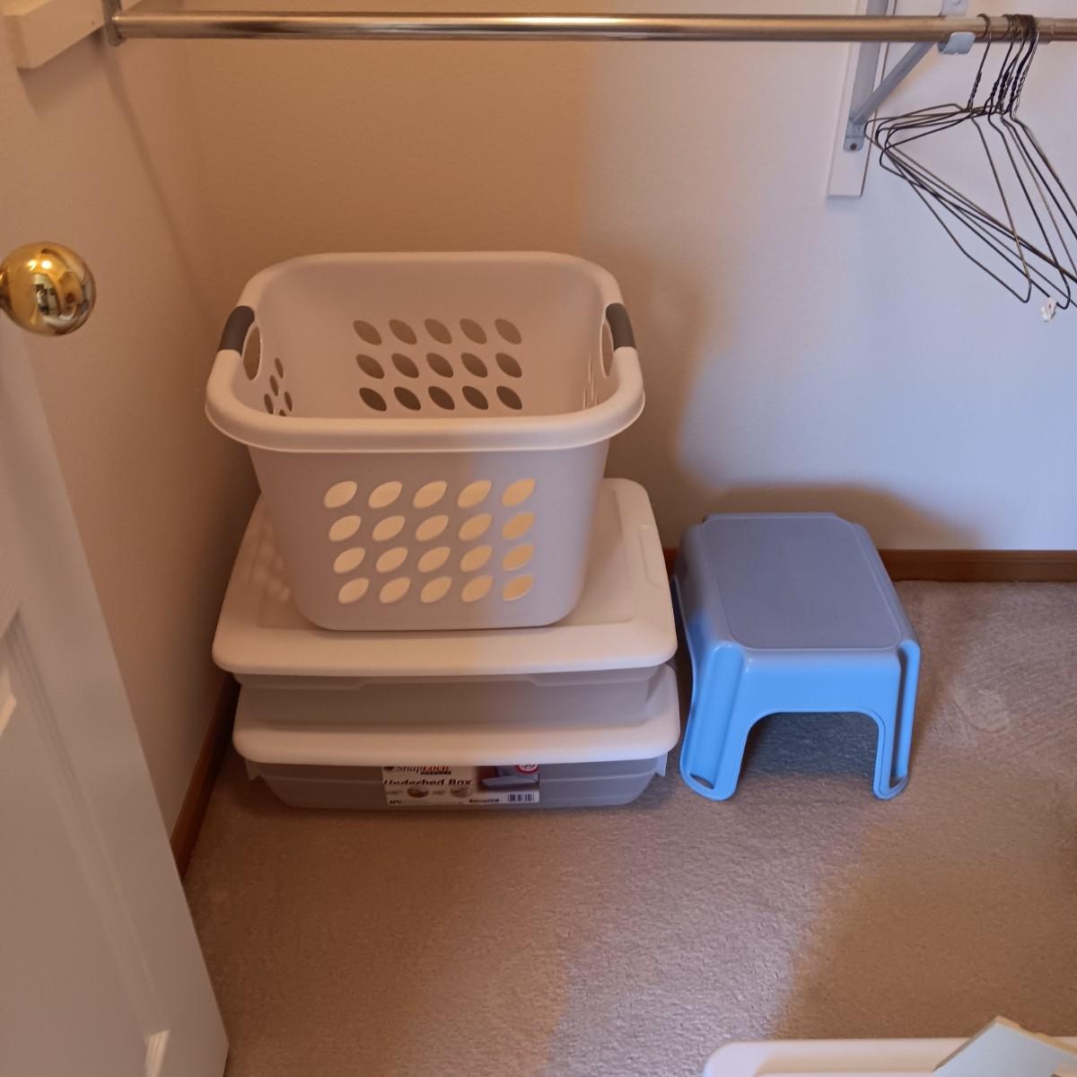 STORAGE CONTAINERS, LAUNDRY BASKET AND A STEP STOOL