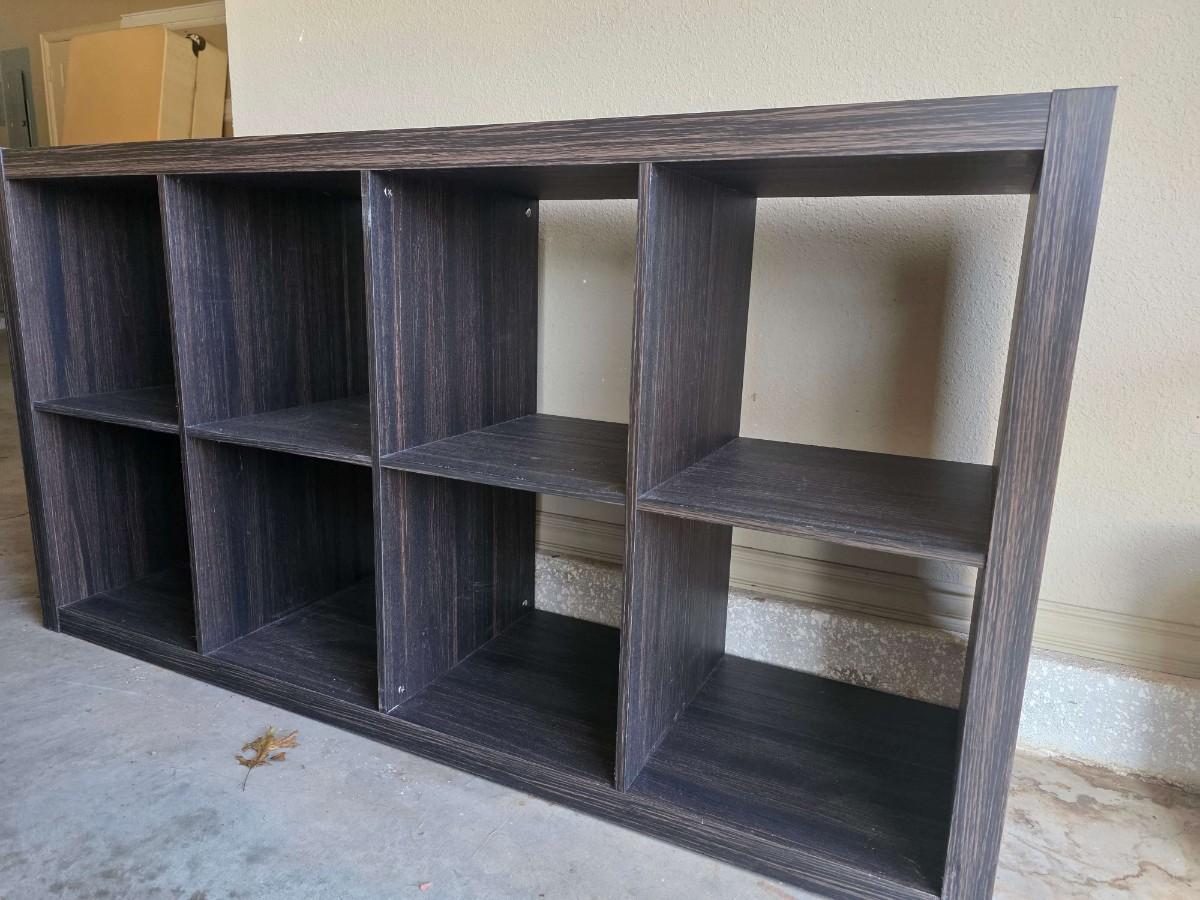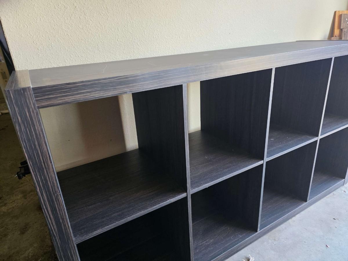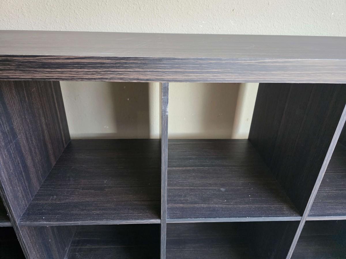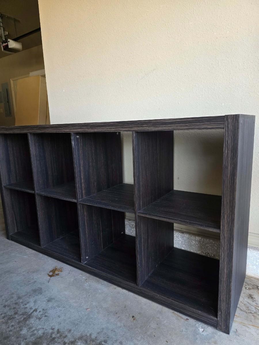Transitional style particle board storage cube cabinet. 57"L x 15"W x 13"H. Each cube space measures 13"L x 15"W x 13' H. Driftwood color. Minor scuffs on top as pictured.