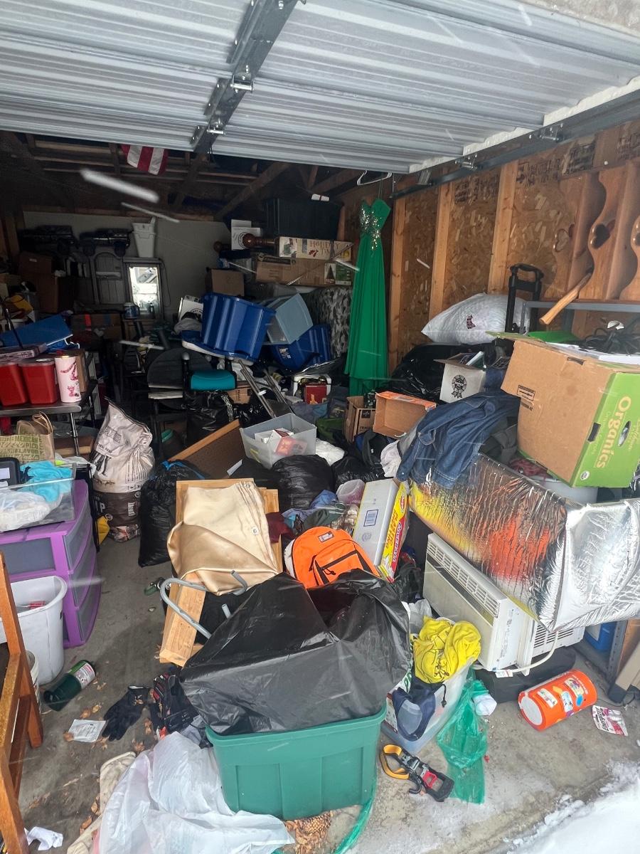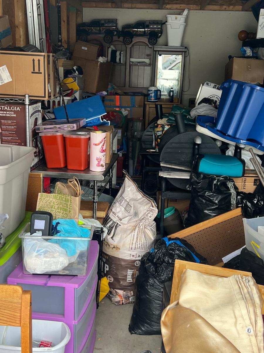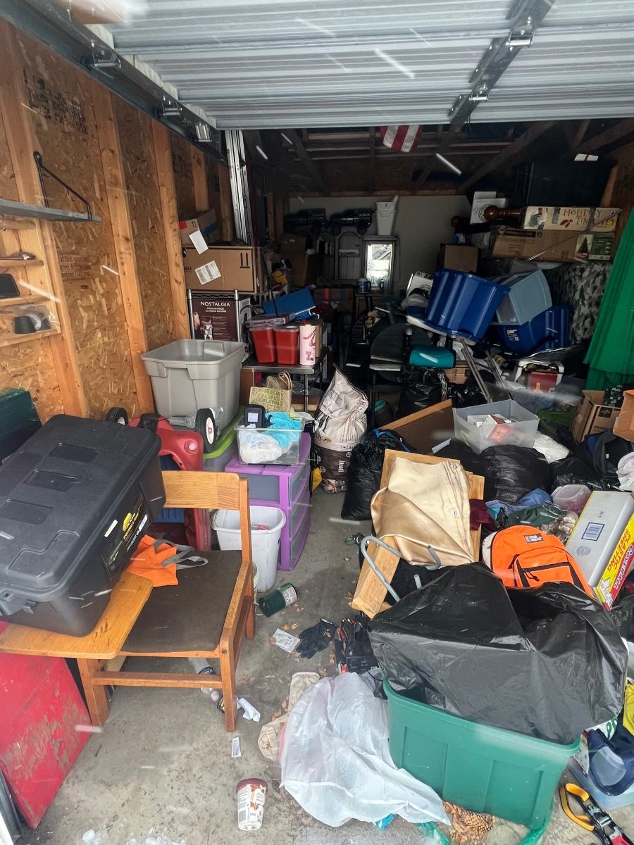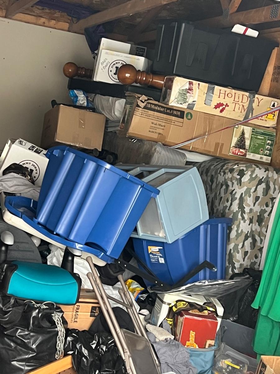 This unit appears to contain household items, grill, remote, control, cars, clothing, furniture