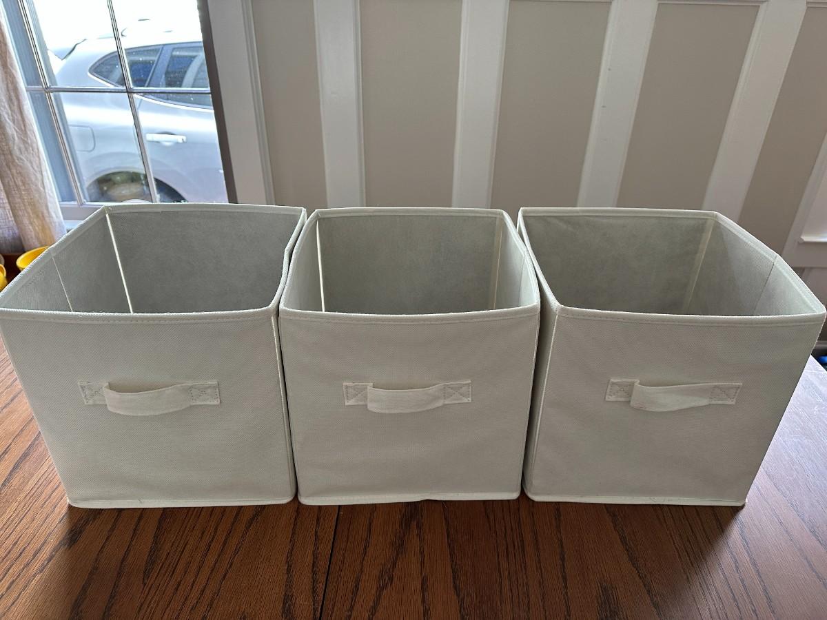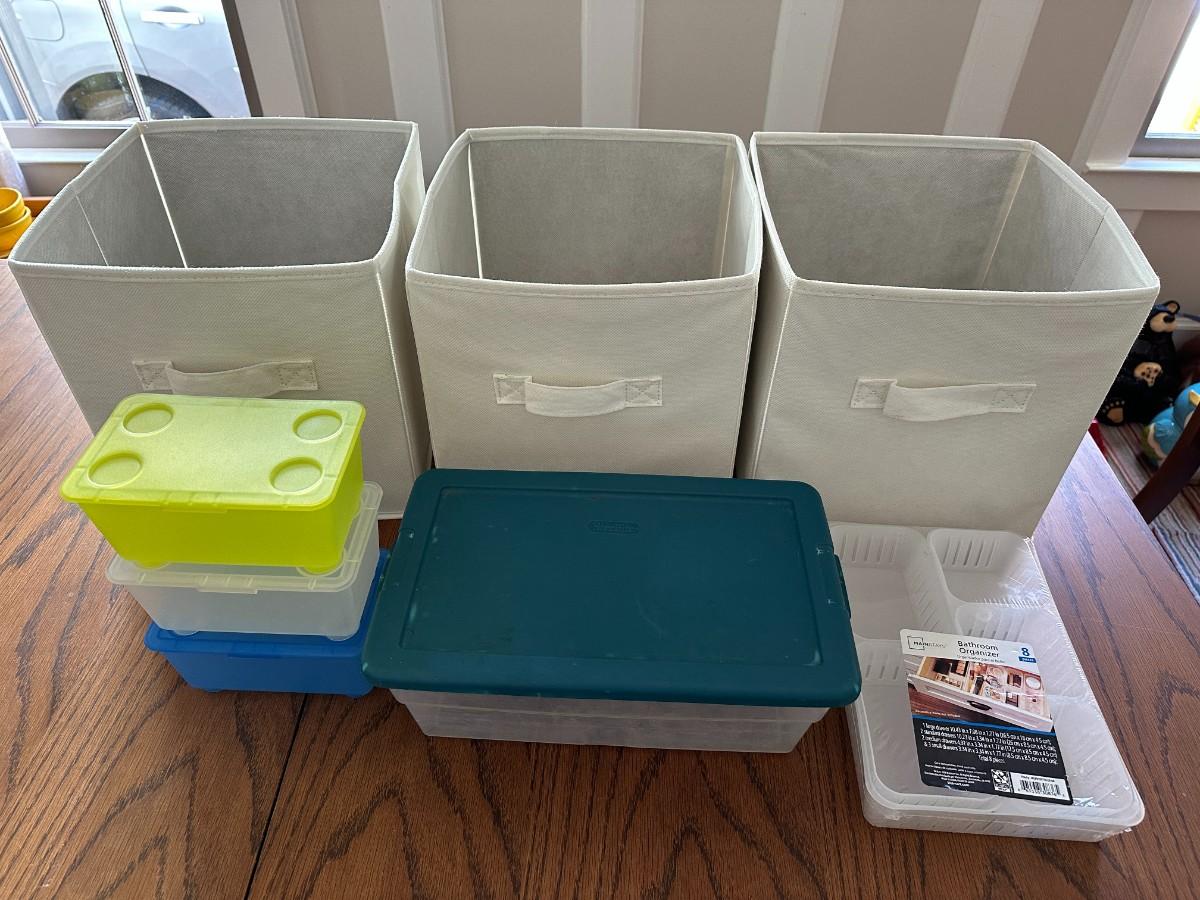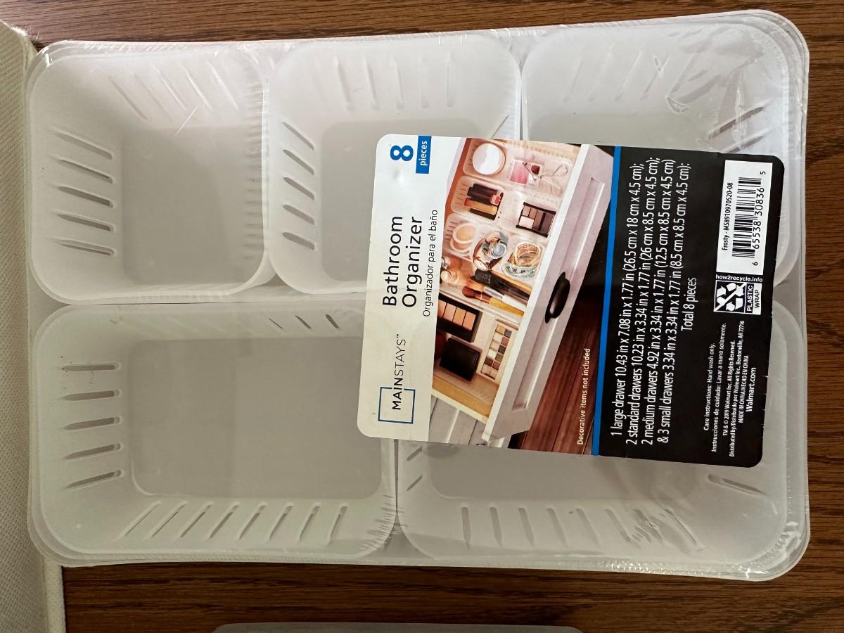 3 White Open Storage Cubes, 3 Small Plastic Containter w/Lids, 1 Shoe Bin w/Lid, 8 pc Set Bathroom Organizer - unopened.