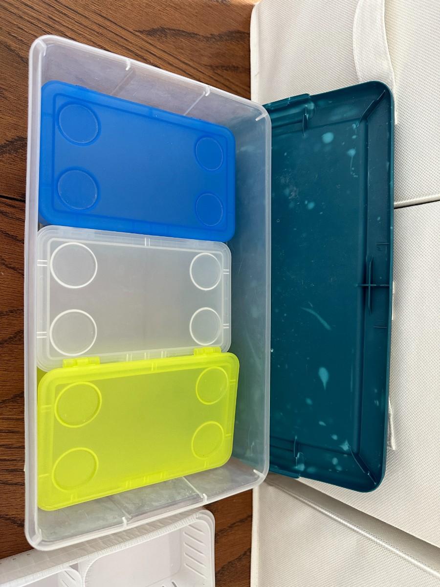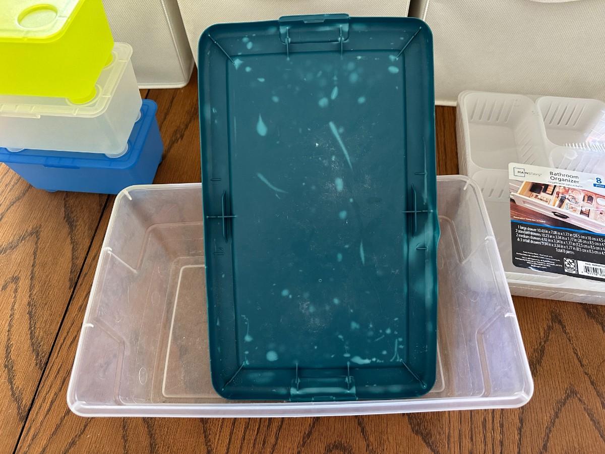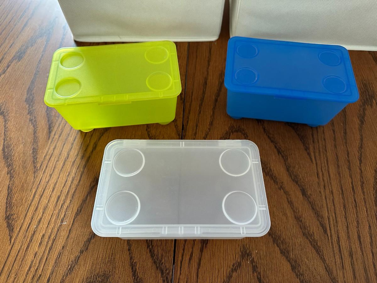 3 White Open Storage Cubes, 3 Small Plastic Containter w/Lids, 1 Shoe Bin w/Lid, 8 pc Set Bathroom Organizer - unopened.
