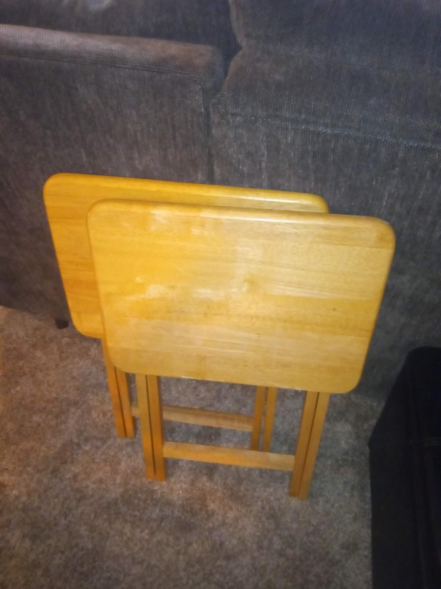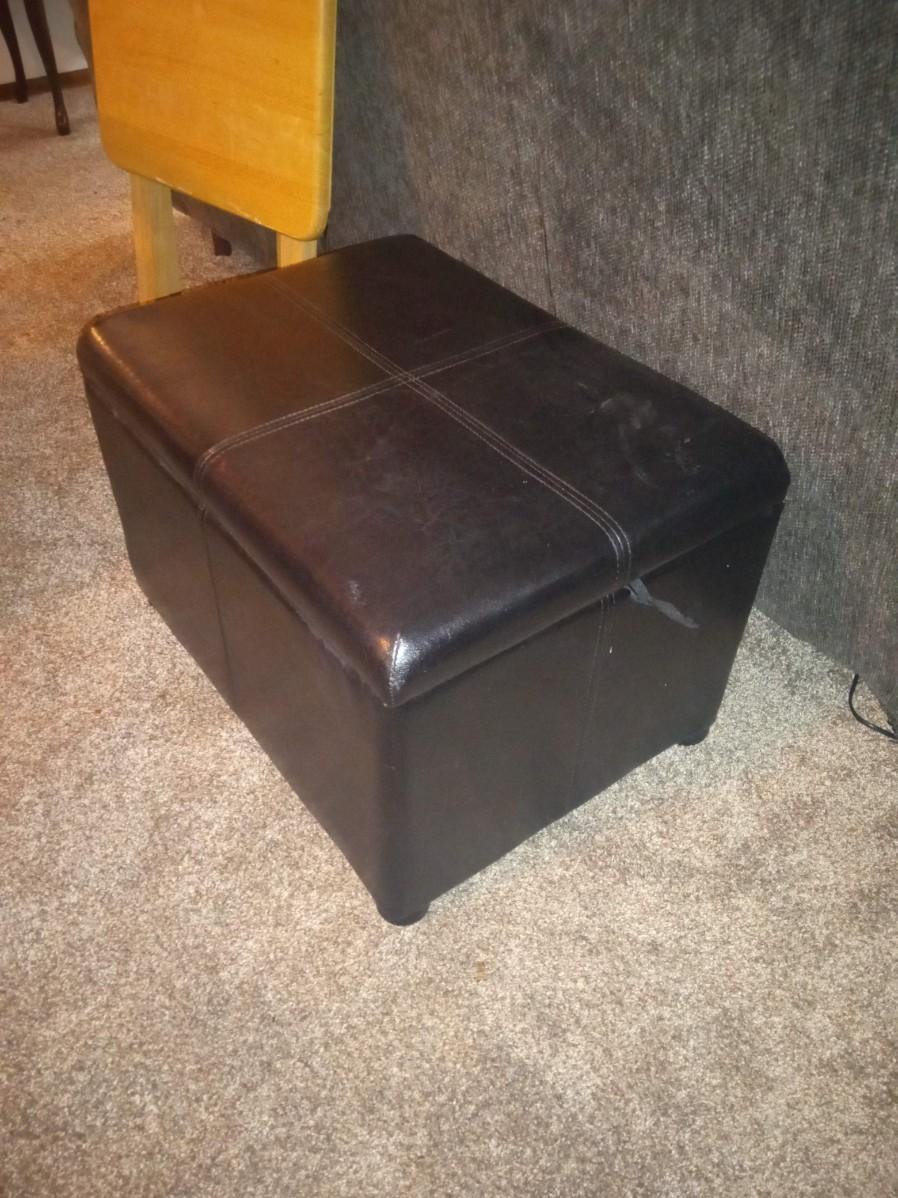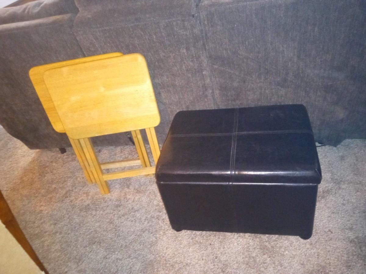 STORAGE OTTOMAN AND 2 OAK TV TRAYS