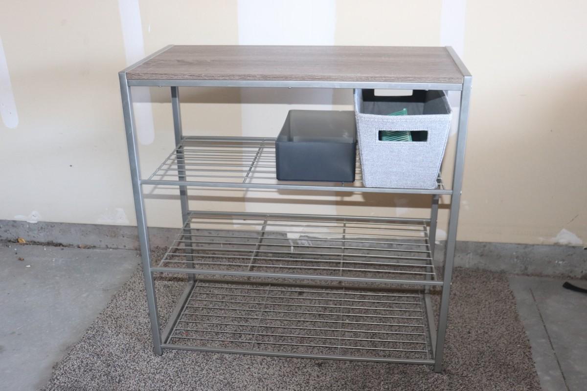 A set of storage racks designed for organizing items in your home, garage, or workshop, making it easy to declutter your space.