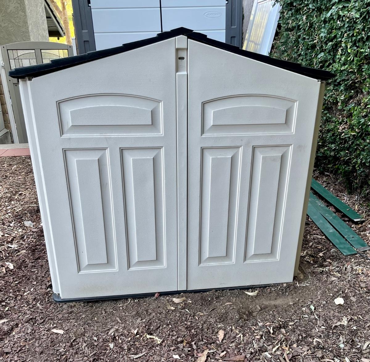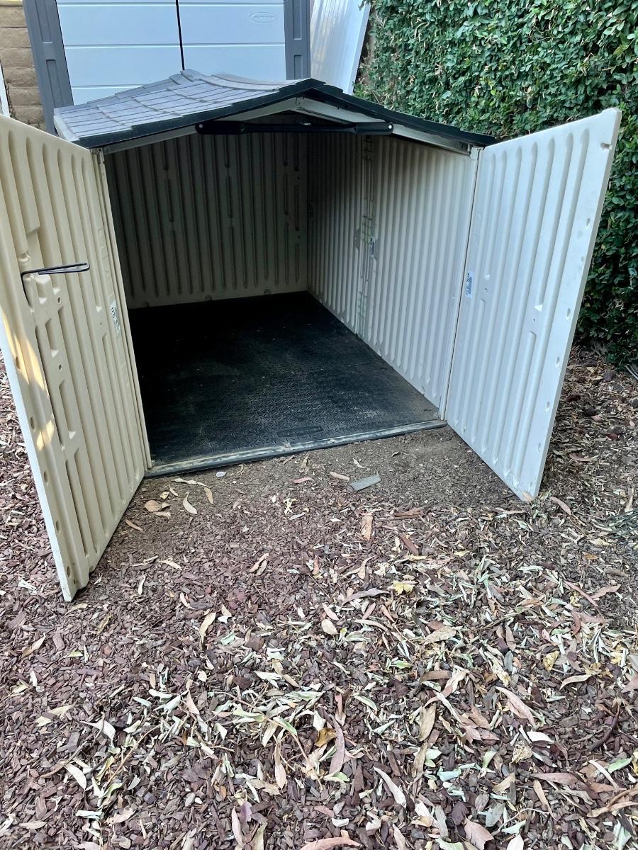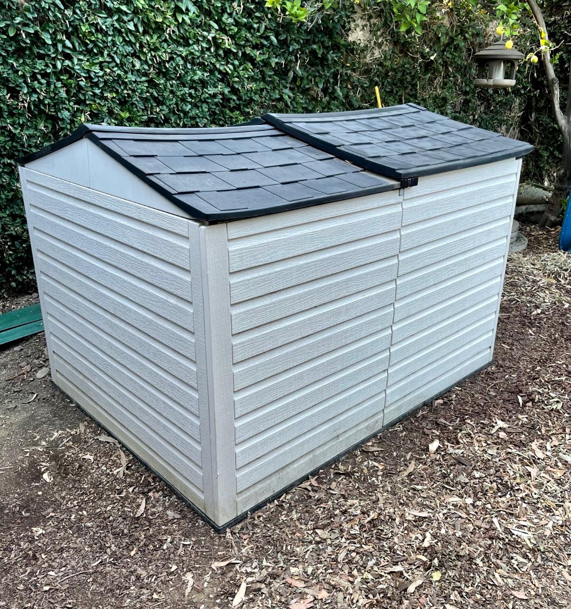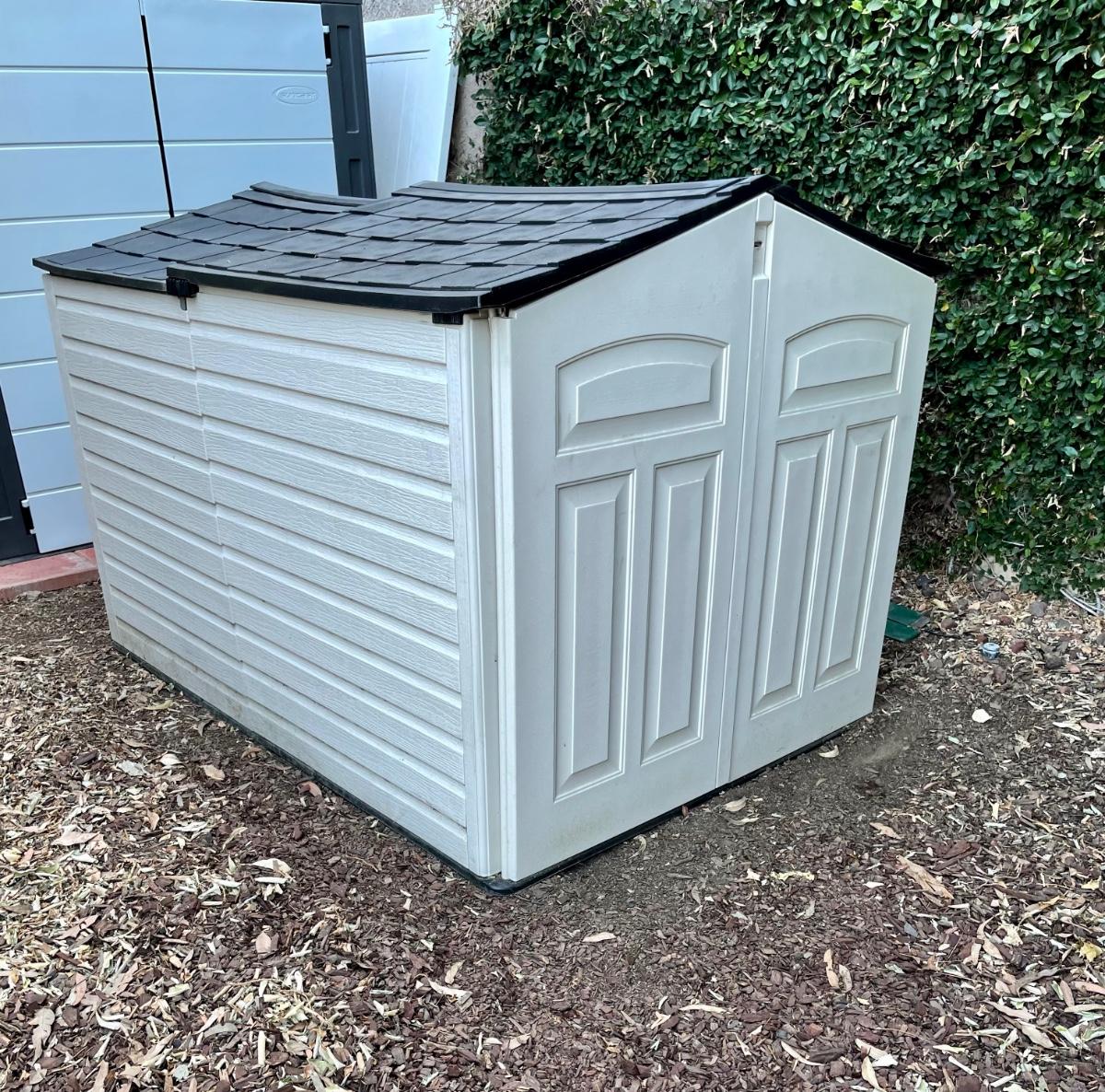 Rubbermaid low profile yard storage shed. 6’ Long x 4.5’ wide, 48” to highest point inside roof peak. Solid floor. Front roof section is on rollers and is designed to slide back, making it easier to remove items. Will need partial disassembly to transport.