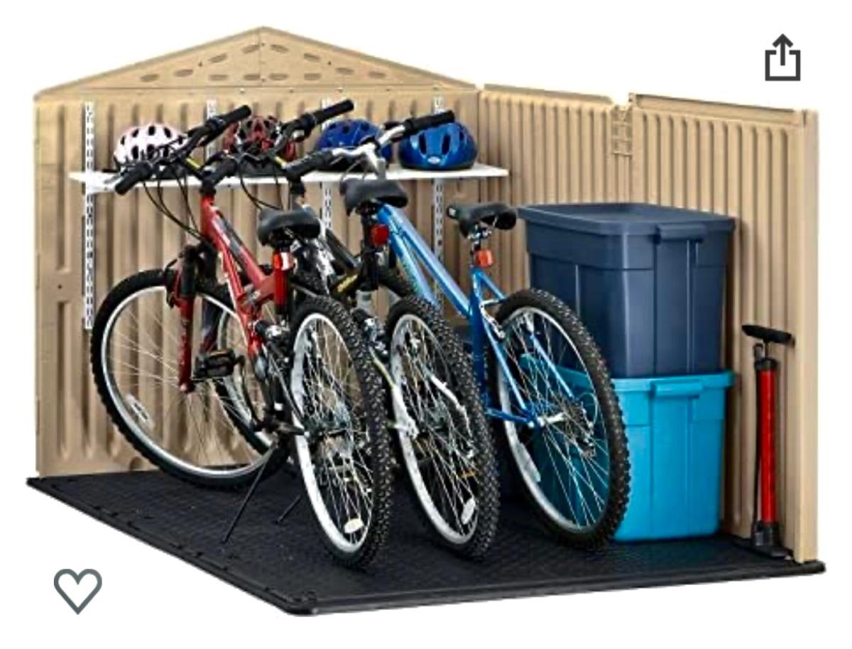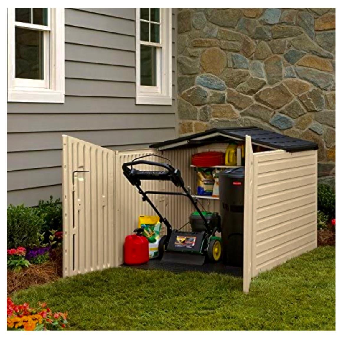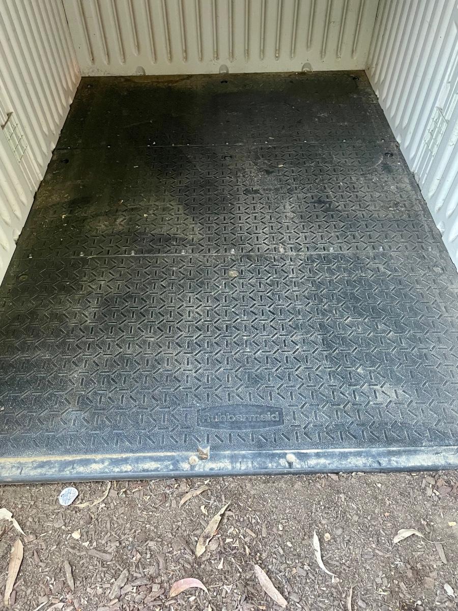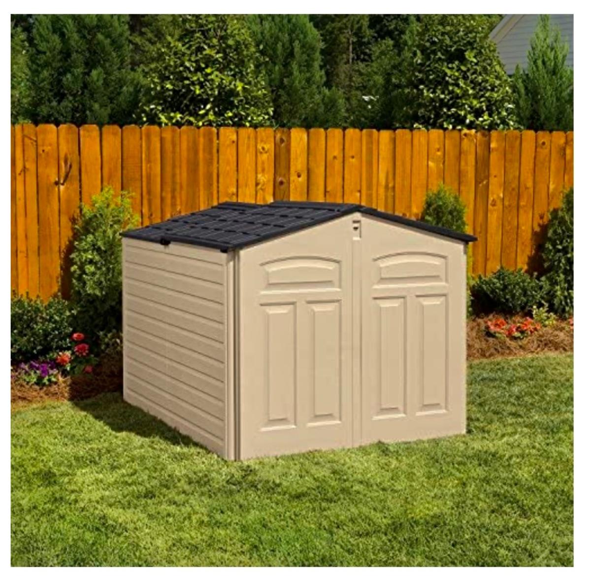 Rubbermaid low profile yard storage shed. 6’ Long x 4.5’ wide, 48” to highest point inside roof peak. Solid floor. Front roof section is on rollers and is designed to slide back, making it easier to remove items. Will need partial disassembly to transport.