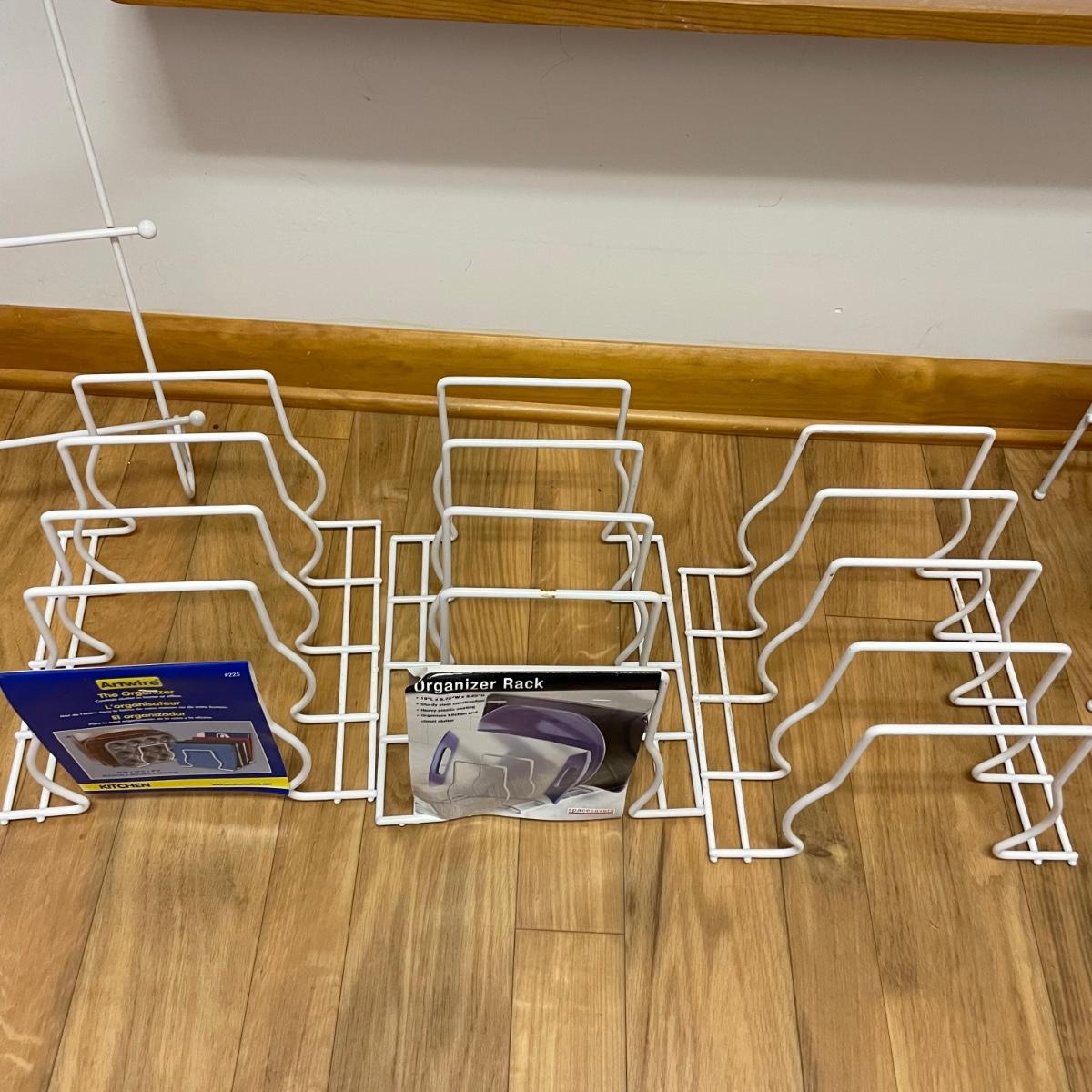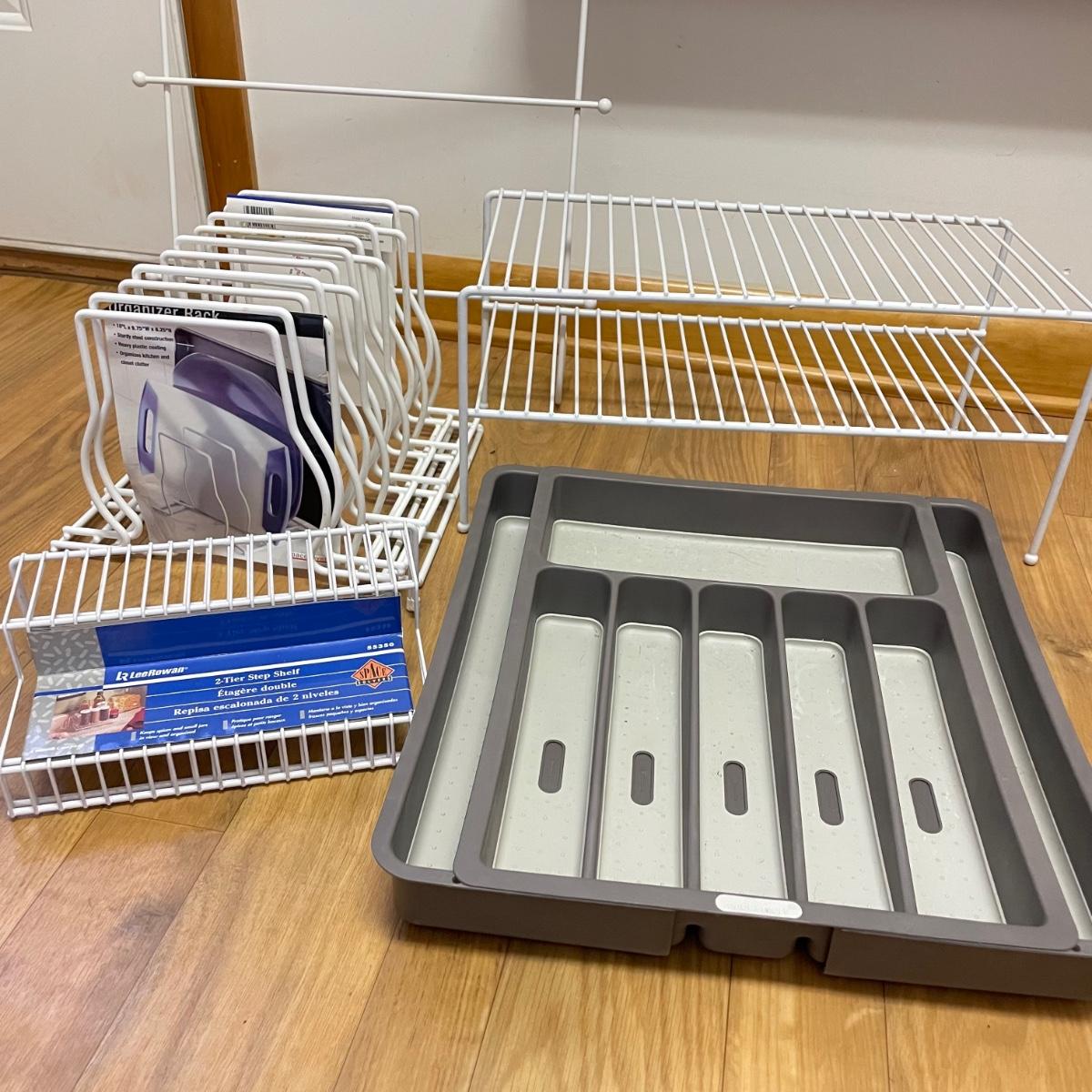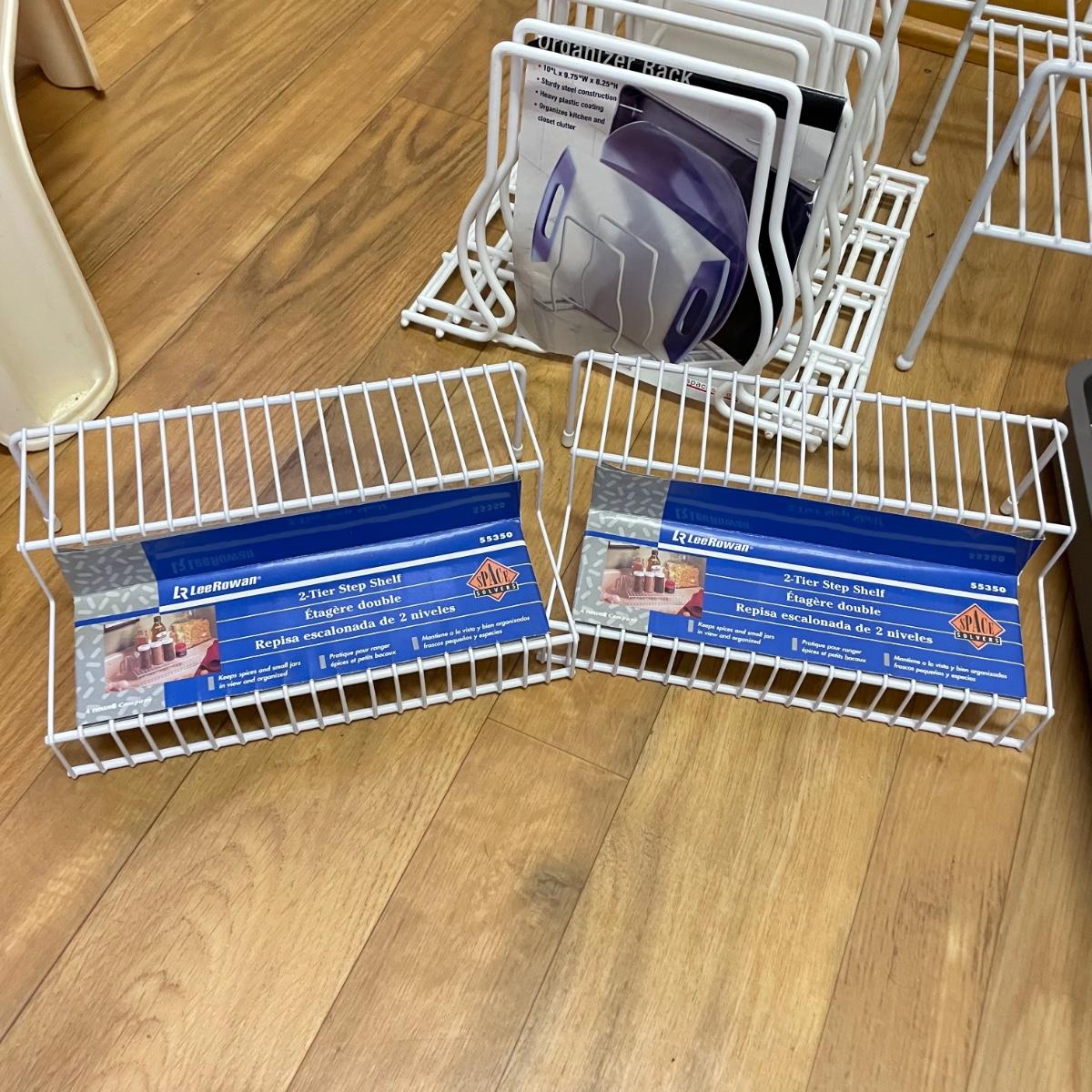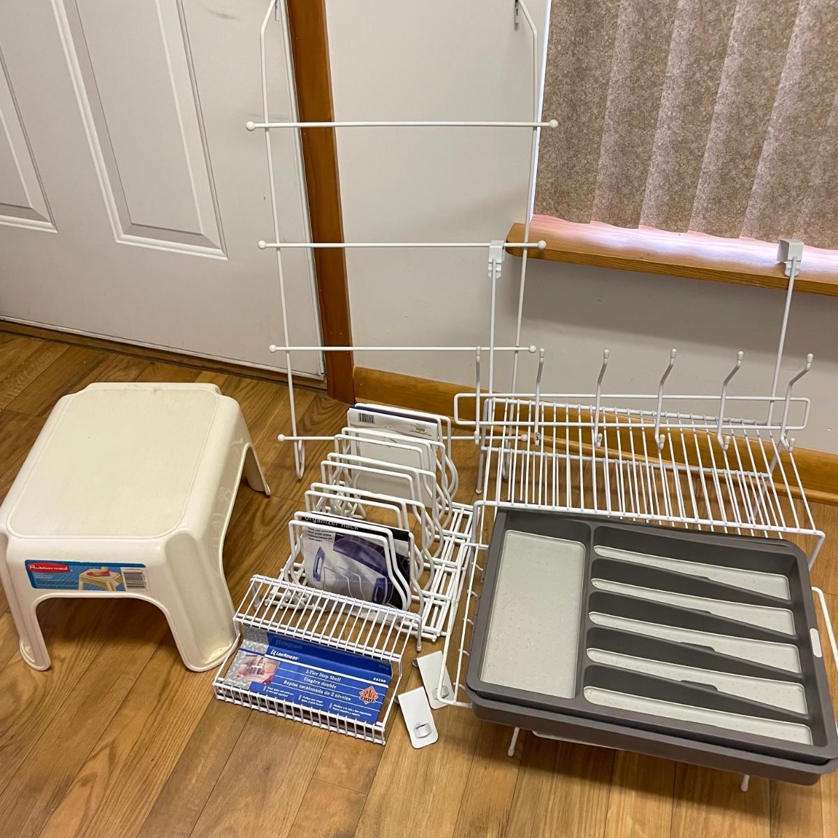 A variety of storage solutions for your home, office or shop. Lot features two over-the-door towel and garment racks, an adjustable cutlery organizer, two two-tier step shelves with packaging intact, perfect for spices or small jars. A rubbermaid stepstool, two vinyl covered racks and three organizer racks, two with original packaging. The long over-the-door towel rack is about 29.5” tall and comes with white metal door hooks so the rack does not stay flush to the door, The cutlery tray without extensions is 12” x 16”, each adjustable side can add up to 6”. Other known measurements are shown in photos. Local pick up only.