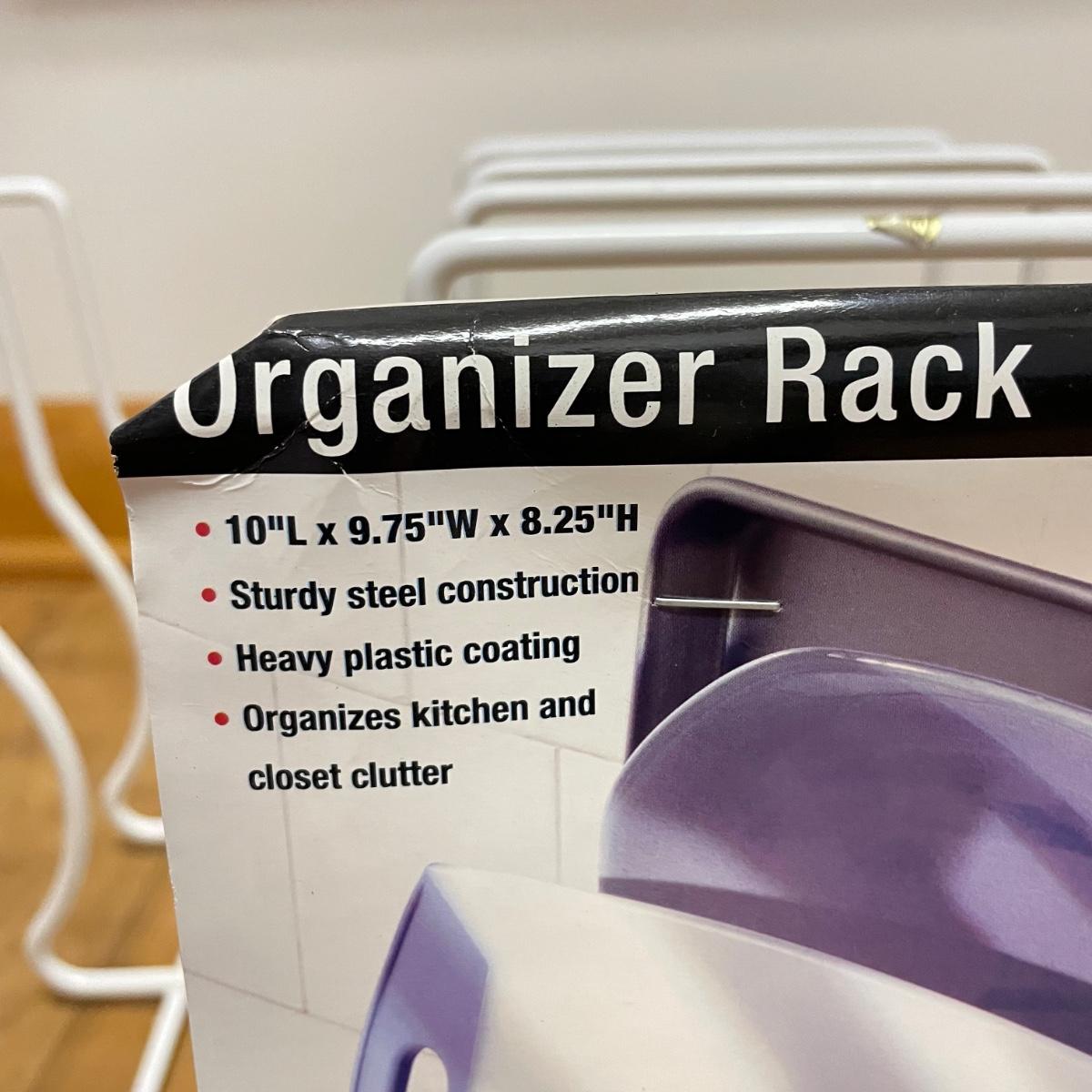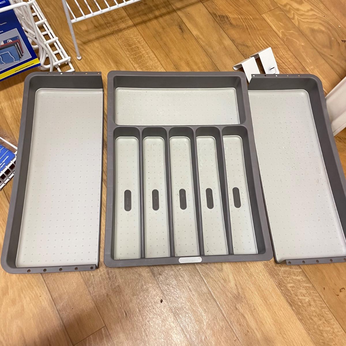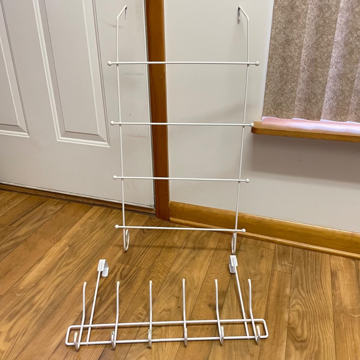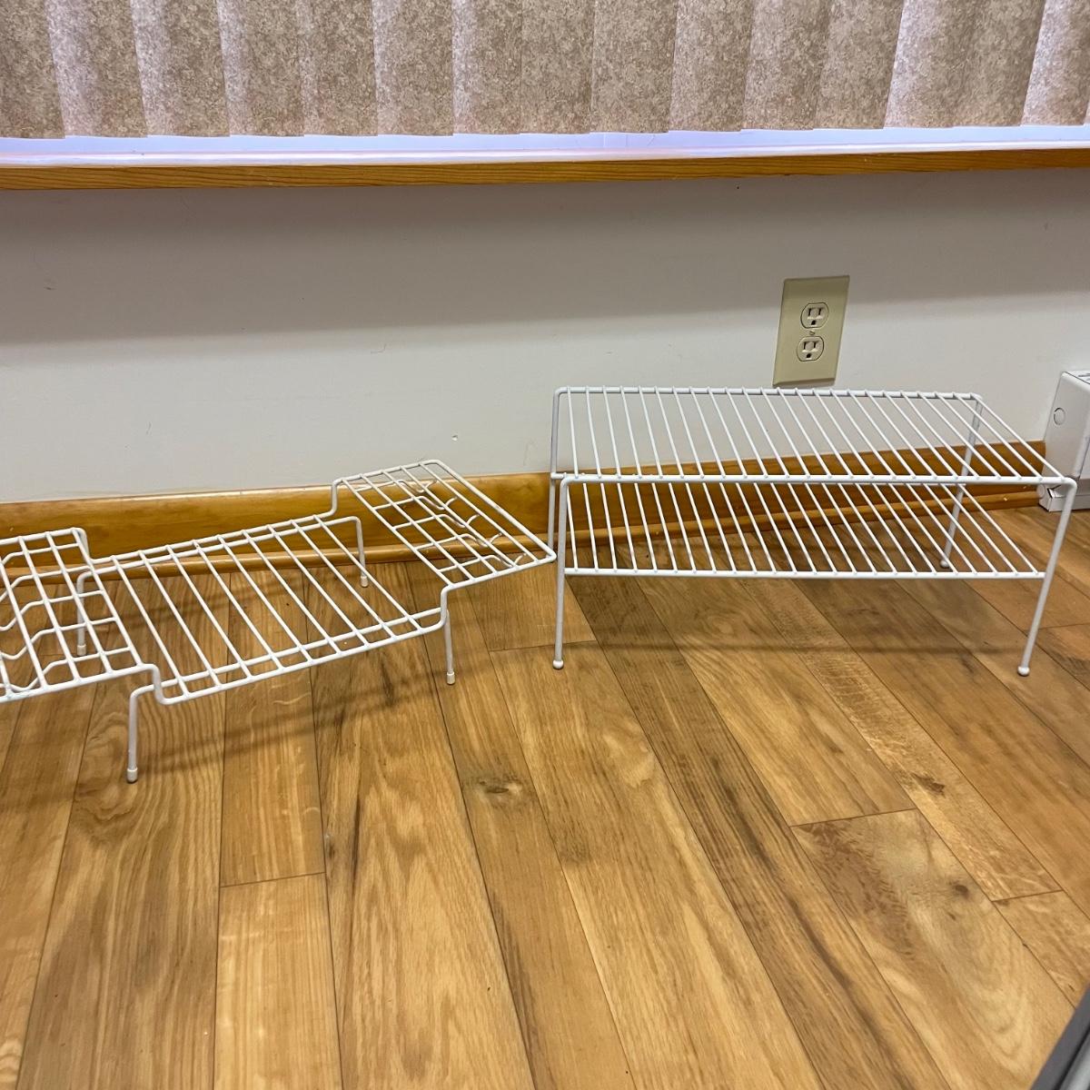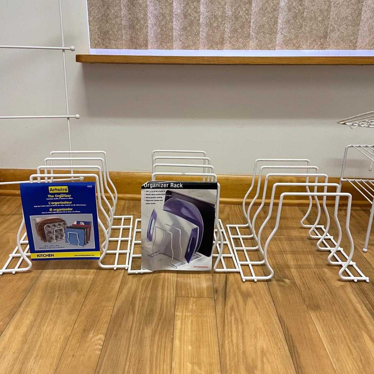 A variety of storage solutions for your home, office or shop. Lot features two over-the-door towel and garment racks, an adjustable cutlery organizer, two two-tier step shelves with packaging intact, perfect for spices or small jars. A rubbermaid stepstool, two vinyl covered racks and three organizer racks, two with original packaging. The long over-the-door towel rack is about 29.5” tall and comes with white metal door hooks so the rack does not stay flush to the door, The cutlery tray without extensions is 12” x 16”, each adjustable side can add up to 6”. Other known measurements are shown in photos. Local pick up only.