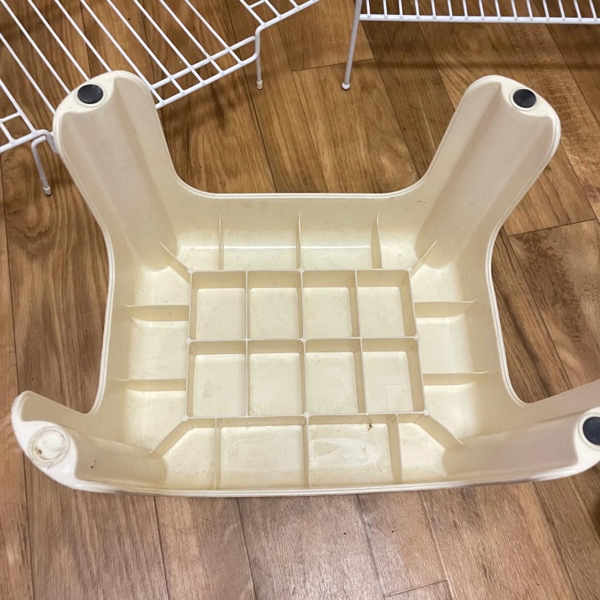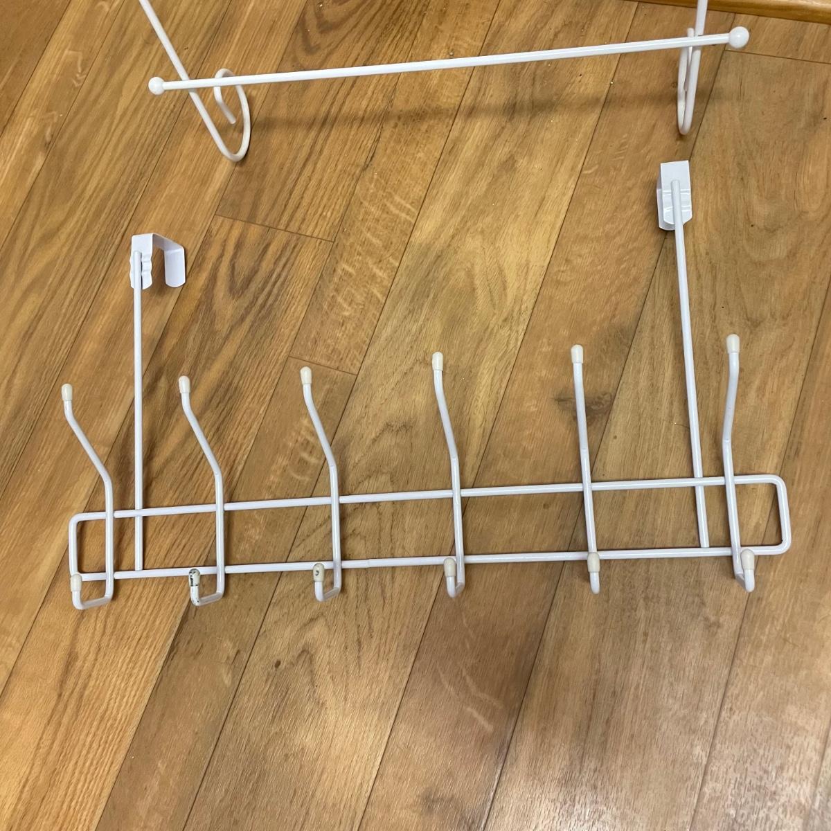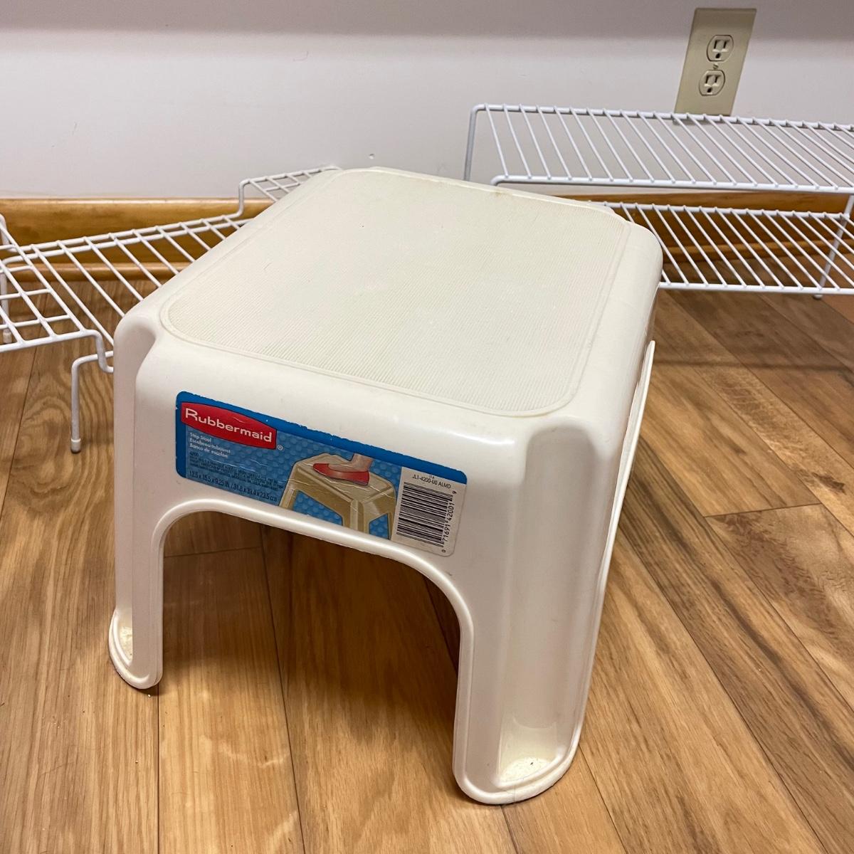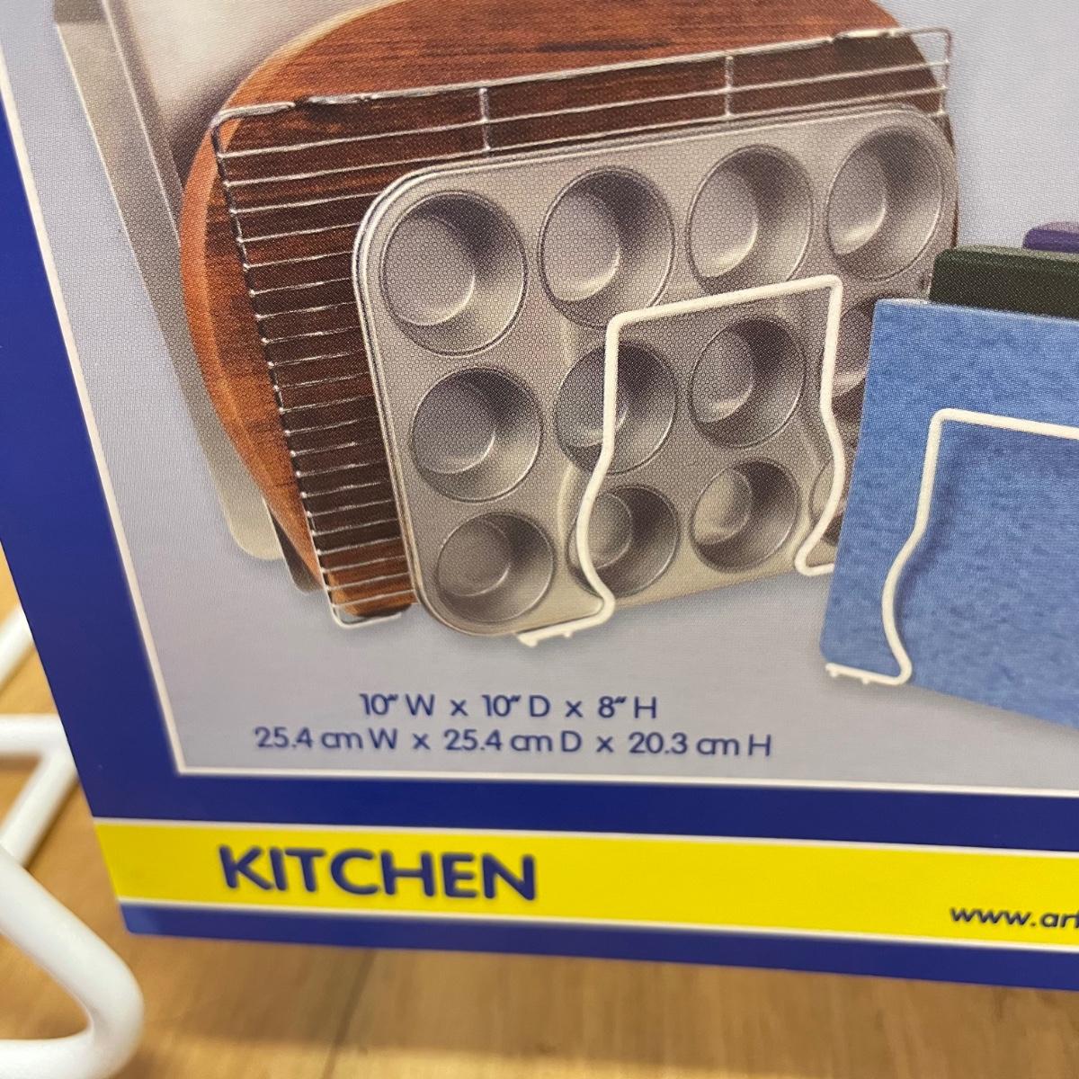 A variety of storage solutions for your home, office or shop. Lot features two over-the-door towel and garment racks, an adjustable cutlery organizer, two two-tier step shelves with packaging intact, perfect for spices or small jars. A rubbermaid stepstool, two vinyl covered racks and three organizer racks, two with original packaging. The long over-the-door towel rack is about 29.5” tall and comes with white metal door hooks so the rack does not stay flush to the door, The cutlery tray without extensions is 12” x 16”, each adjustable side can add up to 6”. Other known measurements are shown in photos. Local pick up only.