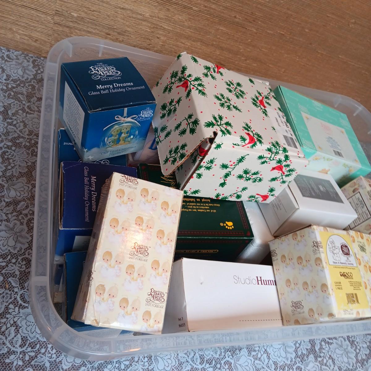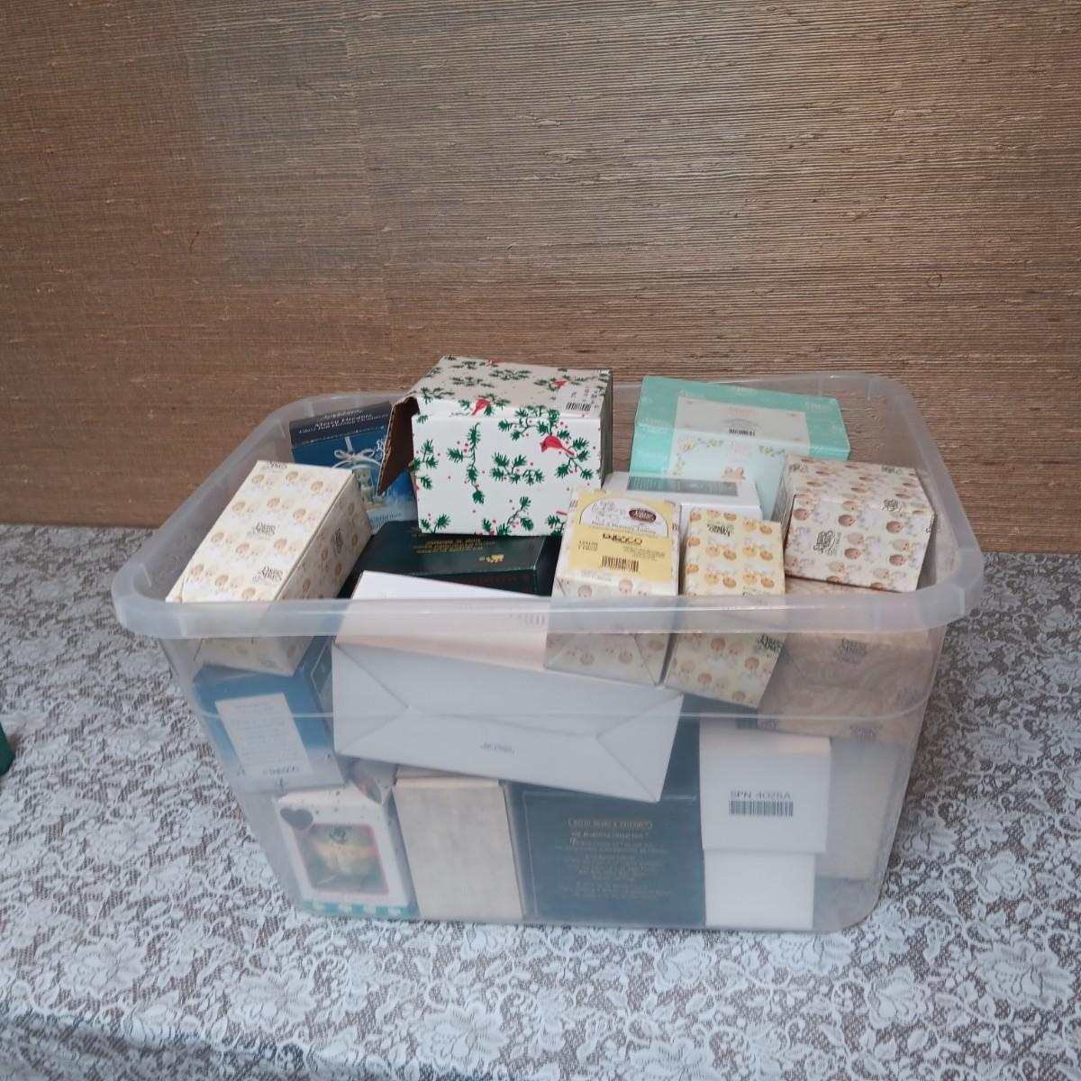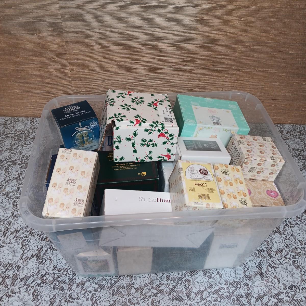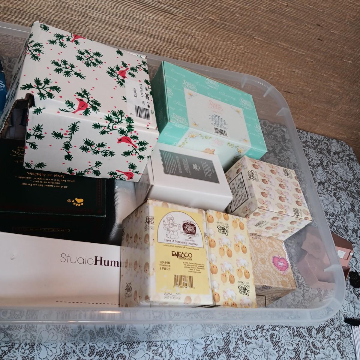 STORAGE TOTE FULL OF MOSTLY PRECIOUS MOMENTS AND CHERISHED TEDDIES
