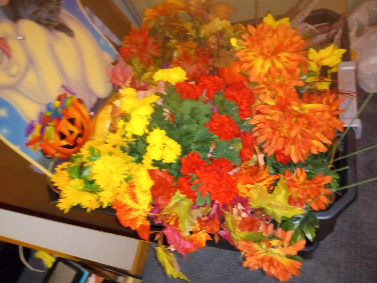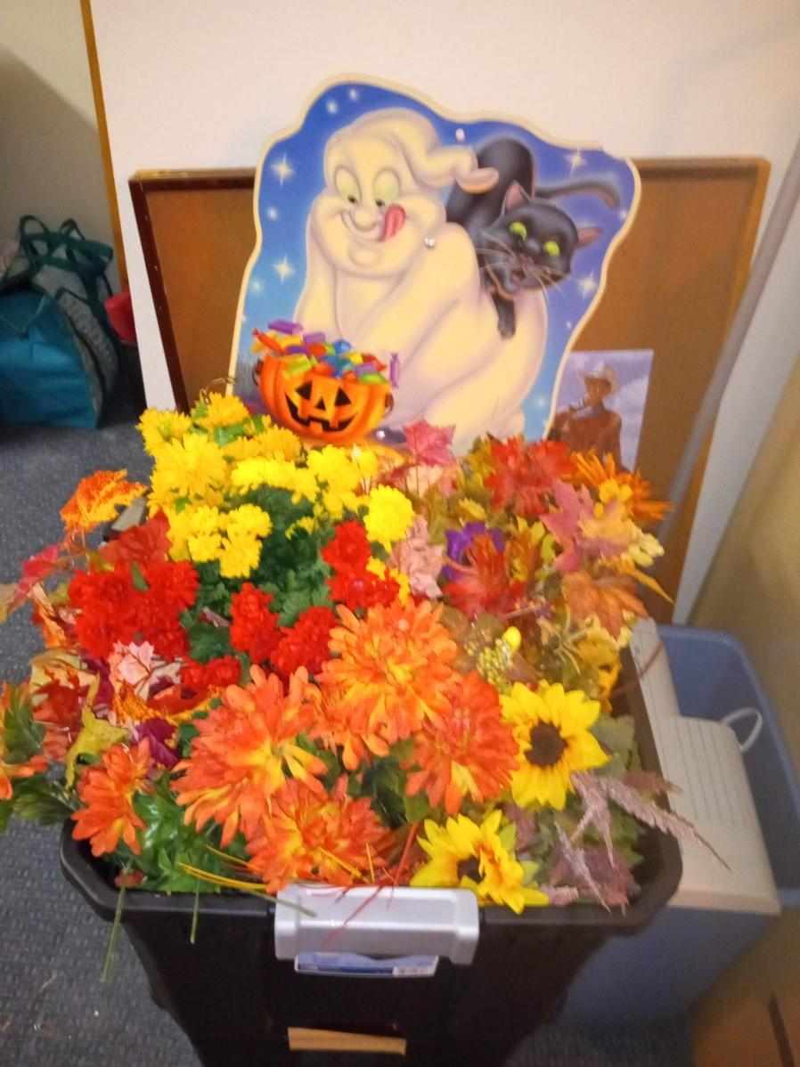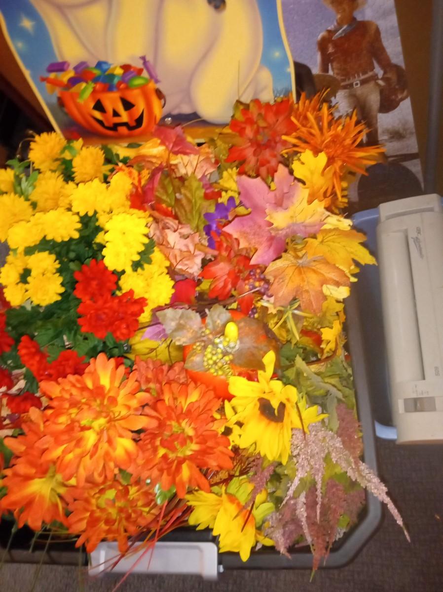STORAGE TOTE FULL OF FALL FLOWERS AND FOLIAGE