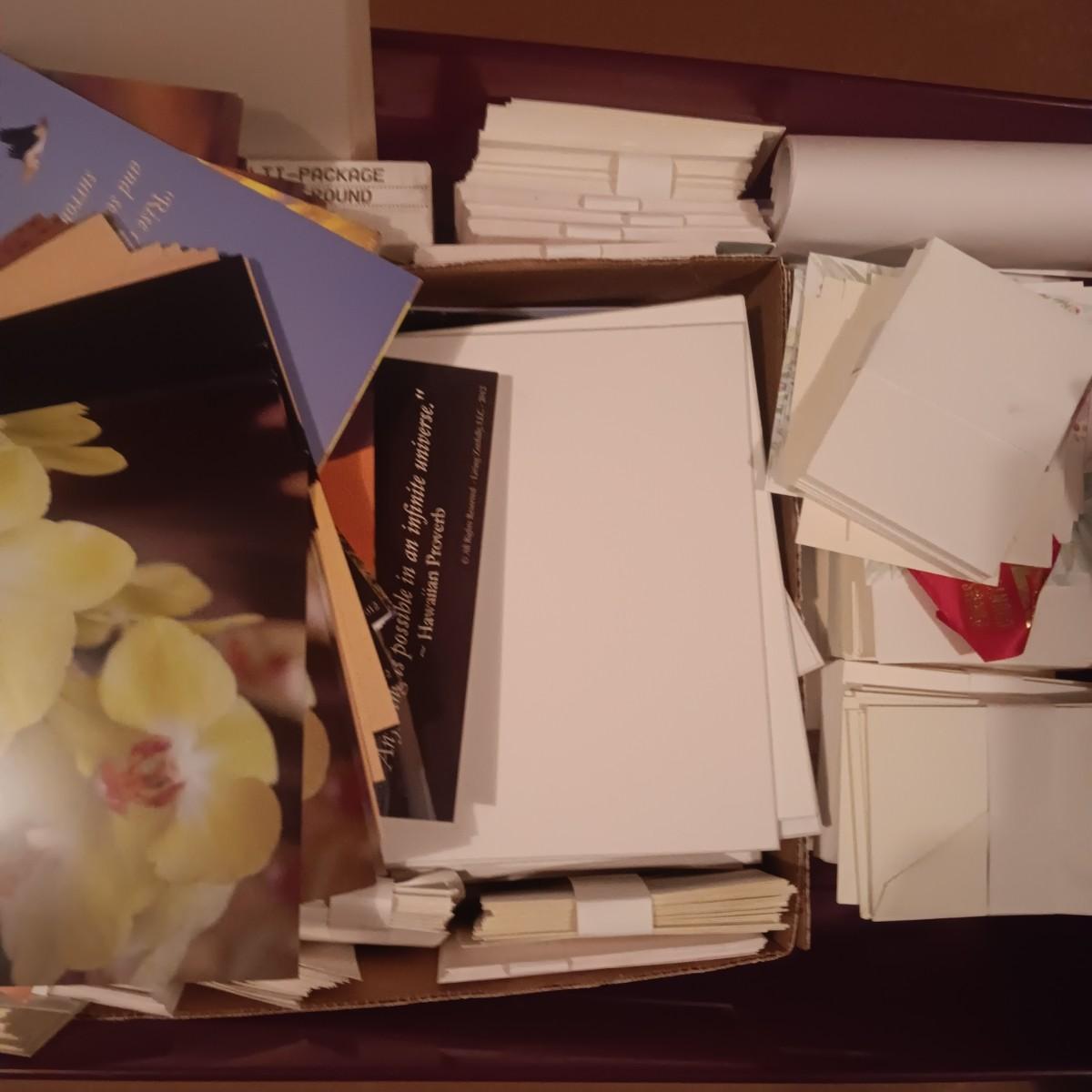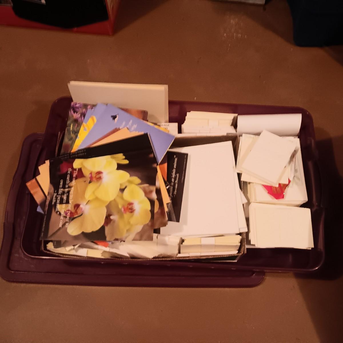 STORAGE TOTE FULL OF STATIONARY, GREETING CARDS, ENVELOPES AND MORE