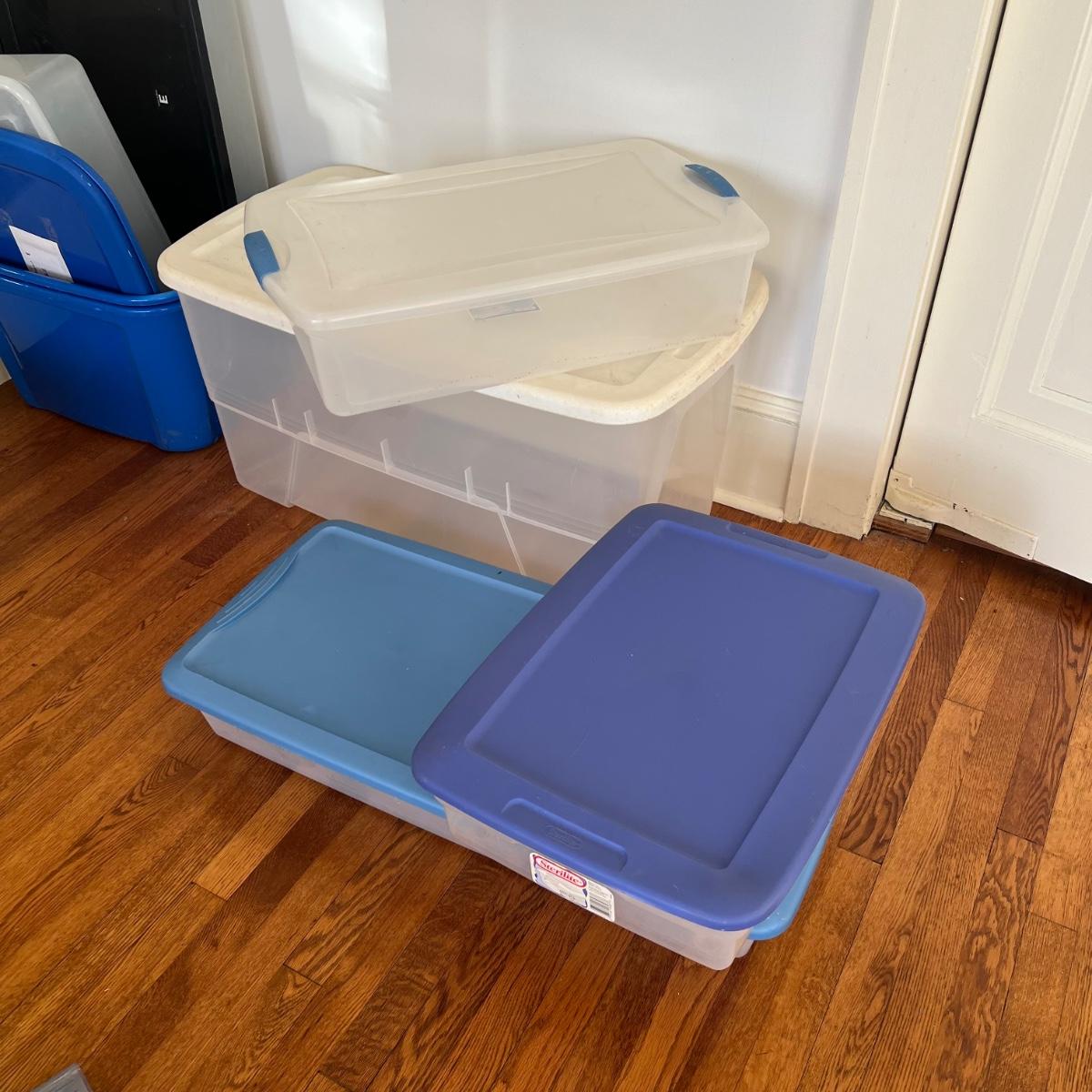 11 tubs including one that rolls for under the bed storage. See pics for full inventory and sizes. Blue tub has an extra lid.