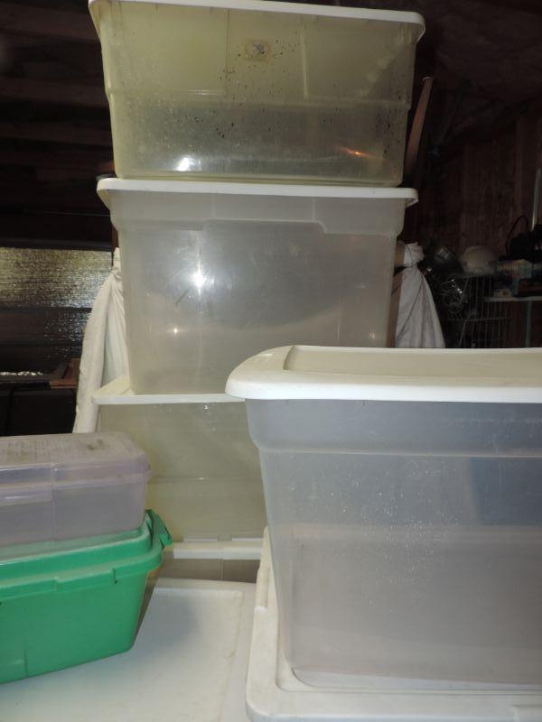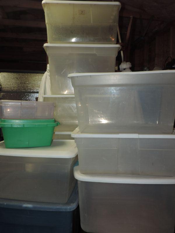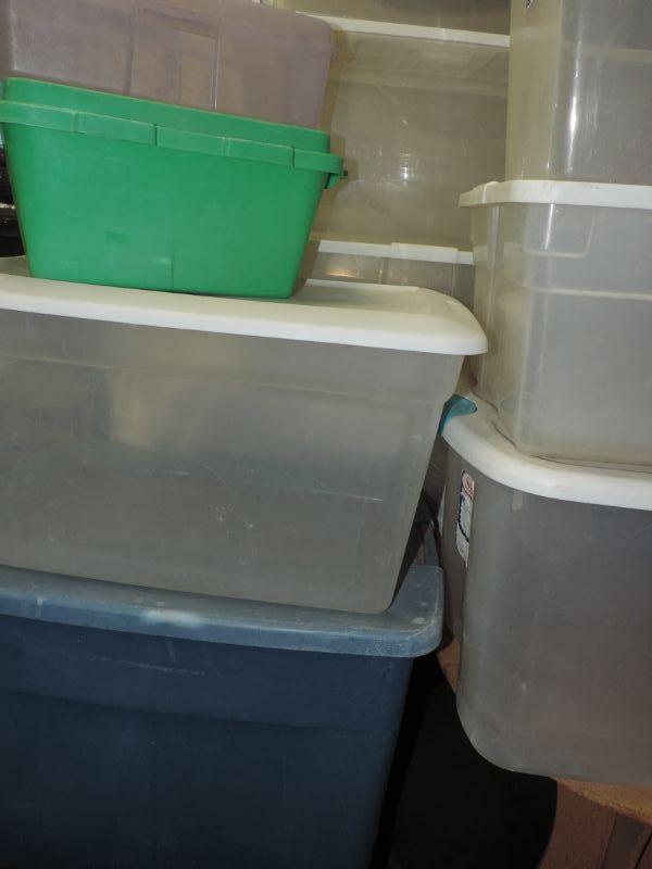 TUBS MOSTLY CLEAR, A COUPLE RUBBERMADE (NOT CLEAR) AND A COUPLE SMALLER ONES ,ALL WITH LIDS