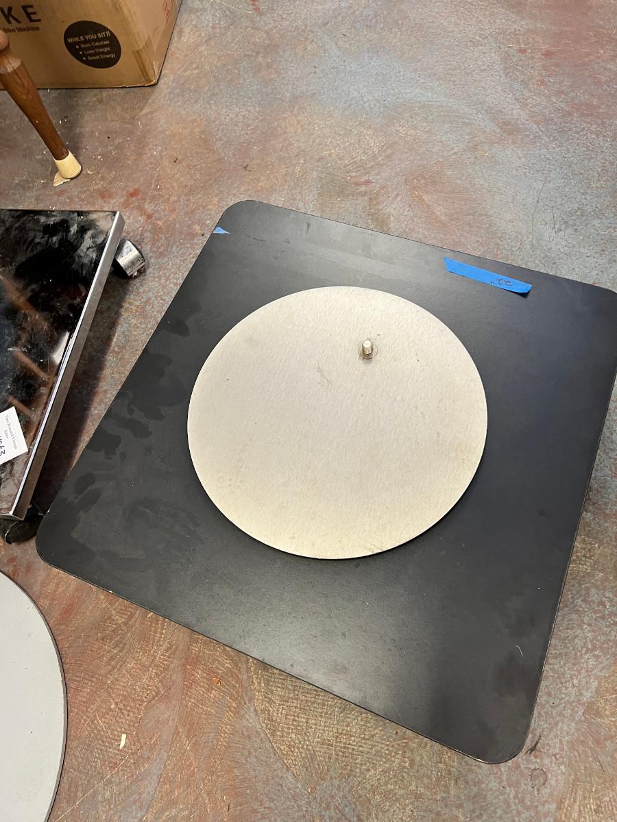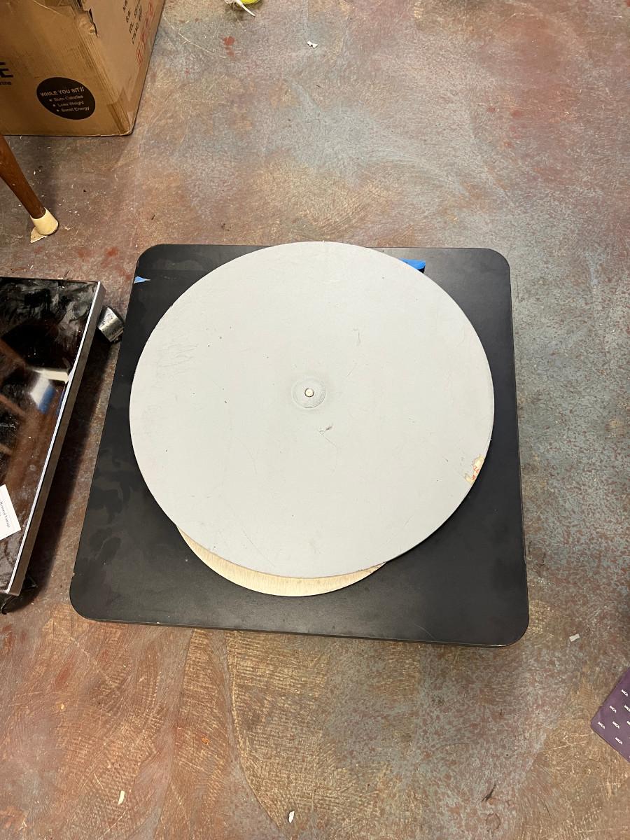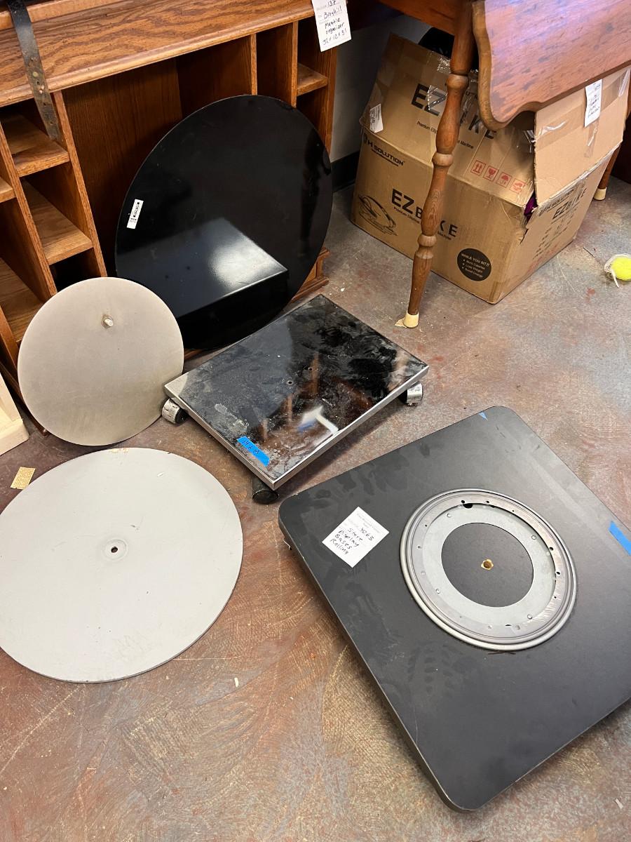 2 Movable stands both heavy. The larger features a turntable where you might fit the large circular plate on the smaller plate has a screw to place the mannequin on. the rectangle stand breaks into a top and bottom you get the black IKEA circular plate as well.. No shipping