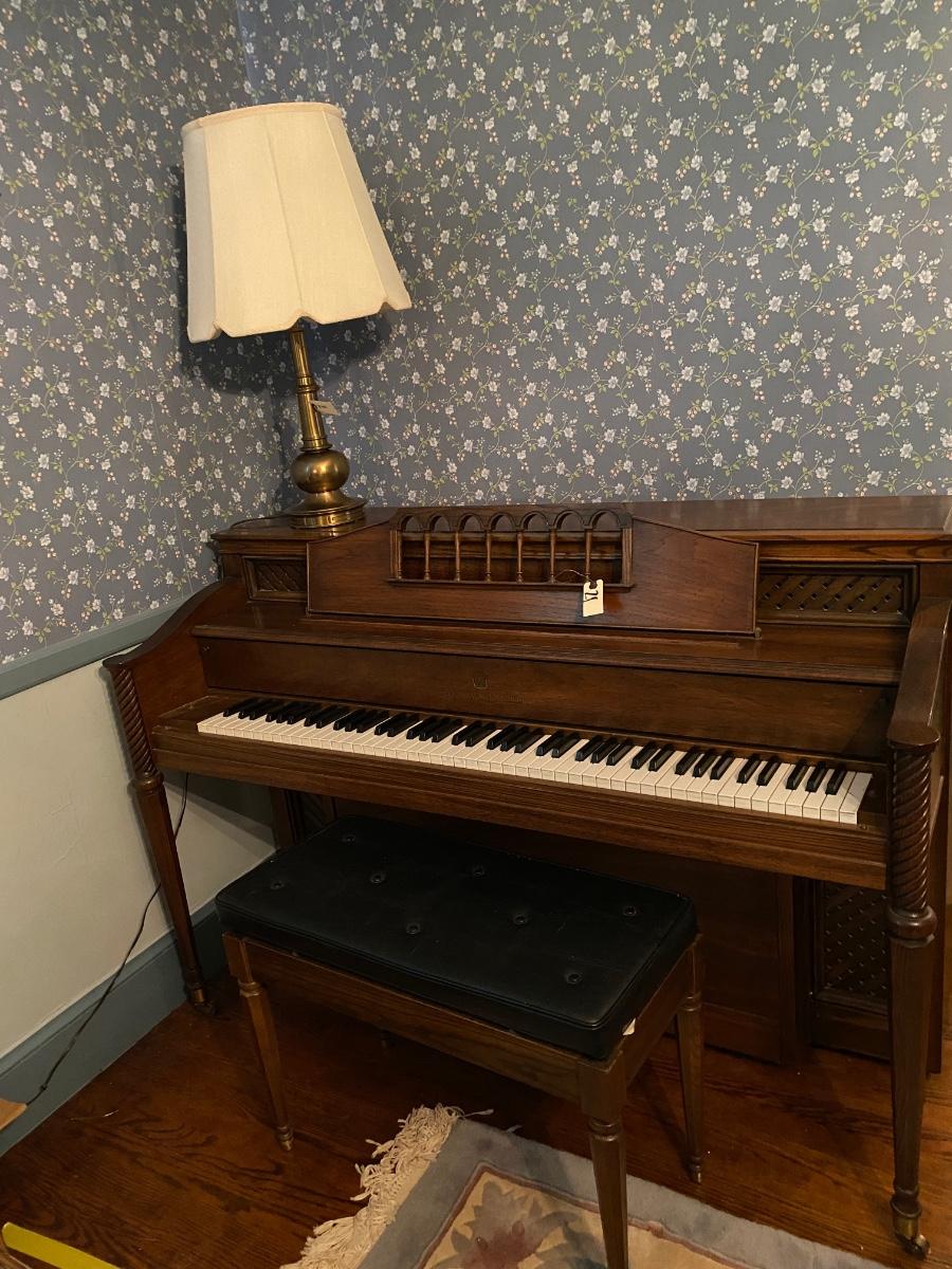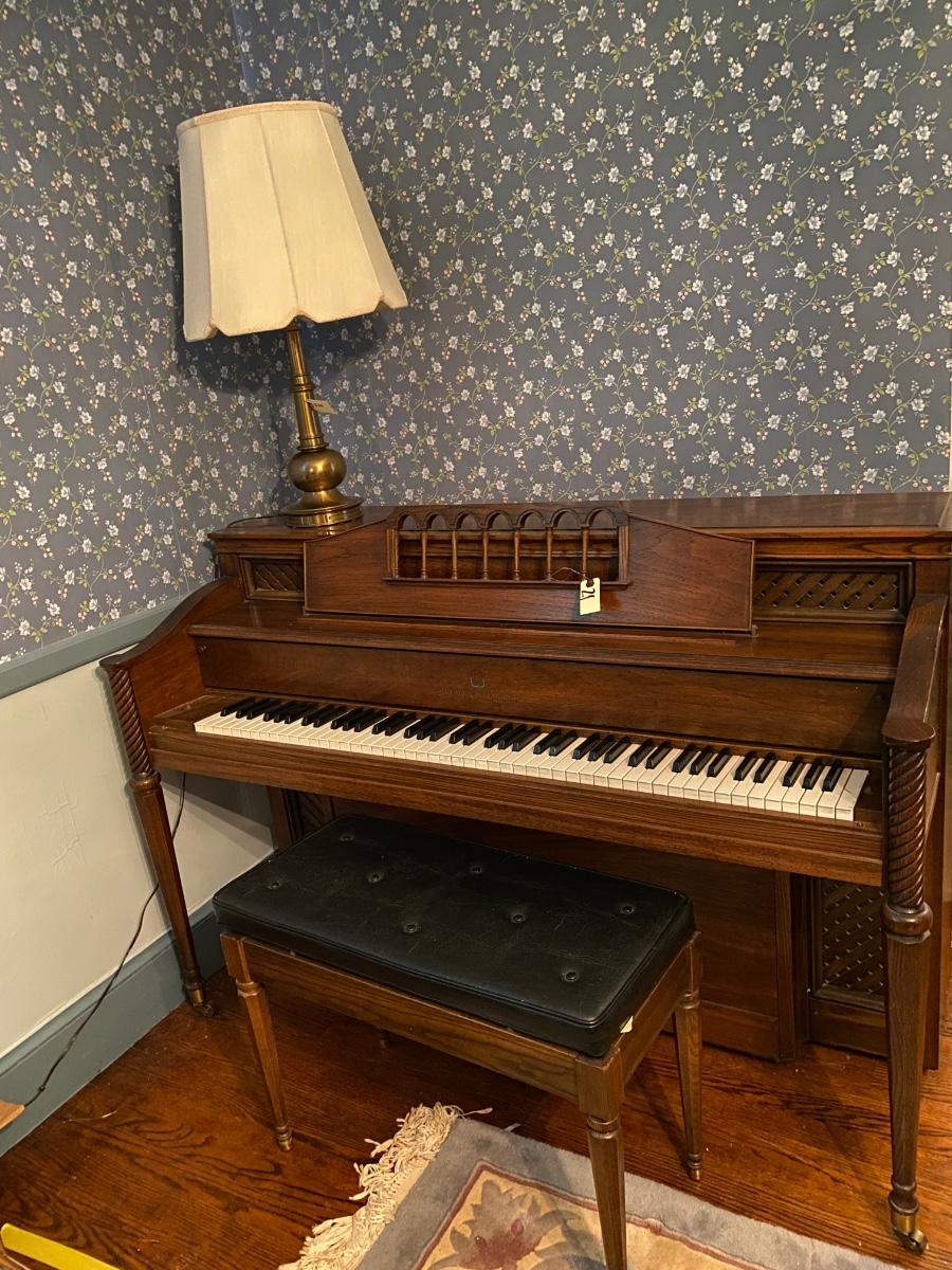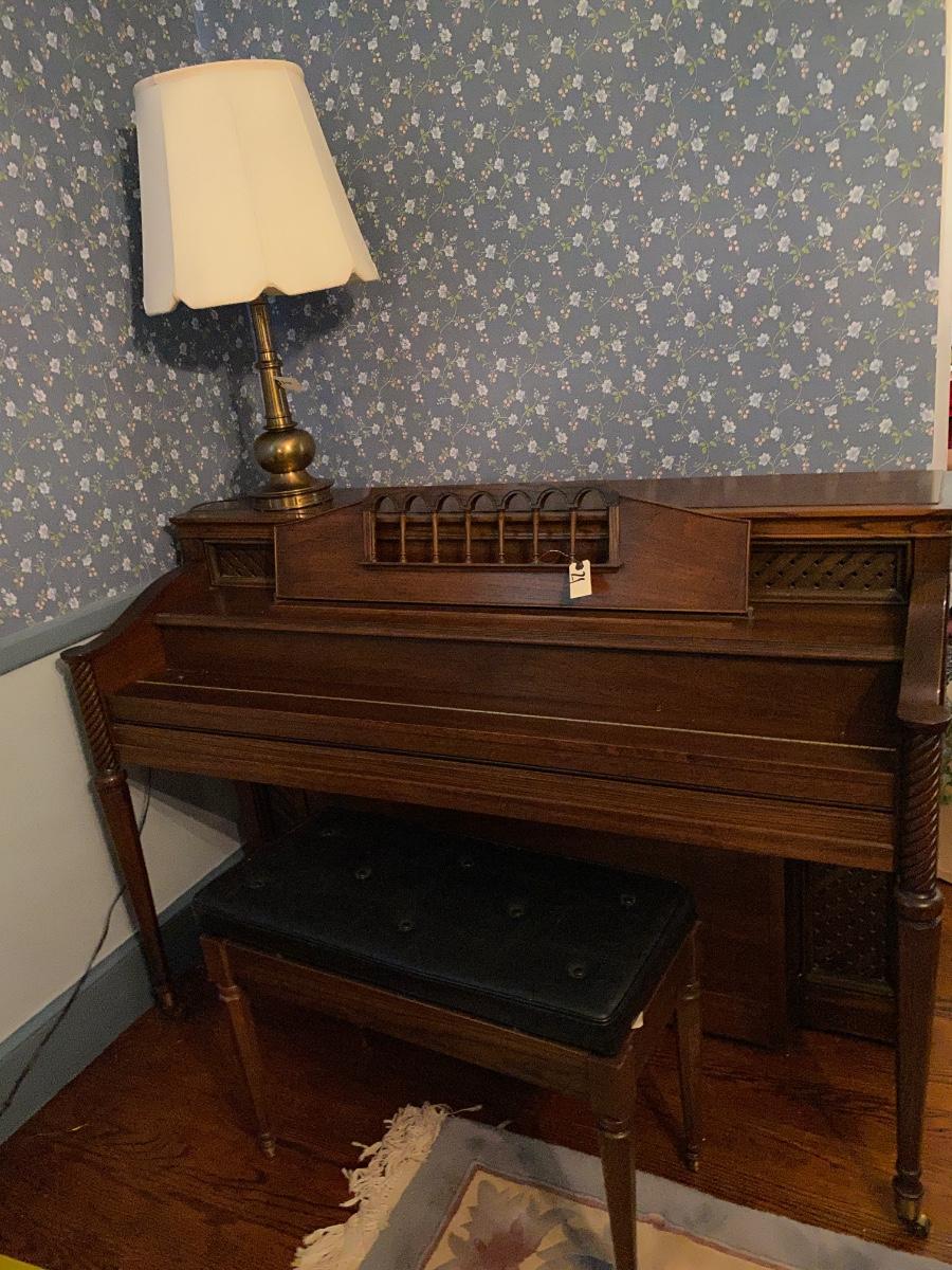 Story and Clark Pecan Wood Upright Piano includes Stool and 30" Tall Brass Lamp