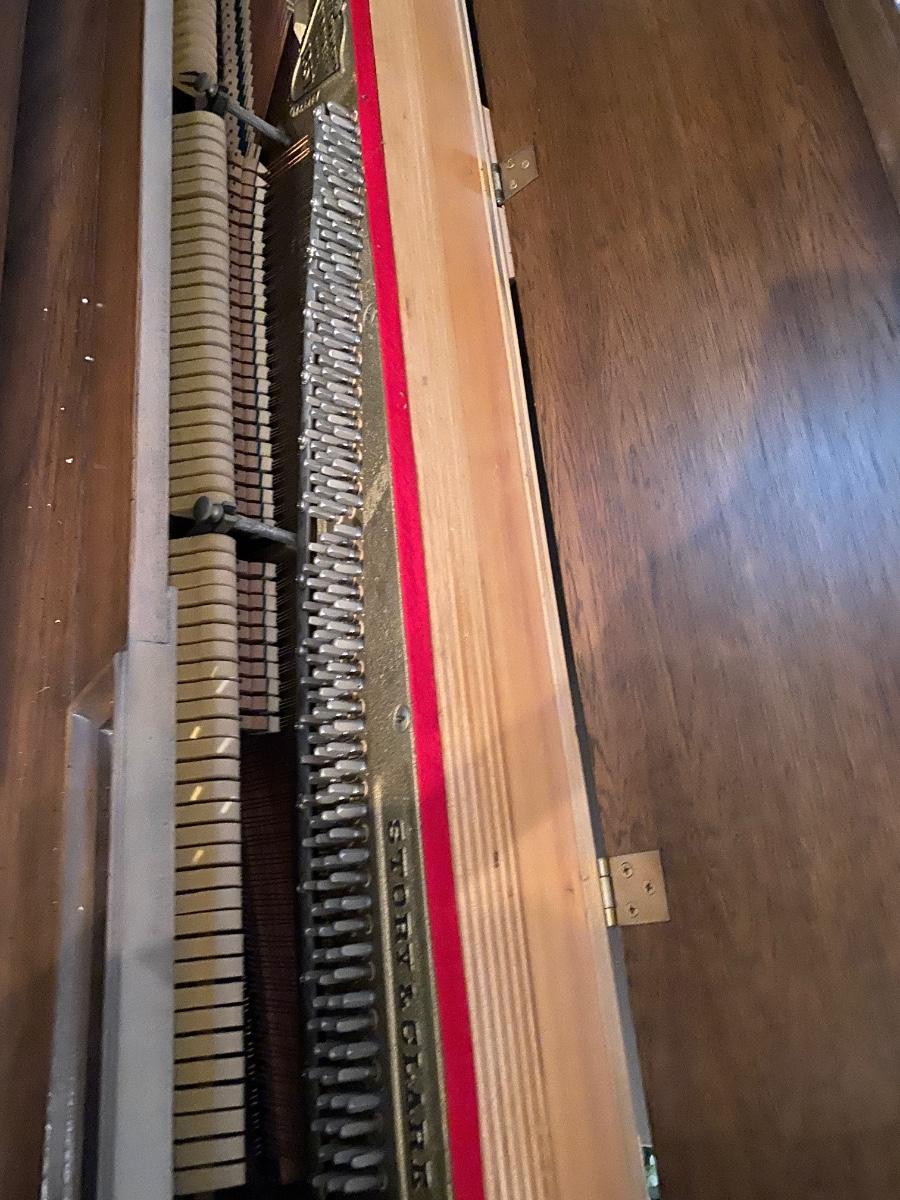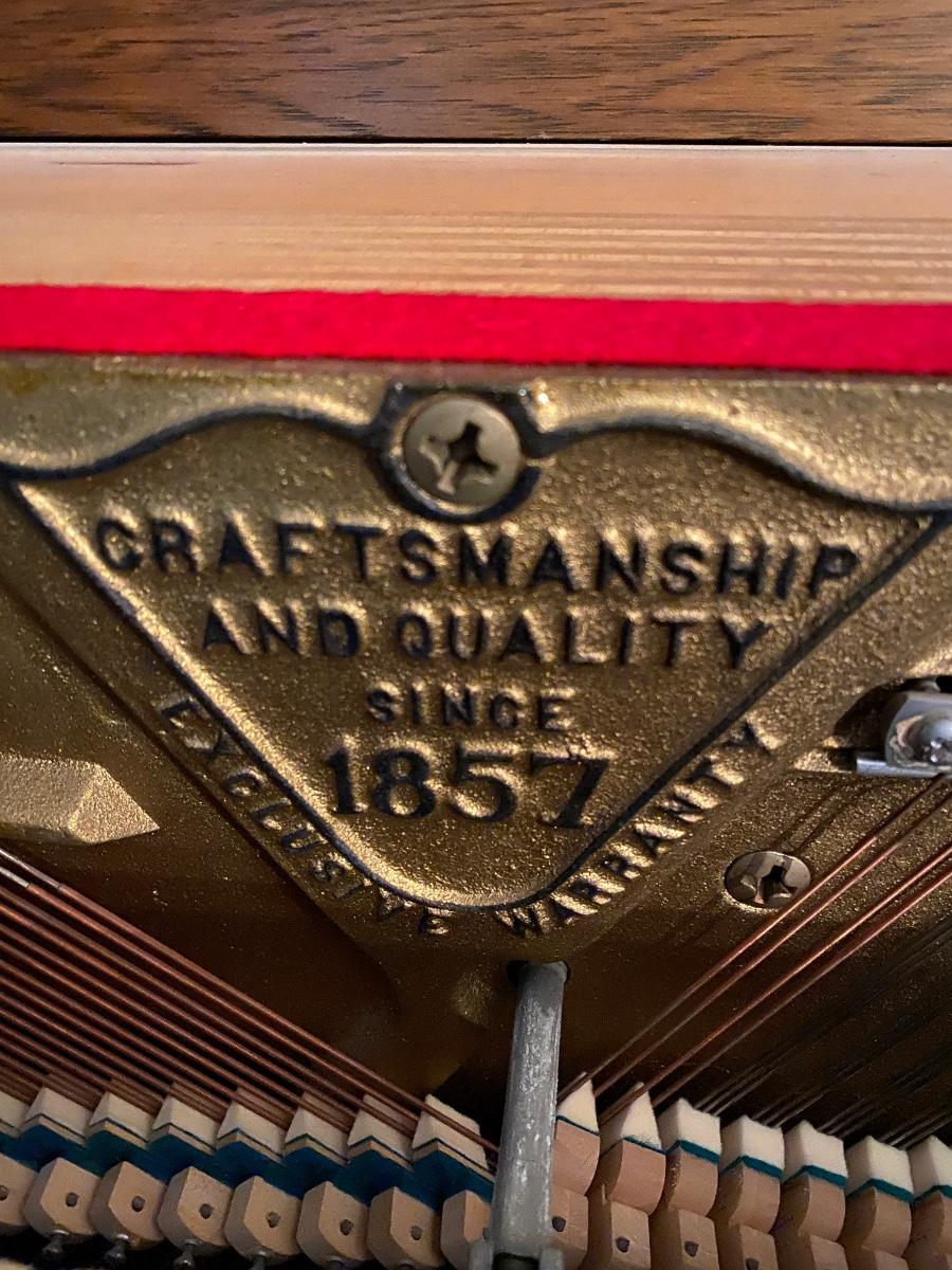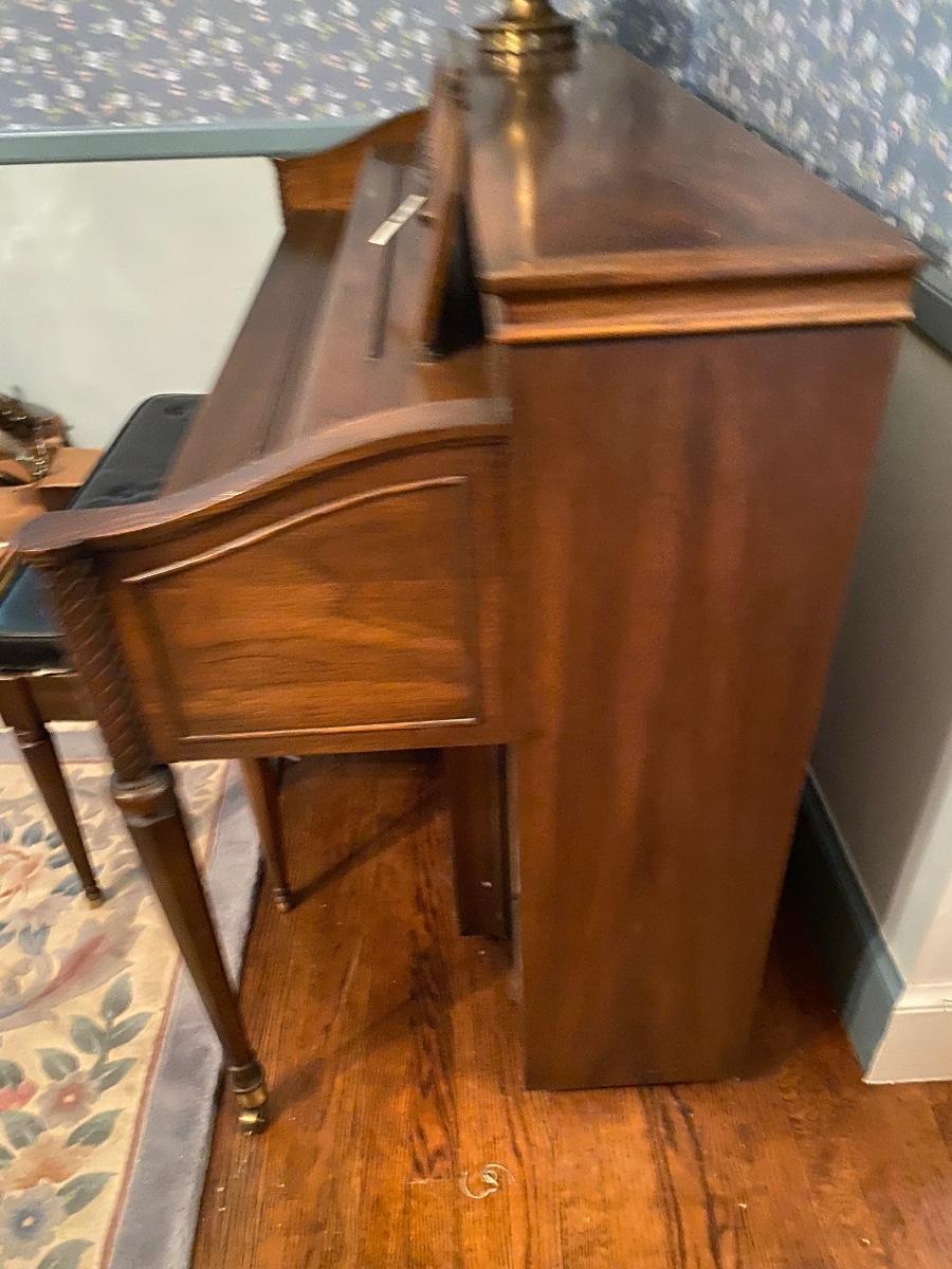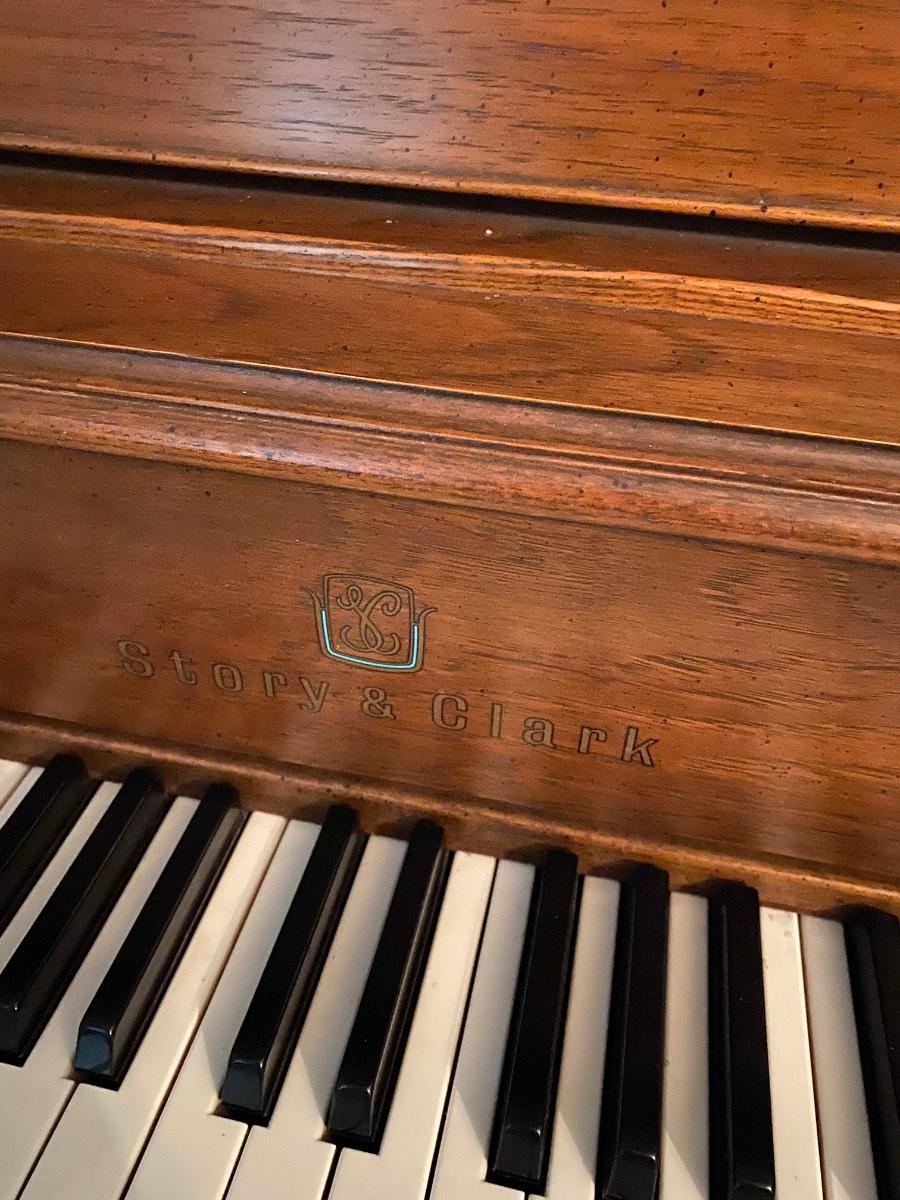 Story and Clark Pecan Wood Upright Piano includes Stool and 30" Tall Brass Lamp