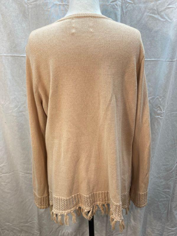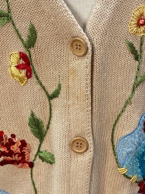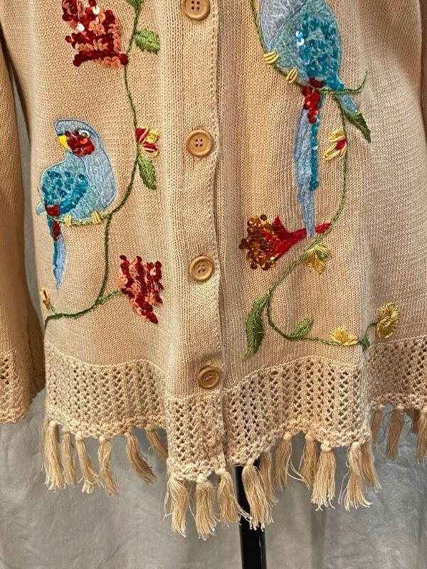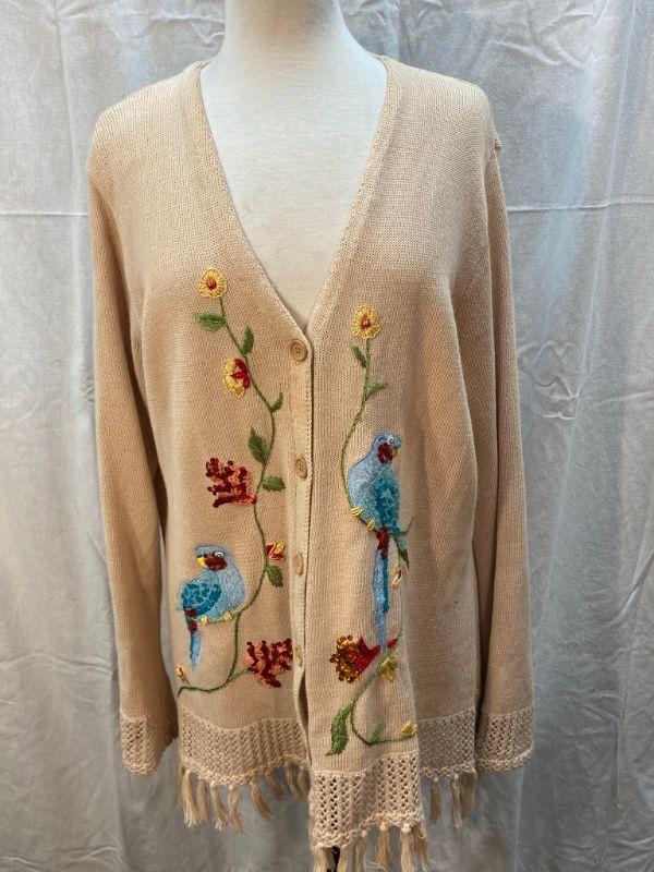 Storybook Knits parrot cardigan sweater. Light beige/ cream color. Button down front. Fringed hem. Good condition. Size Large.