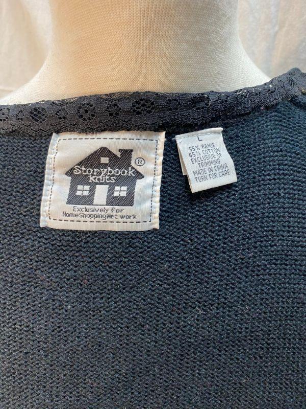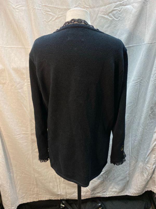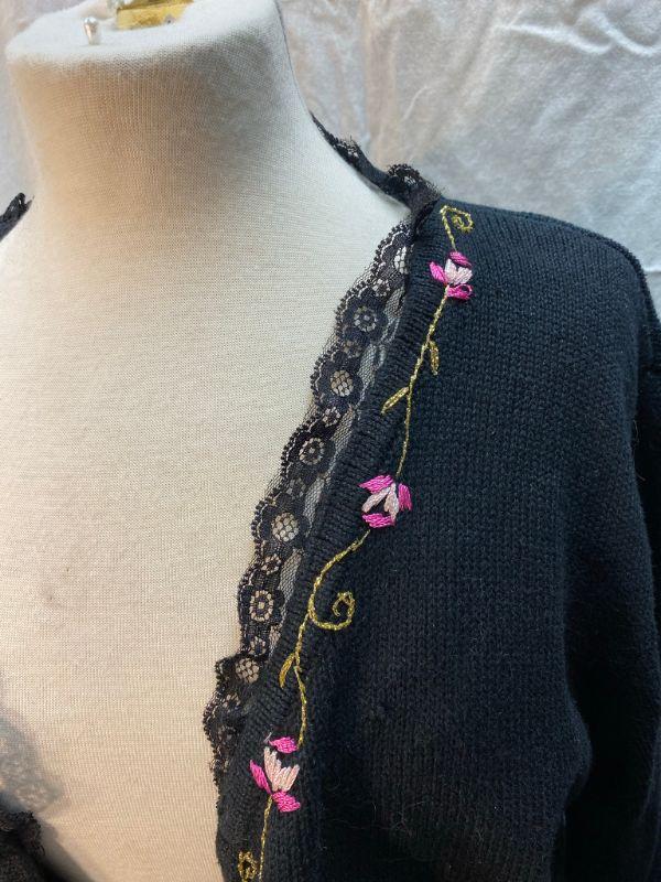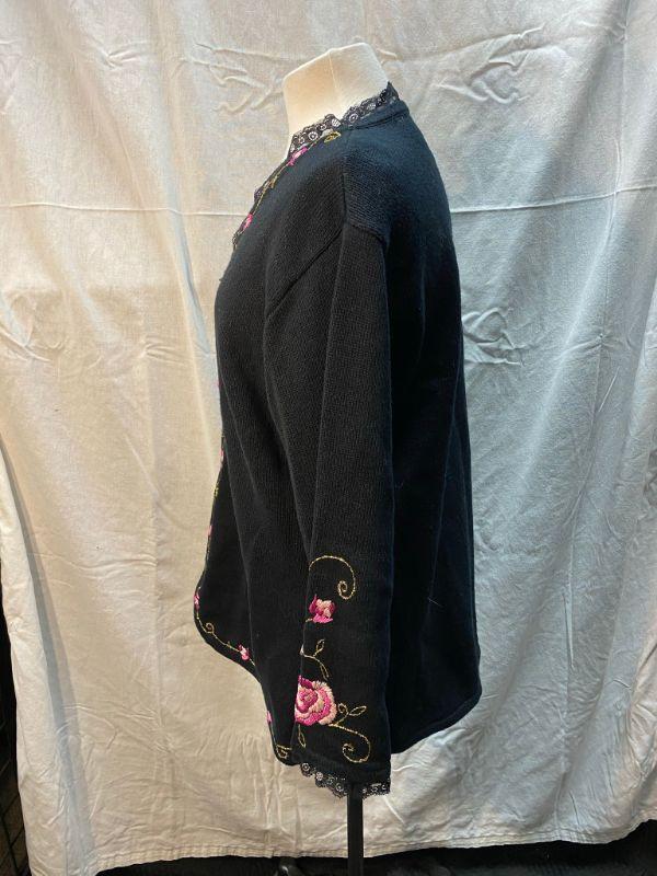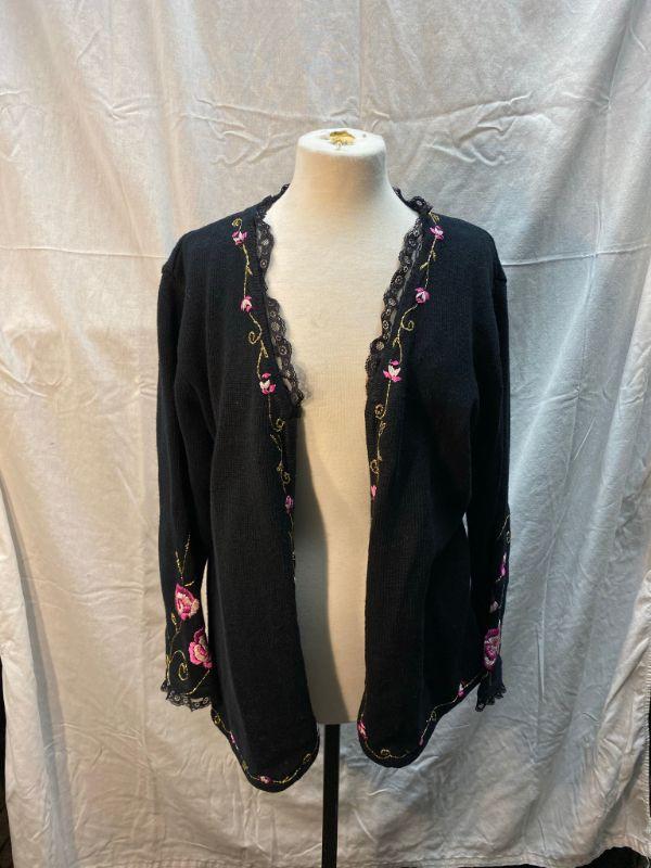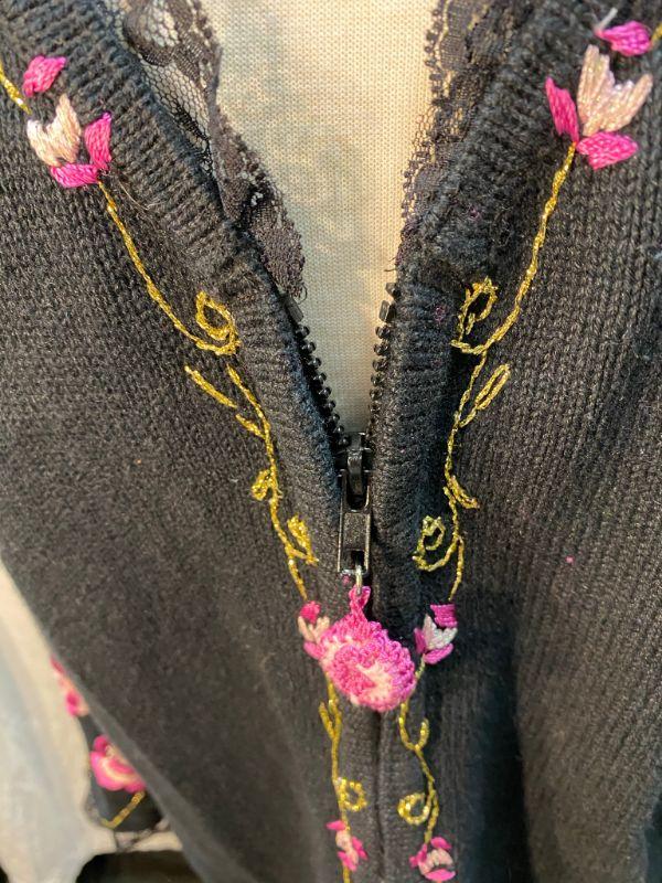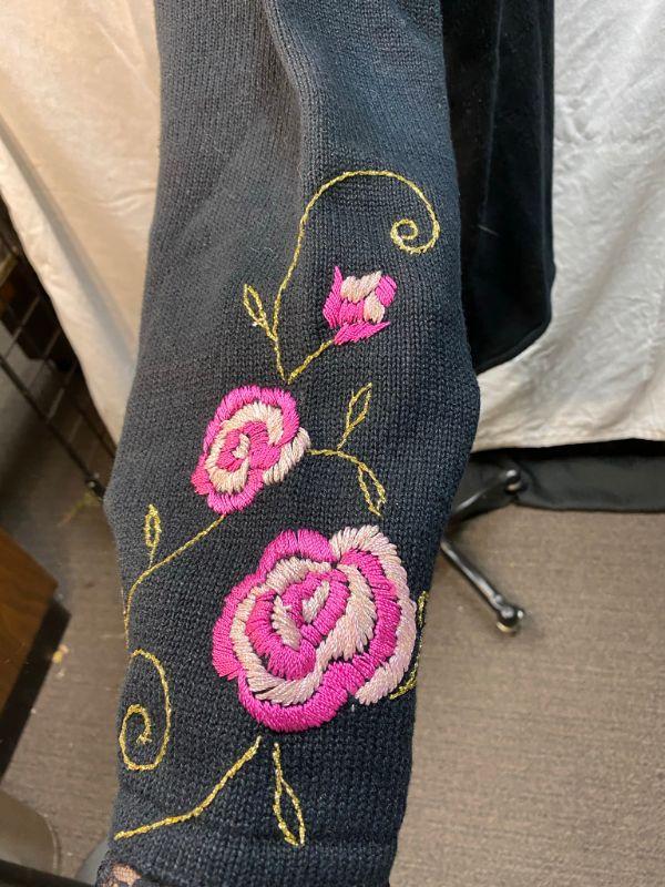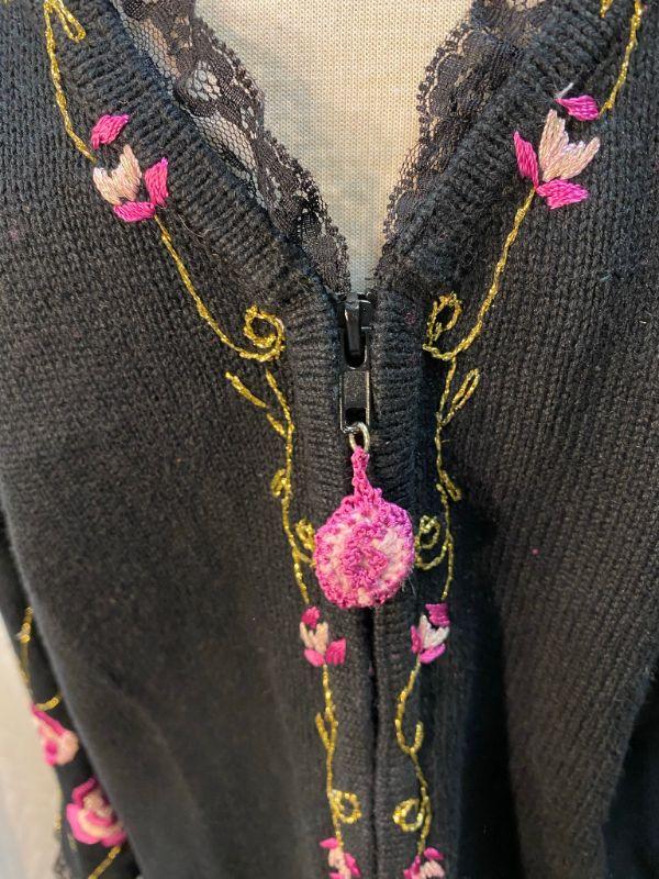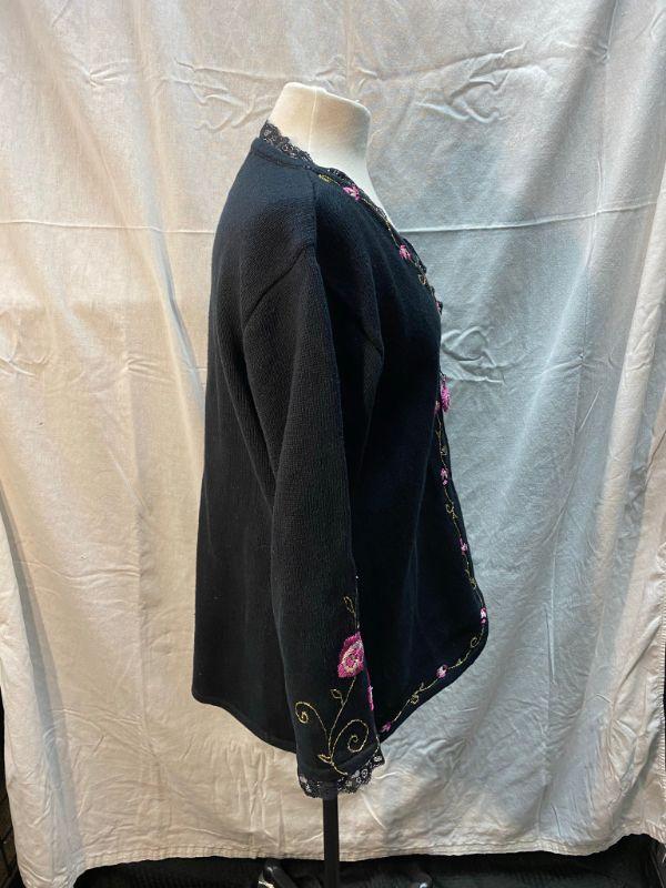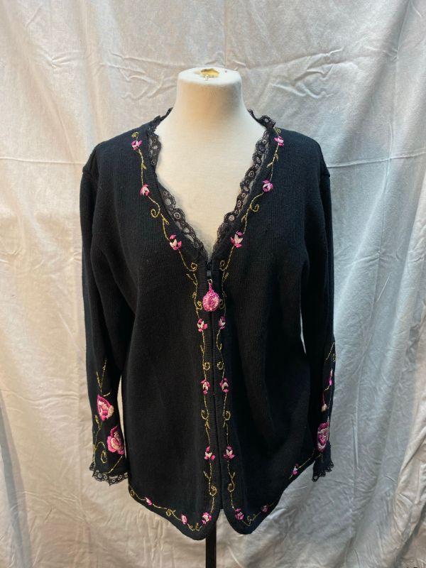 Storybook Knits black zip front cardigan sweater. Pink floral embroidery detail added around edging and on sleeves. Good condition. Size Large.