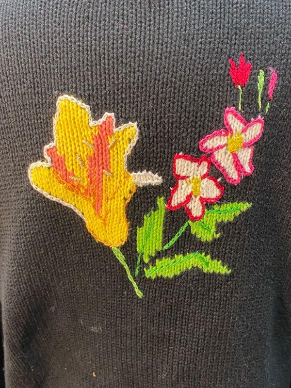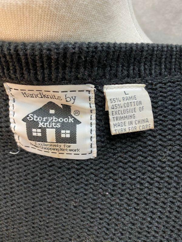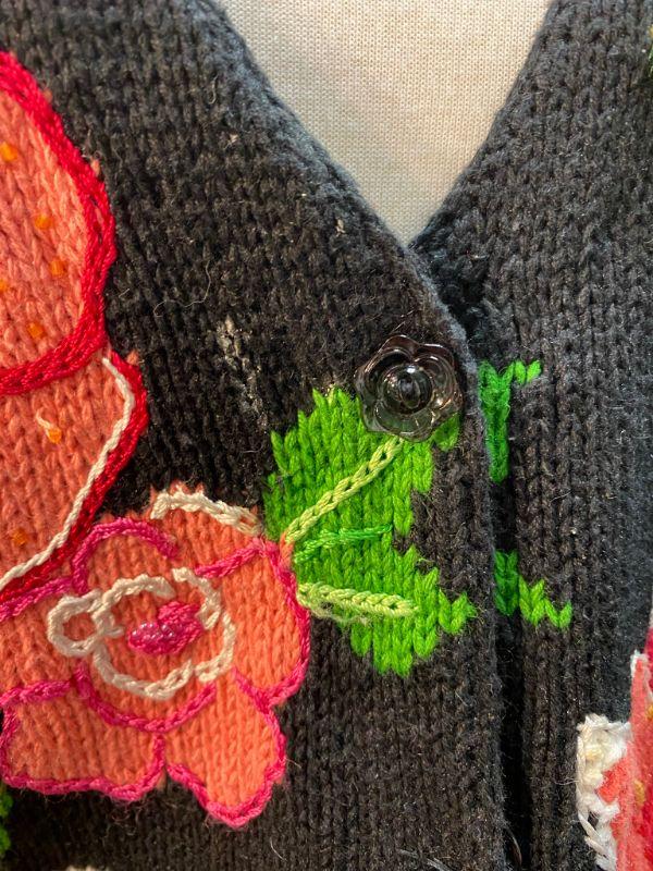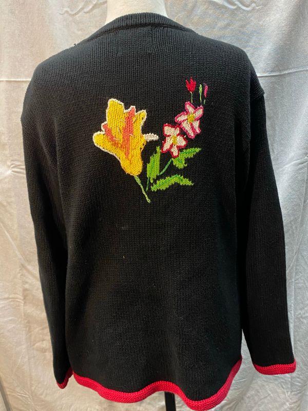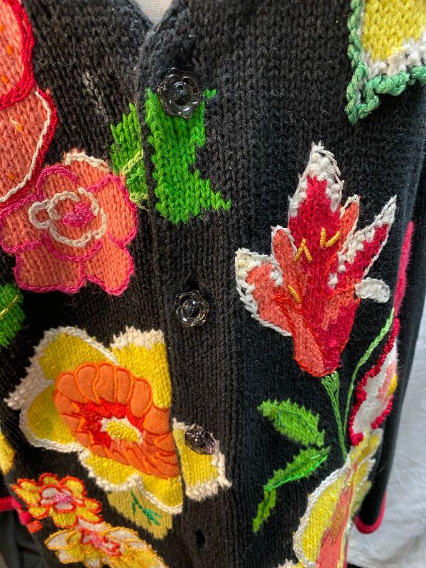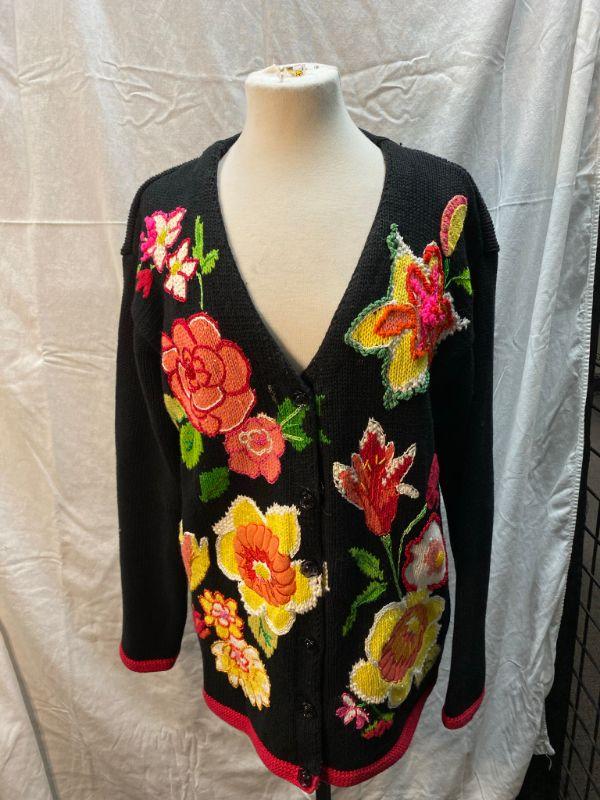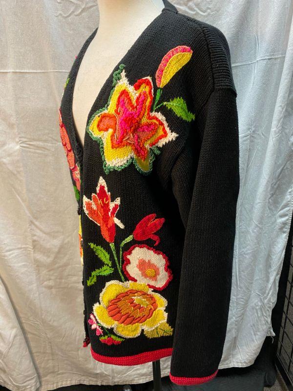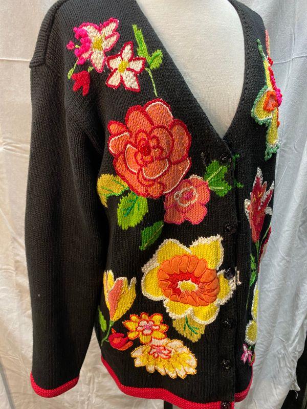 Storybook Knits Button Front Hand Knit Floral Black Sweater Cardigan Size Large YD#020-1220-02008
