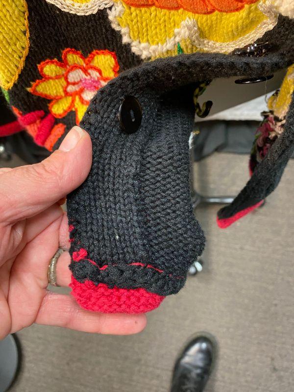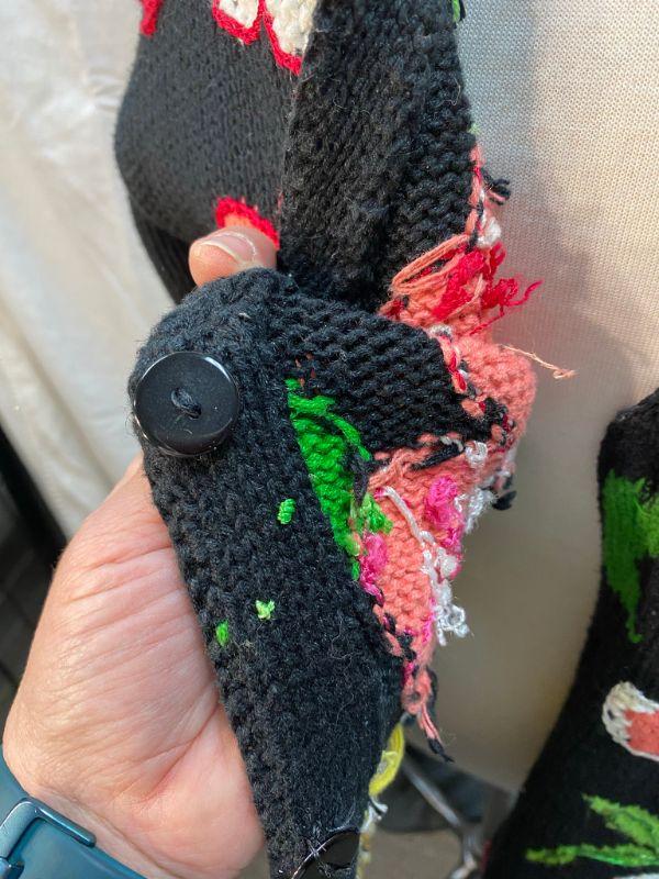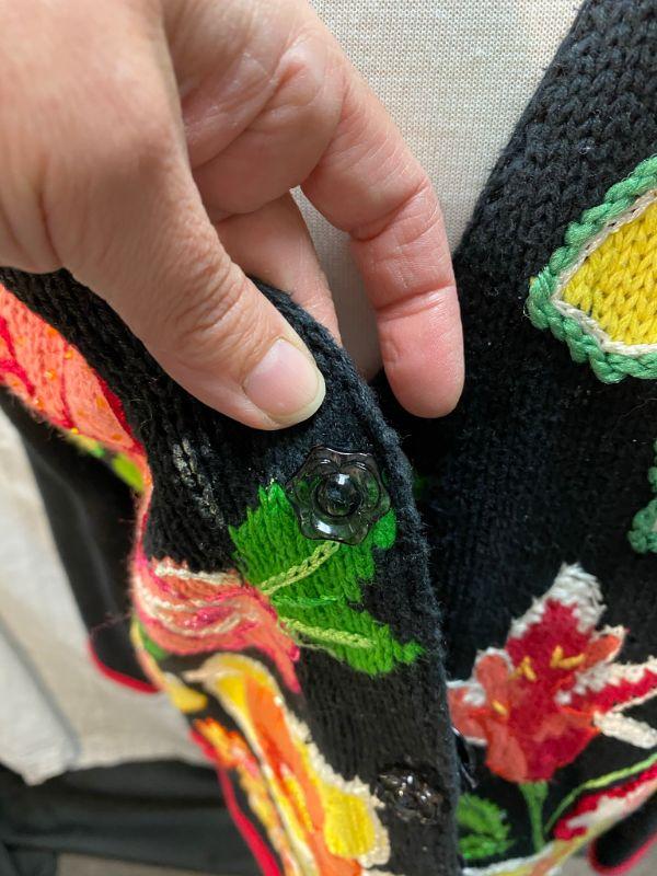 Black floral cardigan from Storybook Knits. Flowers in pinks, oranges, and yellows. Has hidden inside buttons along with decorative flower shaped outer buttons. Back has a flower design on it as well. Small spill near top button, looks to be on surface and may come out in the wash. Size Large.