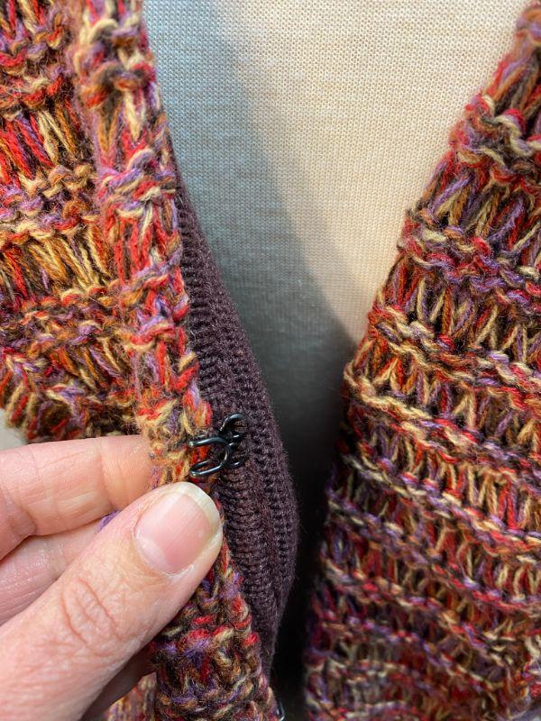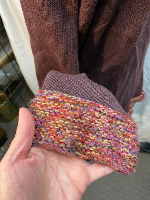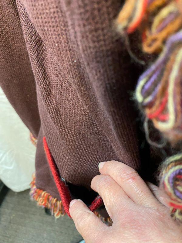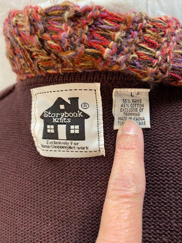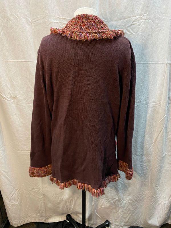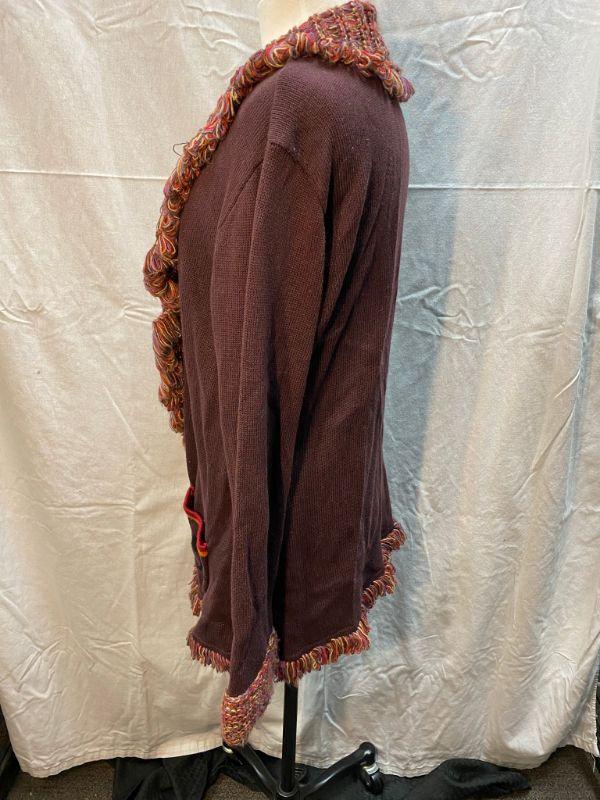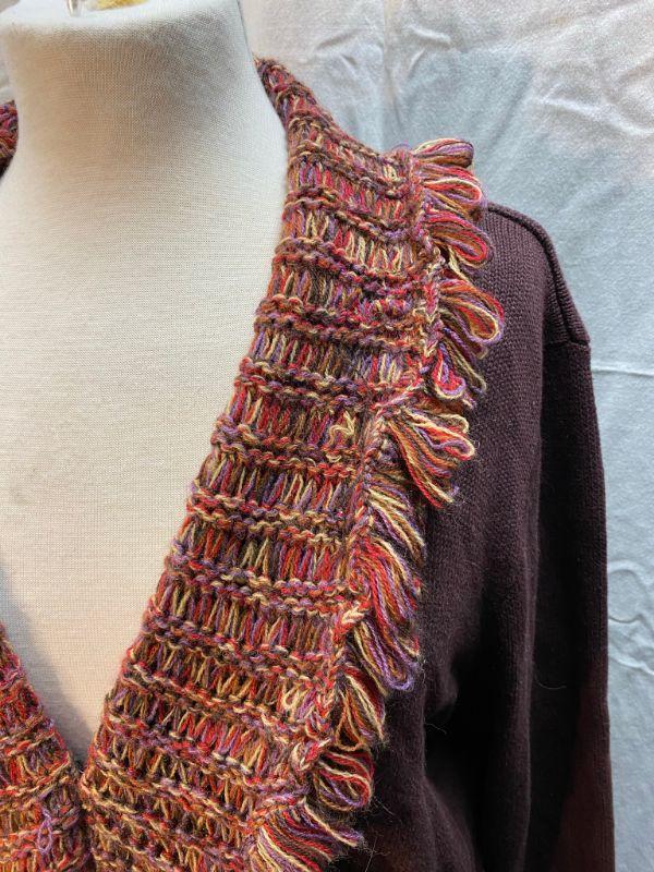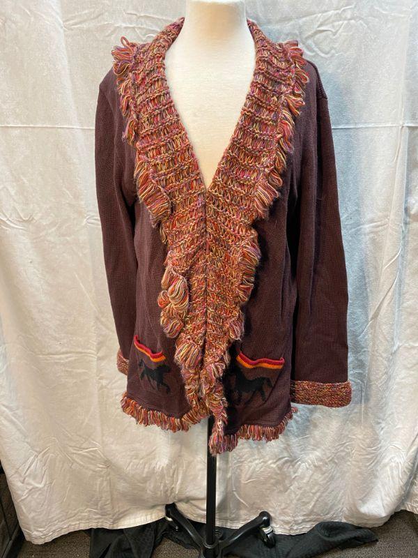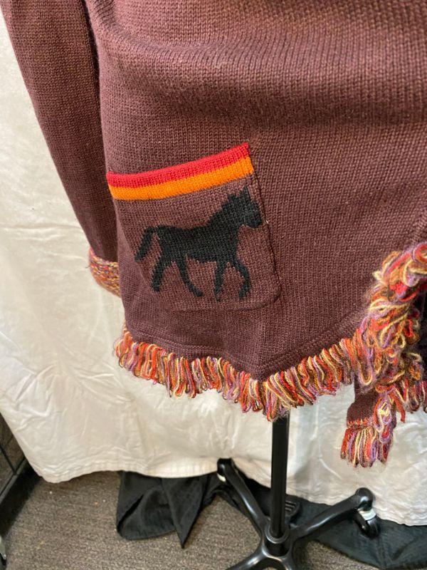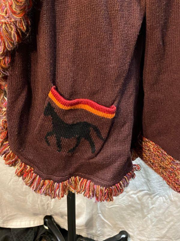 Storybook Knits multicolored fringe cardigan sweater. Brown with front pockets. Pockets have horse silhouettes on them. Single hook and eye closure. Good condition. Size large.